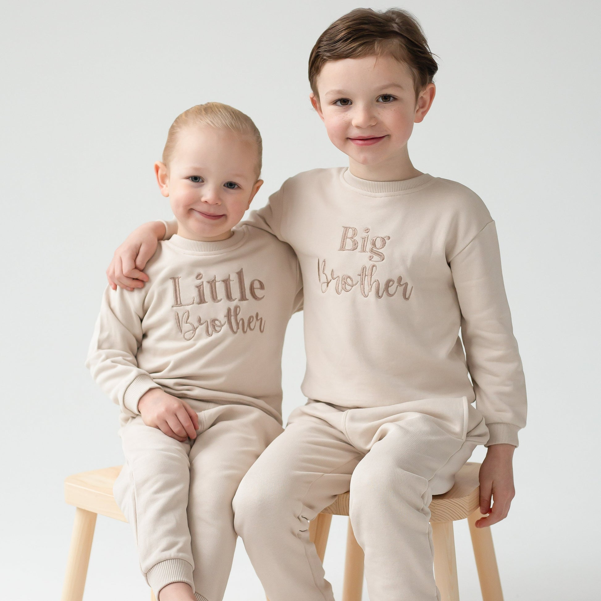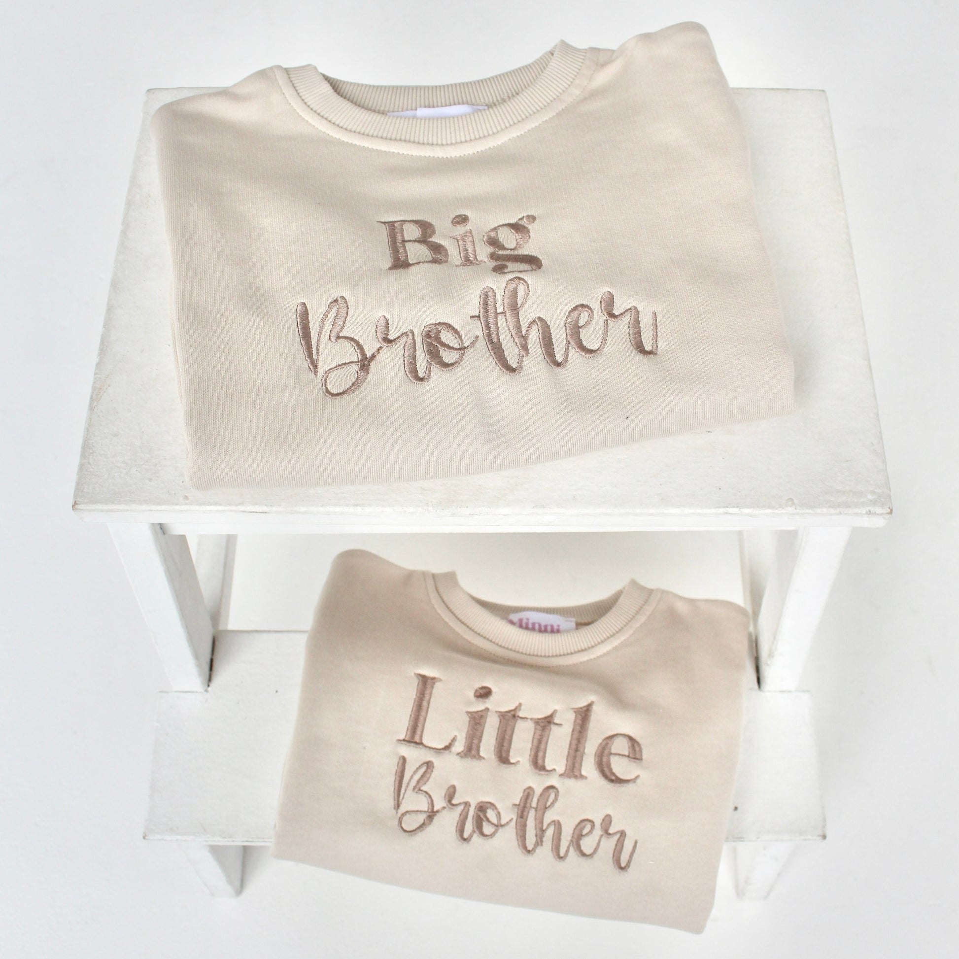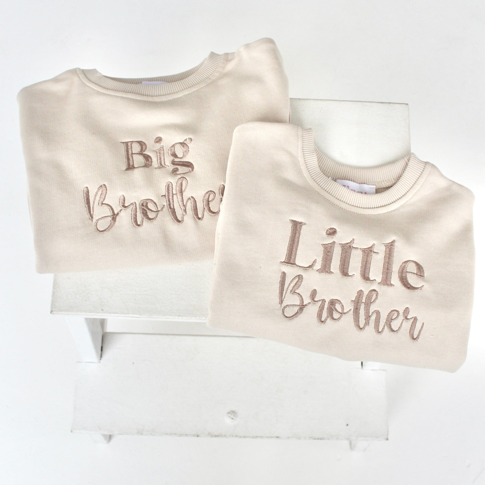 Style siblings up in these matching embroidered sweatshirts. Select from 'Big/Little' before adding product to cart. This is the brother sweatshirt, sister sweatshirt is also available. Models wear stone with copper thread but there are a range of colours available. We have designed a babygro to match also so we have all ages covered!