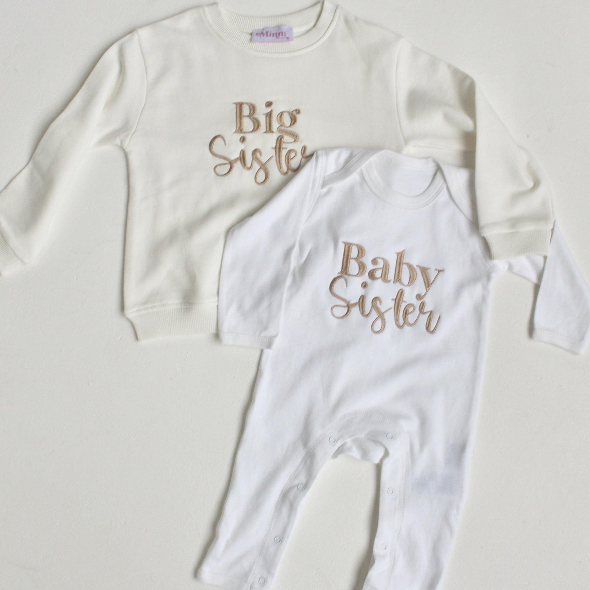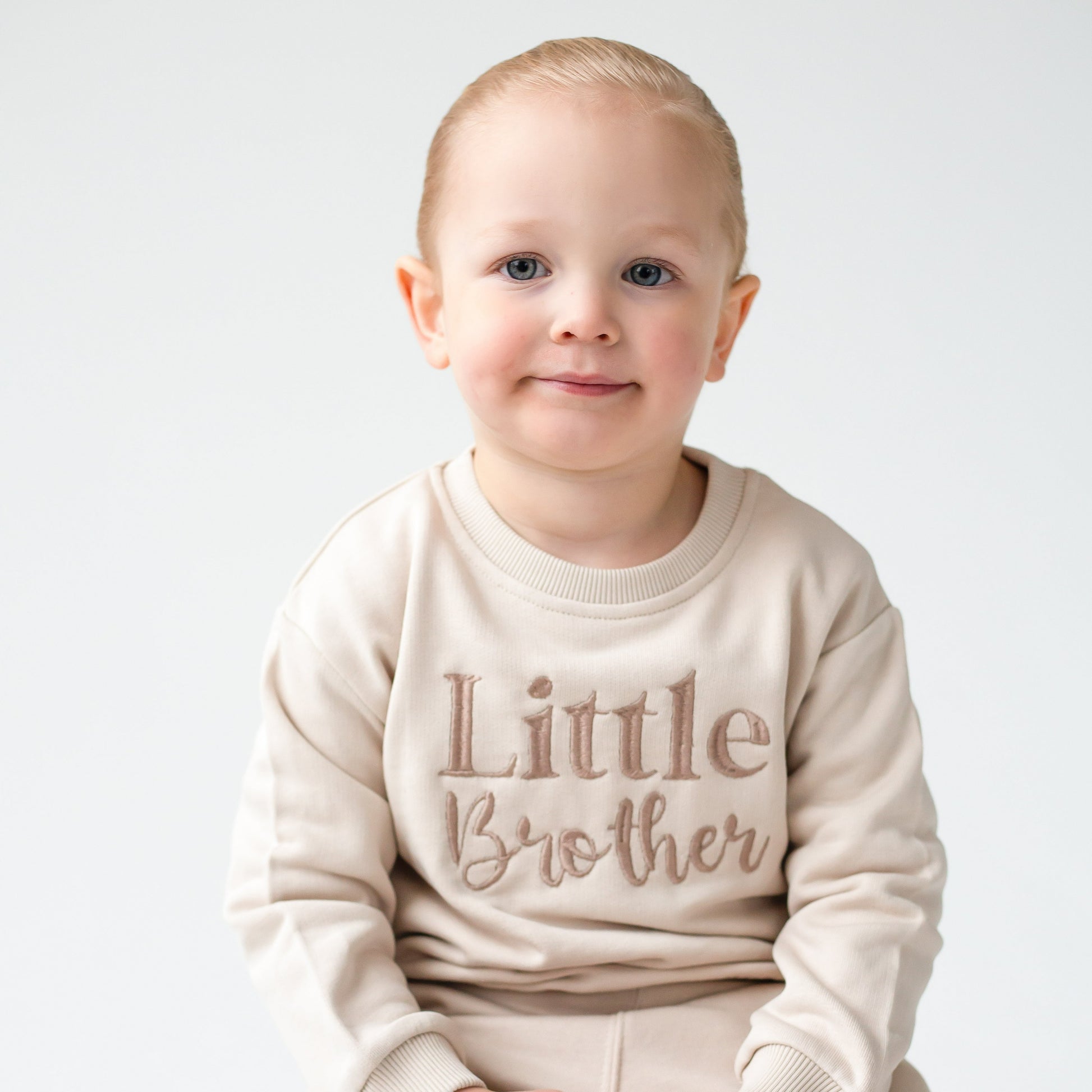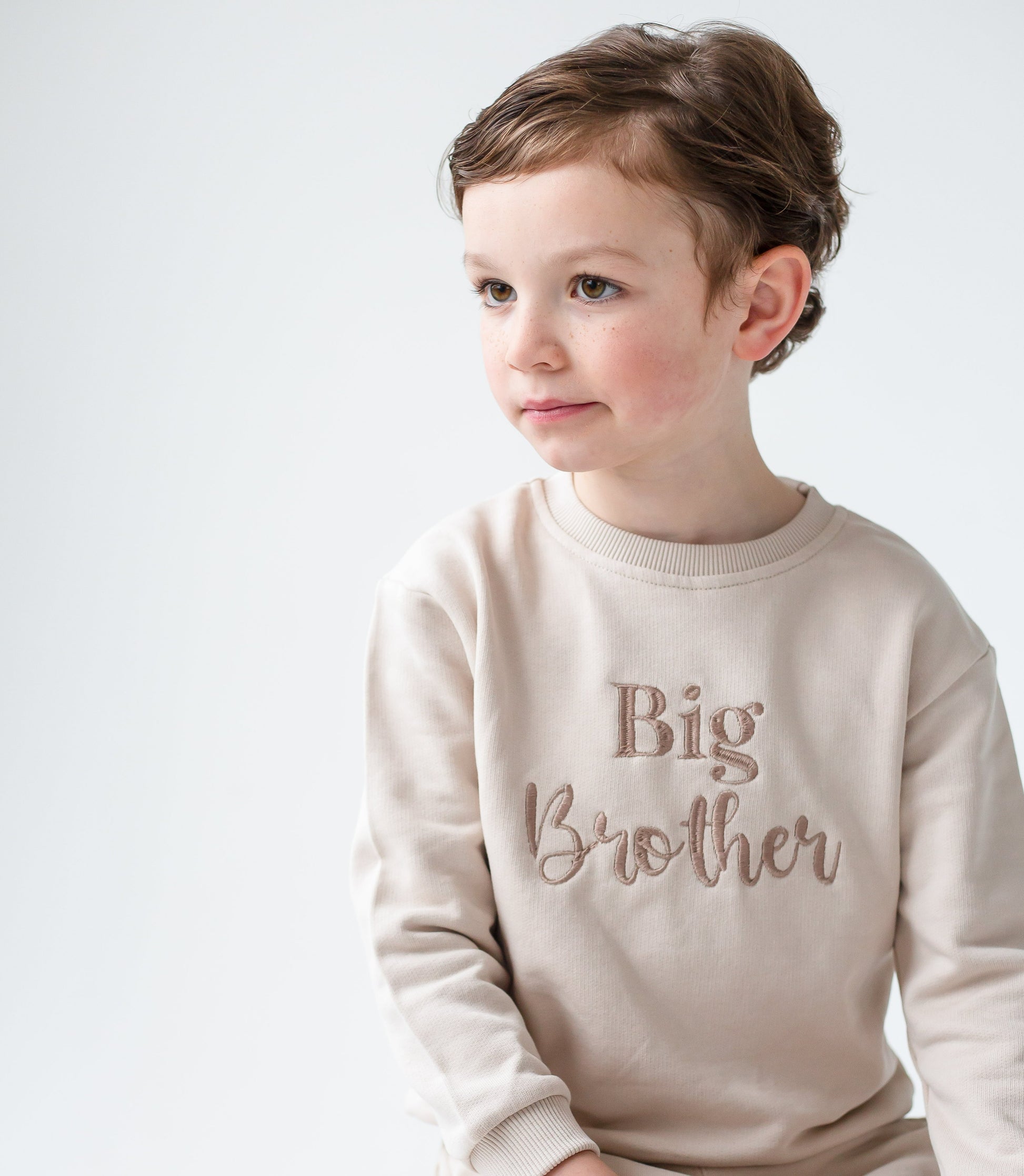 Style siblings up in these matching embroidered sweatshirts. Select from 'Big/Little' before adding product to cart. This is the brother sweatshirt, sister sweatshirt is also available. Models wear stone with copper thread but there are a range of colours available. We have designed a babygro to match also so we have all ages covered!