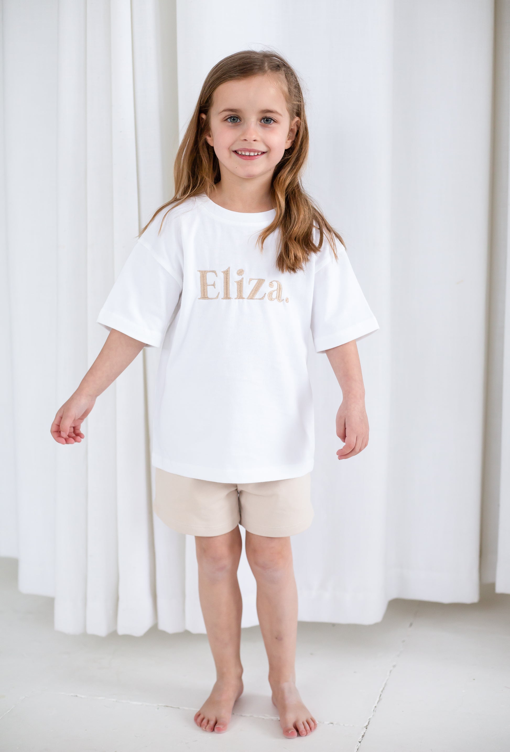 To complete the 'Minni' look, style back with our 'Child's summer jersey shorts' which come in pink and blue and are the exact same fabric as the t shirts so work beautifully as a set. Alternatively, try our 'Child's sweat shorts' which come in ivory and stone. The stone works nicely teamed back with copper or soft gold thread choices and model wears stone shorts in the images. Please type the descriptions into the search bar to find these styles easily and add to basket.