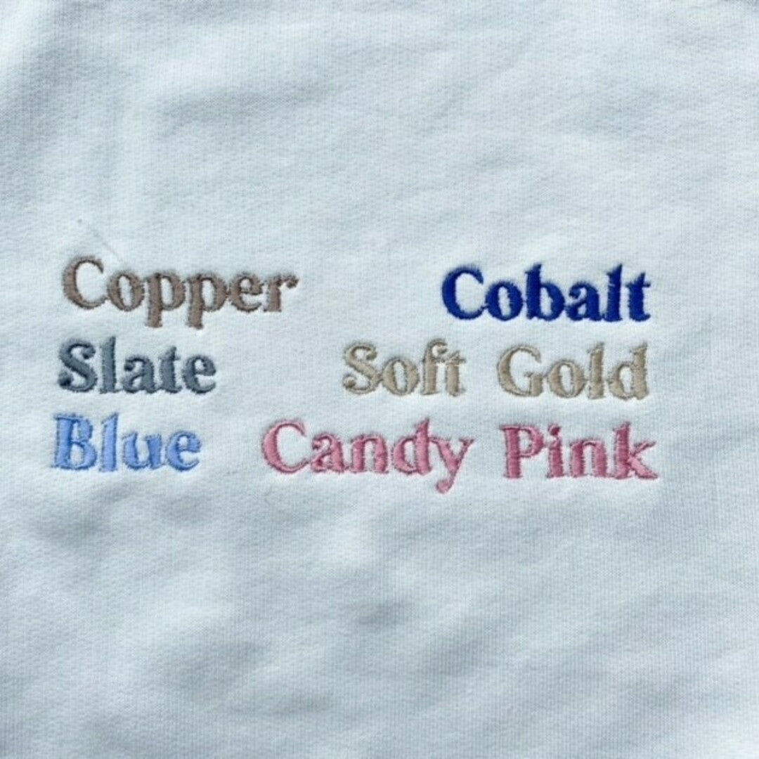 Our bestseller has been moved into a t shirt version for the summer. This embroidered t shirt is ivory with soft gold but is also available on a blue or pink base. On the pink base we recommend soft gold or candy pink. On the blue we would recommend soft gold or cobalt. Ivory looks good with all of them! (excluding ivory!)