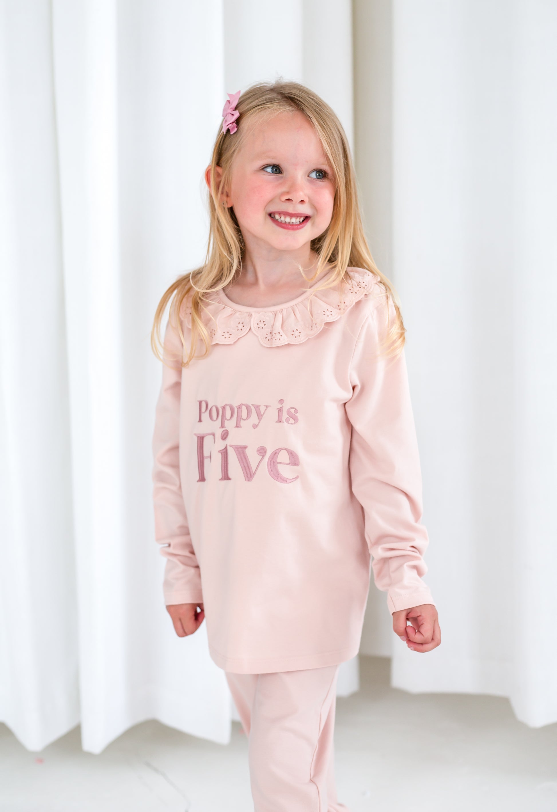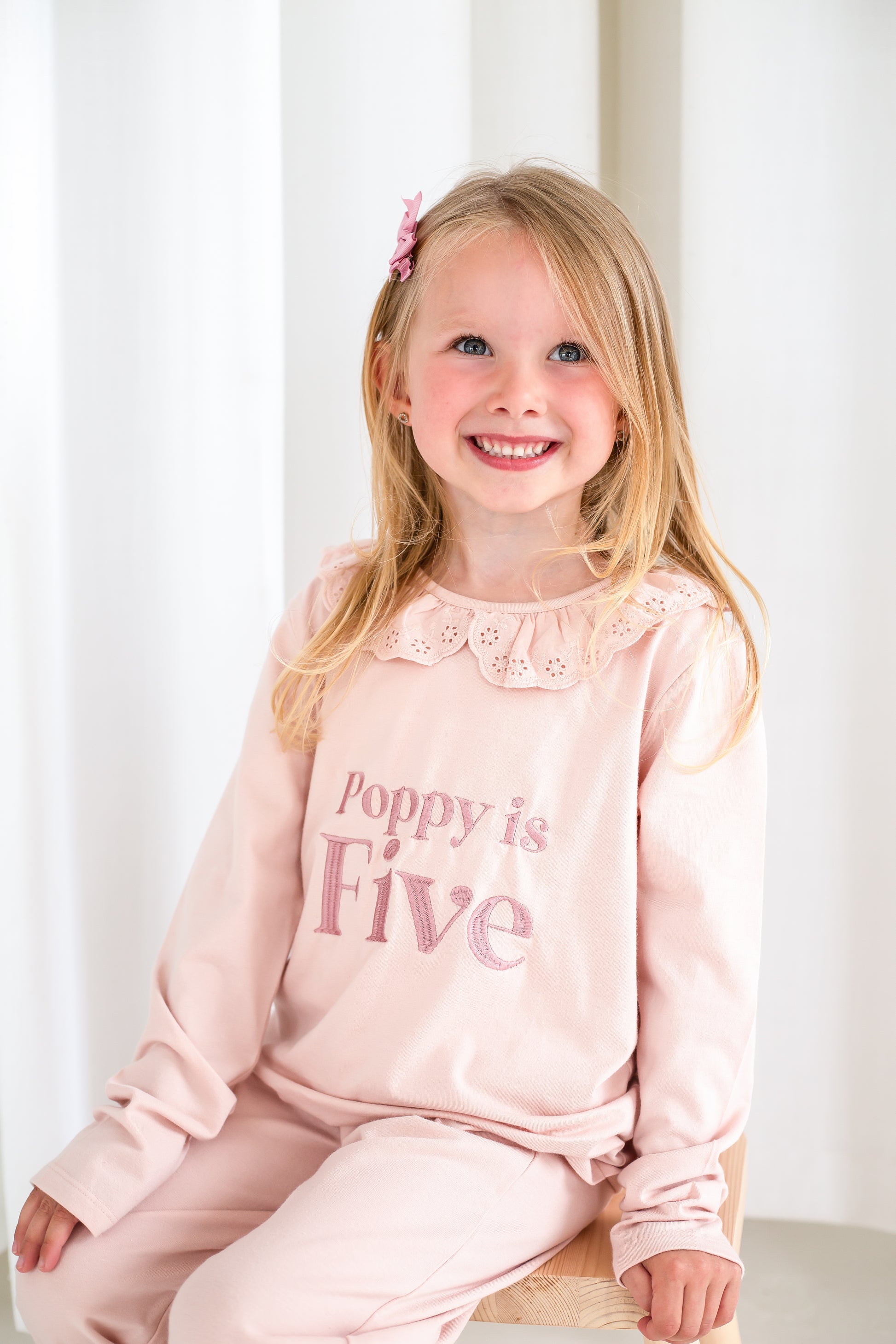 Celebrate milestone moments with our personalised embroidered pyjamas. These have a gorgeous lace frill on the collar along with a frilled cuff on the hem of the trousers. They are a soft jersey fabric quality.