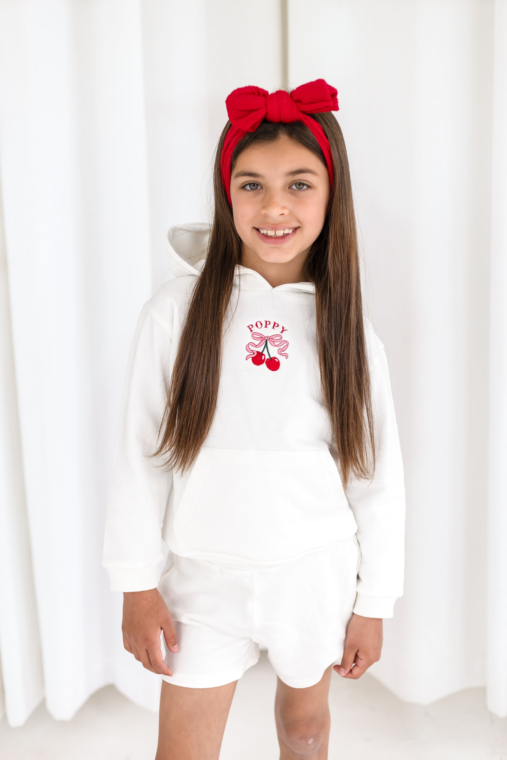 Match with your mini in these gorgeous embroidered cherry summer hoodies. This is the child's listing but matching MAMA is available too for the perfect summer matching outfit. This style is part of our summer collection and is available in ivory only. Thread colour is fixed as imagery. Please enter child's name in the personalisation box provided.
