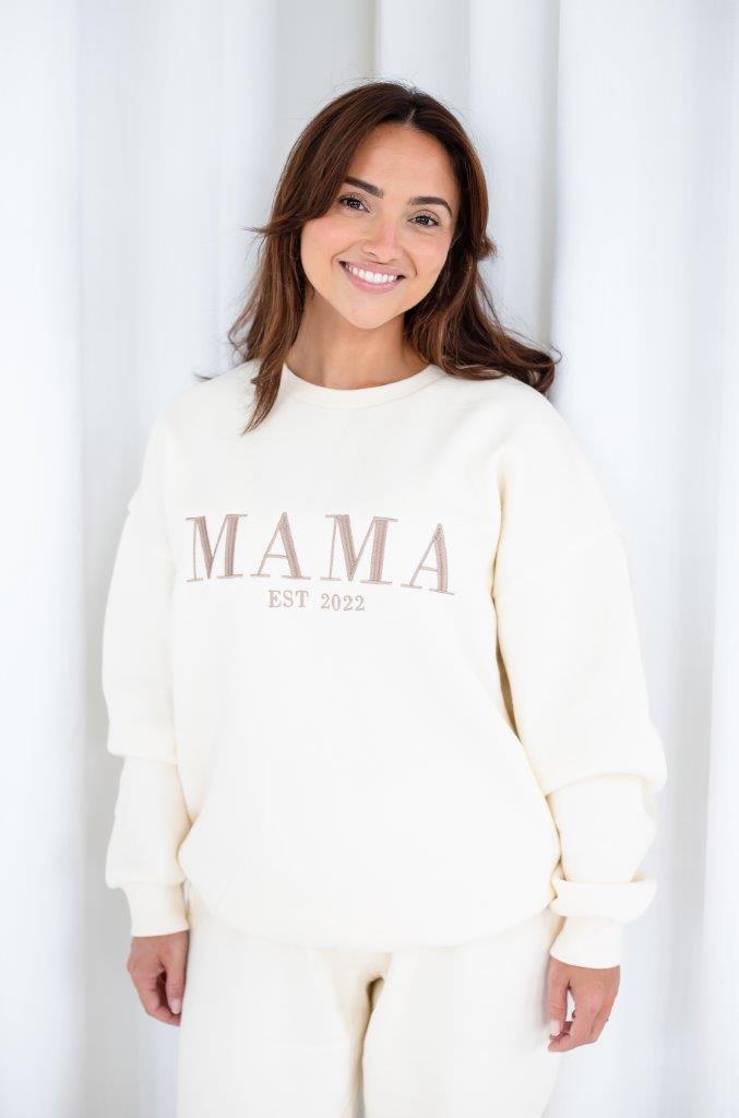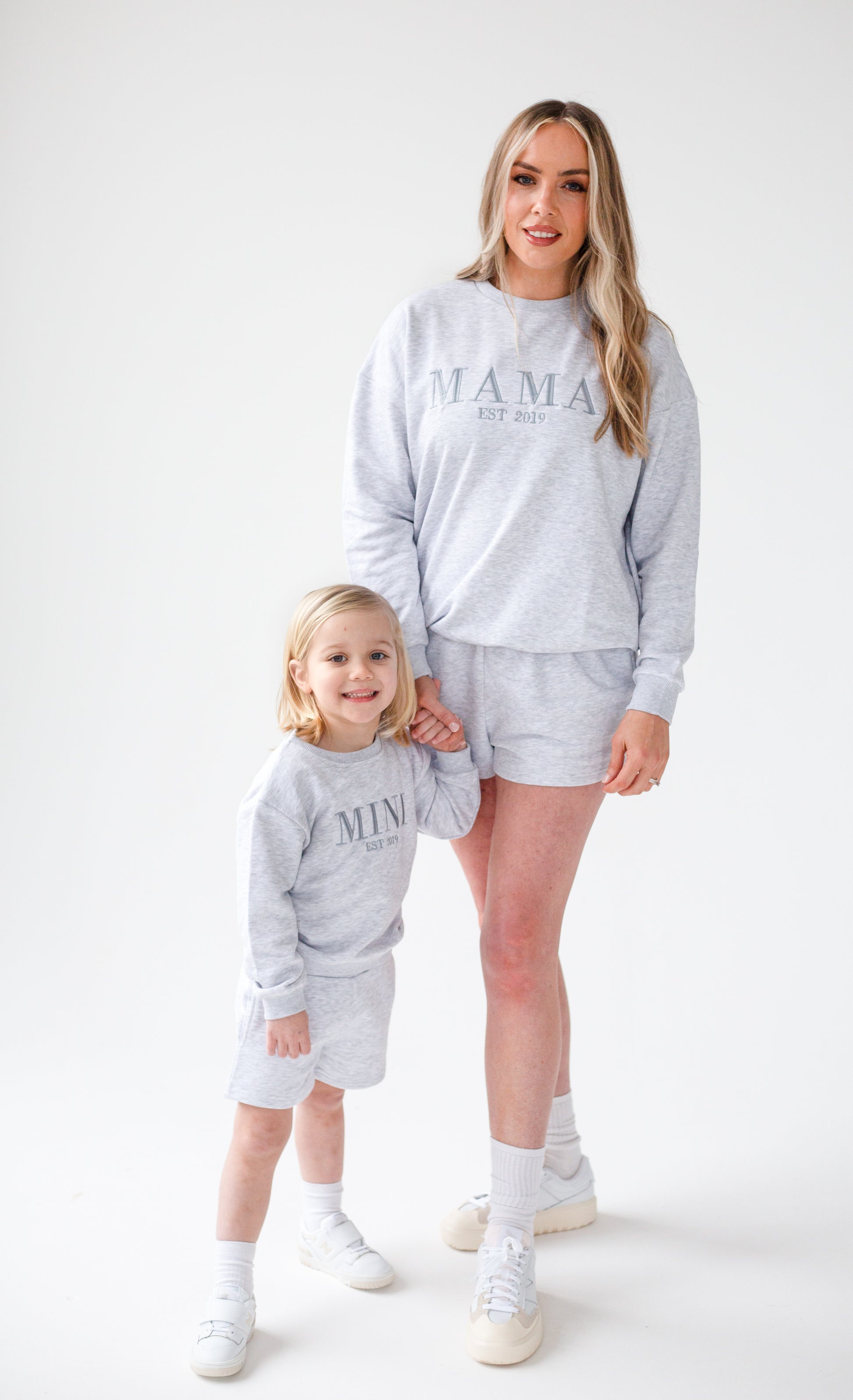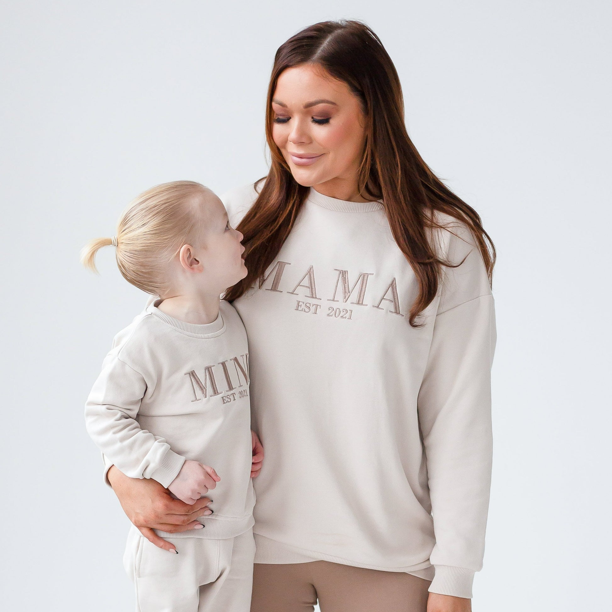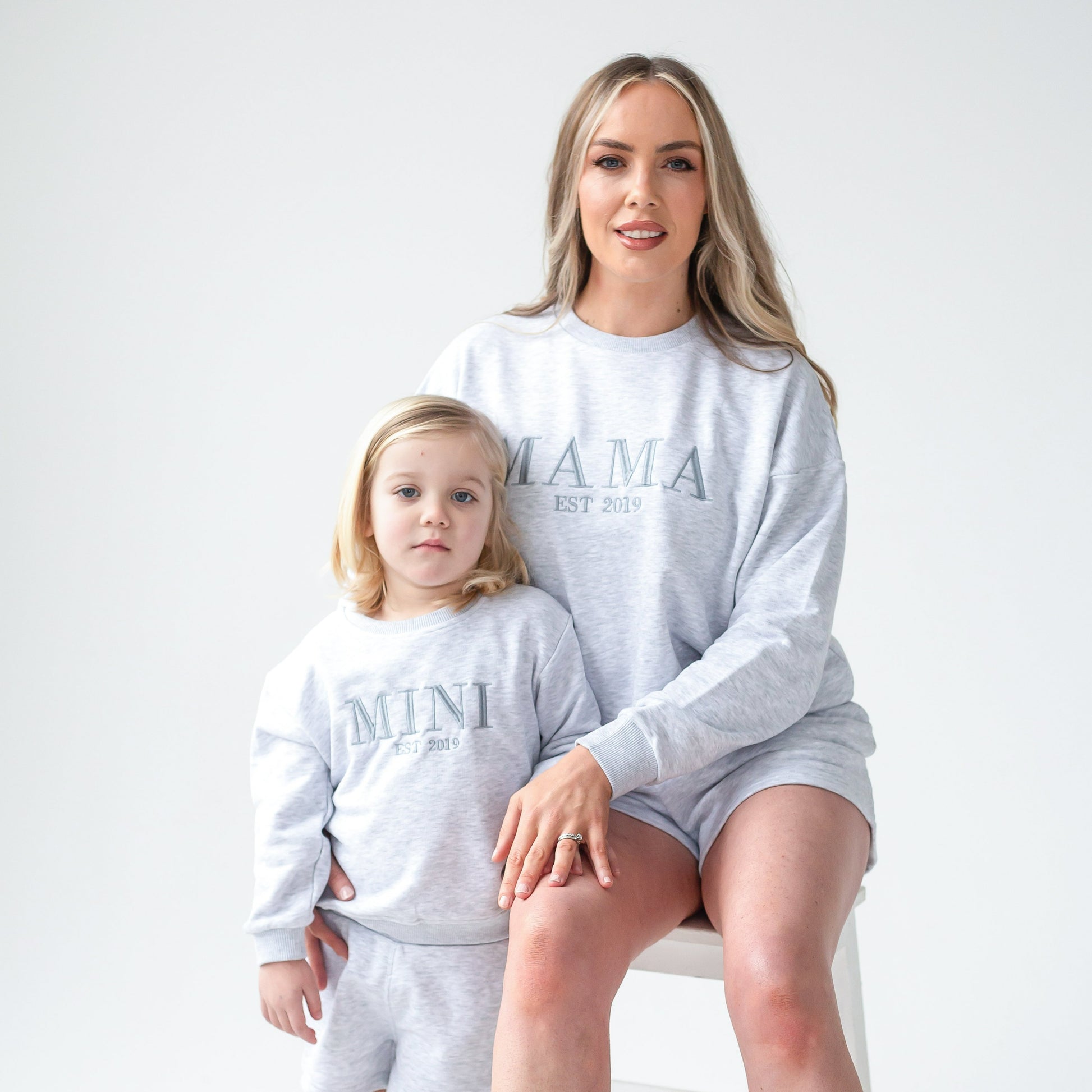Match with your mini in this 'Mama Est.' embroidered sweatshirt. Leading image shows ash grey with slate thread. We have also included a shot of 'MAMA' in ivory and soft gold too.