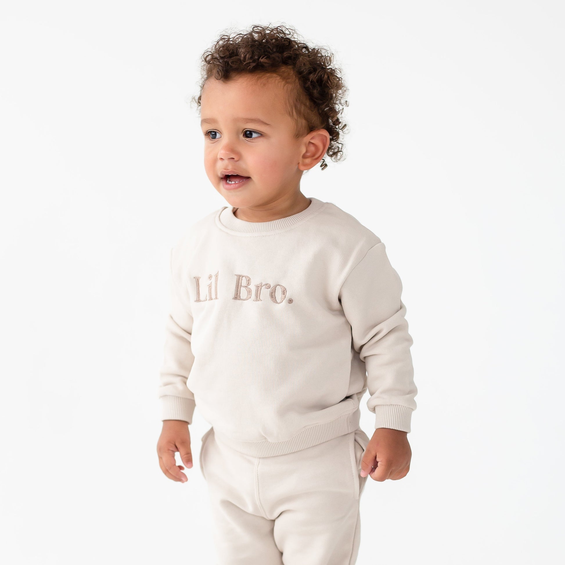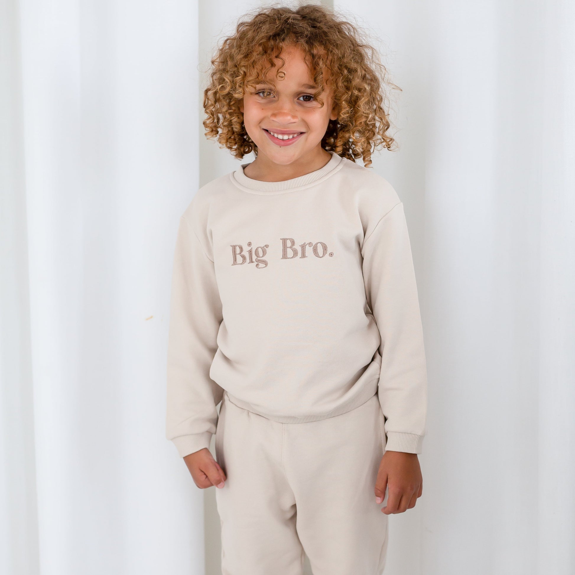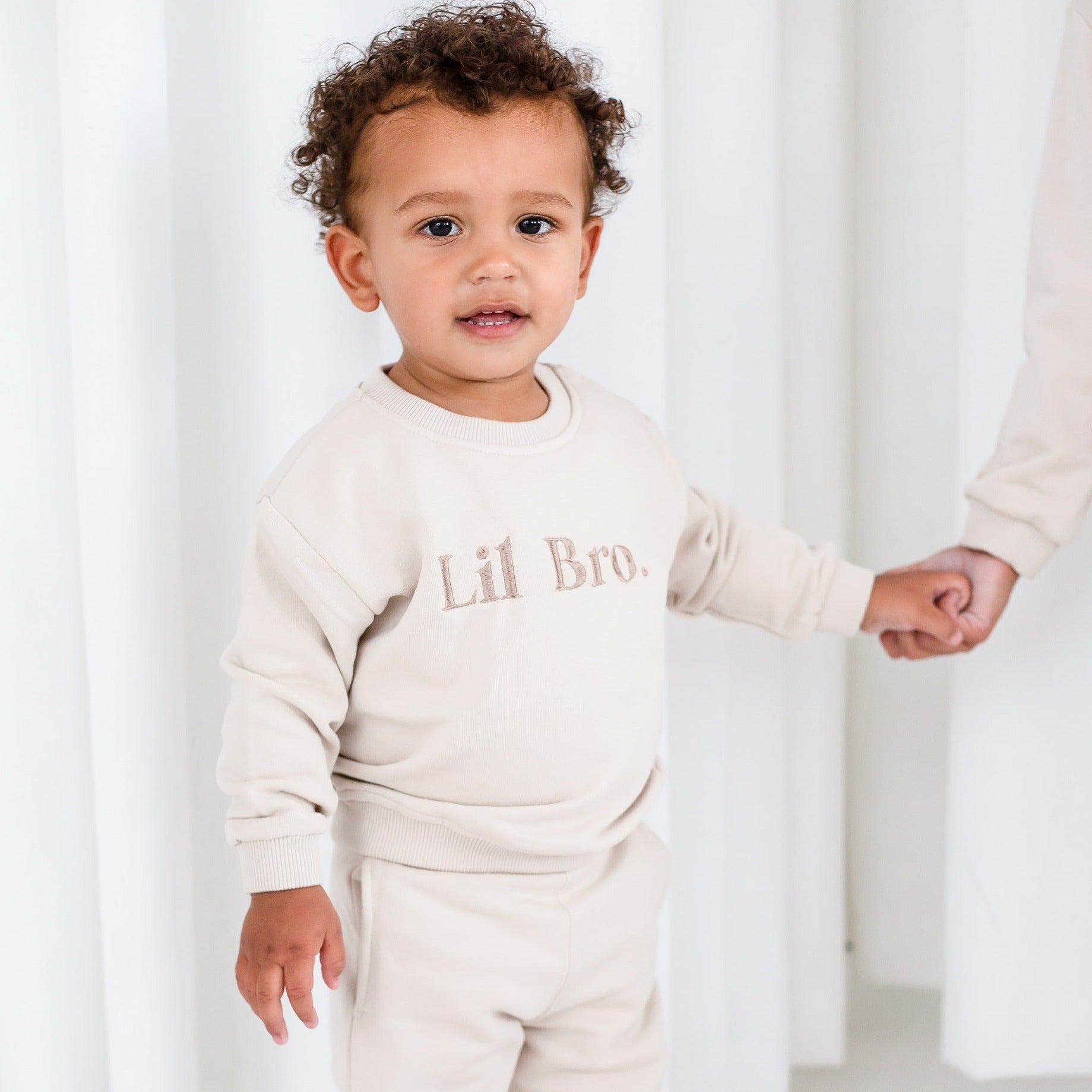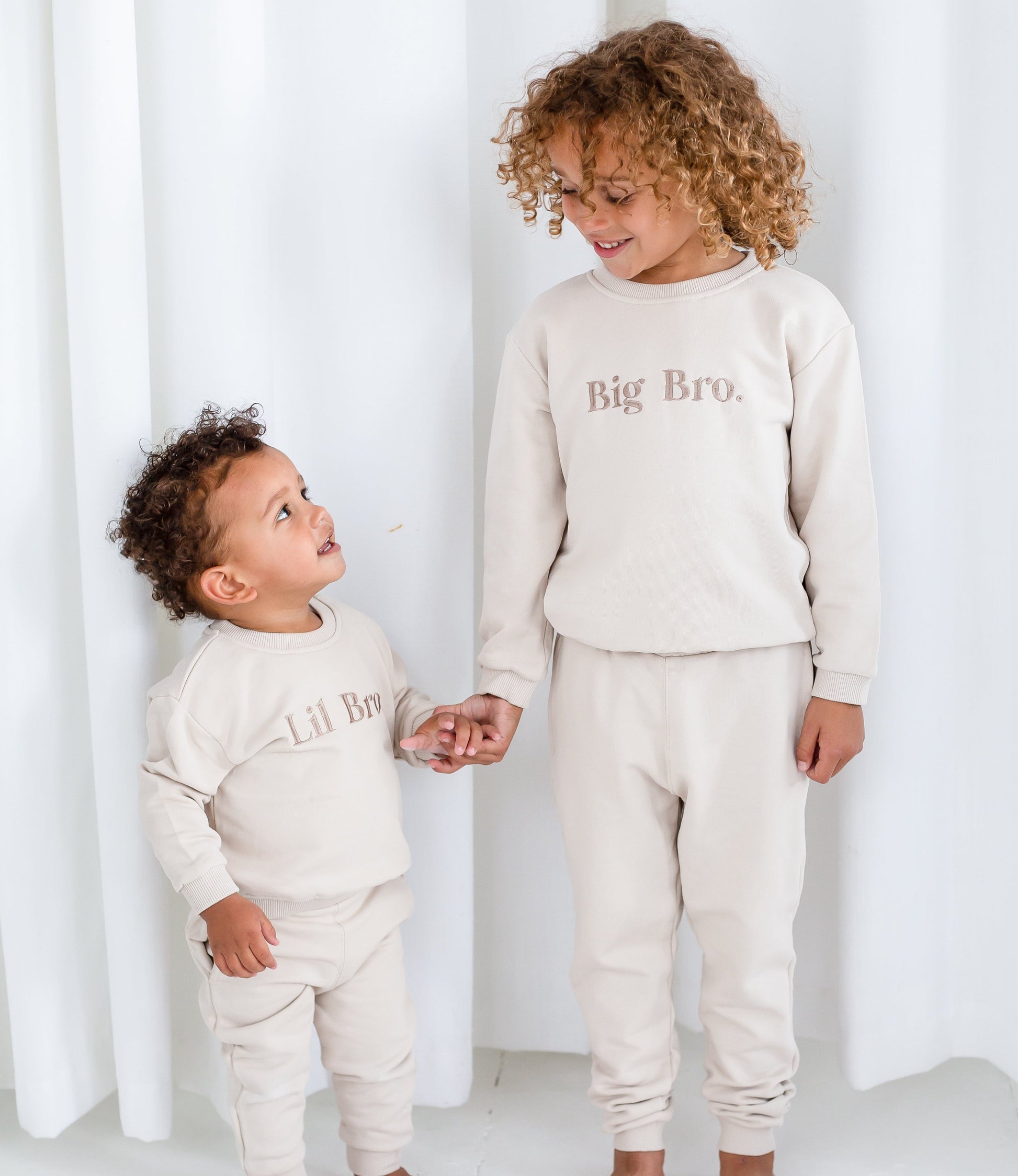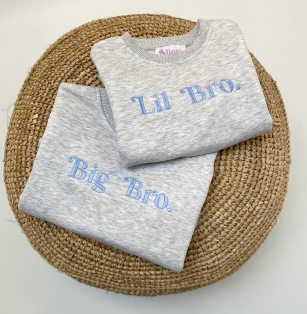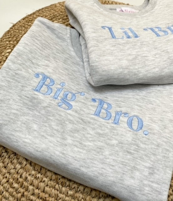 Style siblings up in these matching embroidered sweatshirts. Select from 'Big/Lil' before adding product to cart. This is the brother sweatshirt, sister sweatshirt is also available. Models wear stone with copper thread and the still life image is ash grey with blue font colour but please choose from a range of colours available.