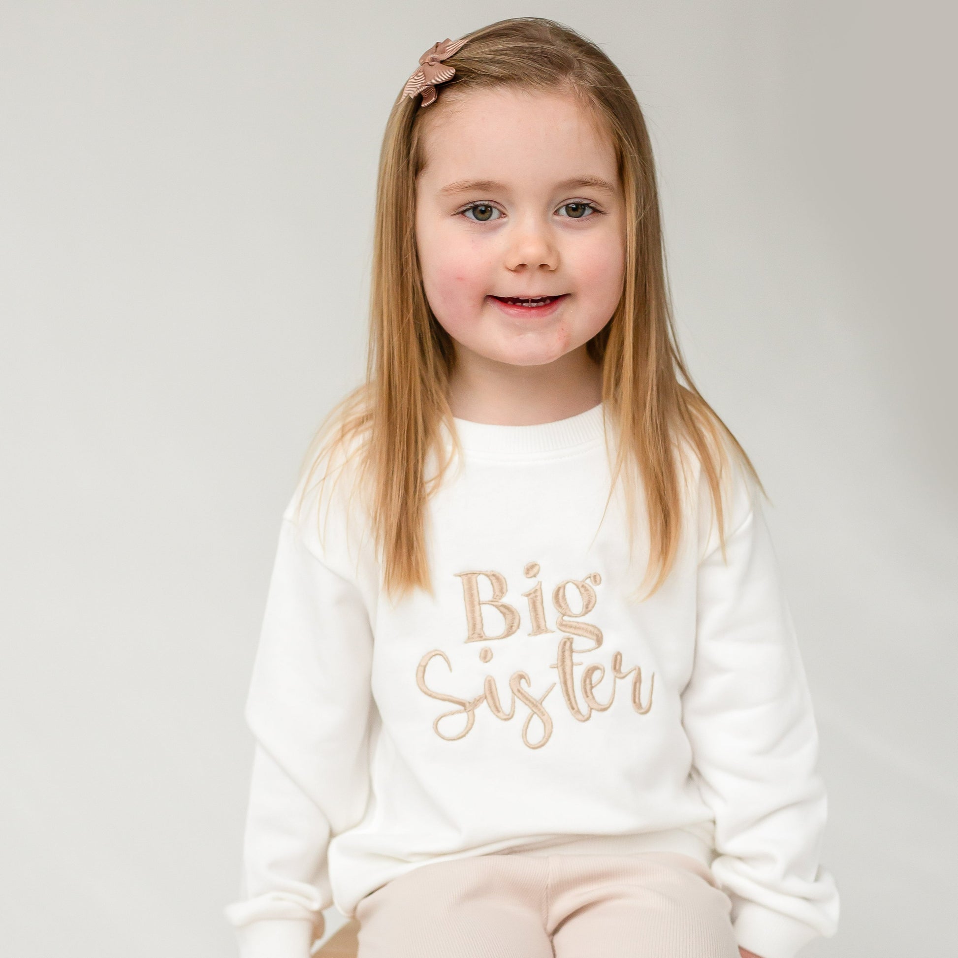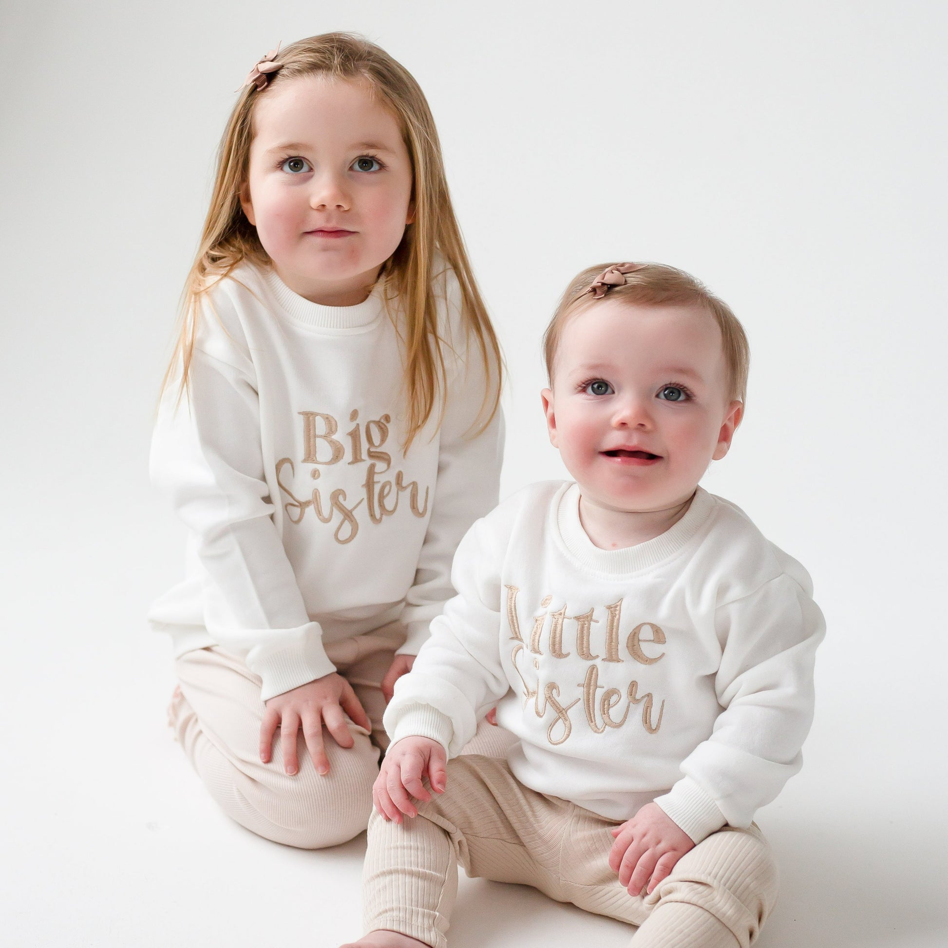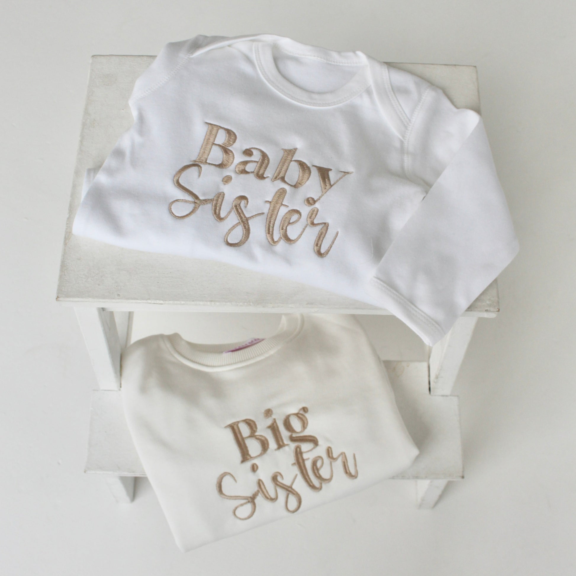 Style siblings up in these matching embroidered sweatshirts. Select from 'Big/Little' before adding product to cart. This is the sister sweatshirt, brother sweatshirt is also available. Models wear ivory with soft gold thread but there are a range of colours available. We have designed a babygro to match also so we have all ages covered!