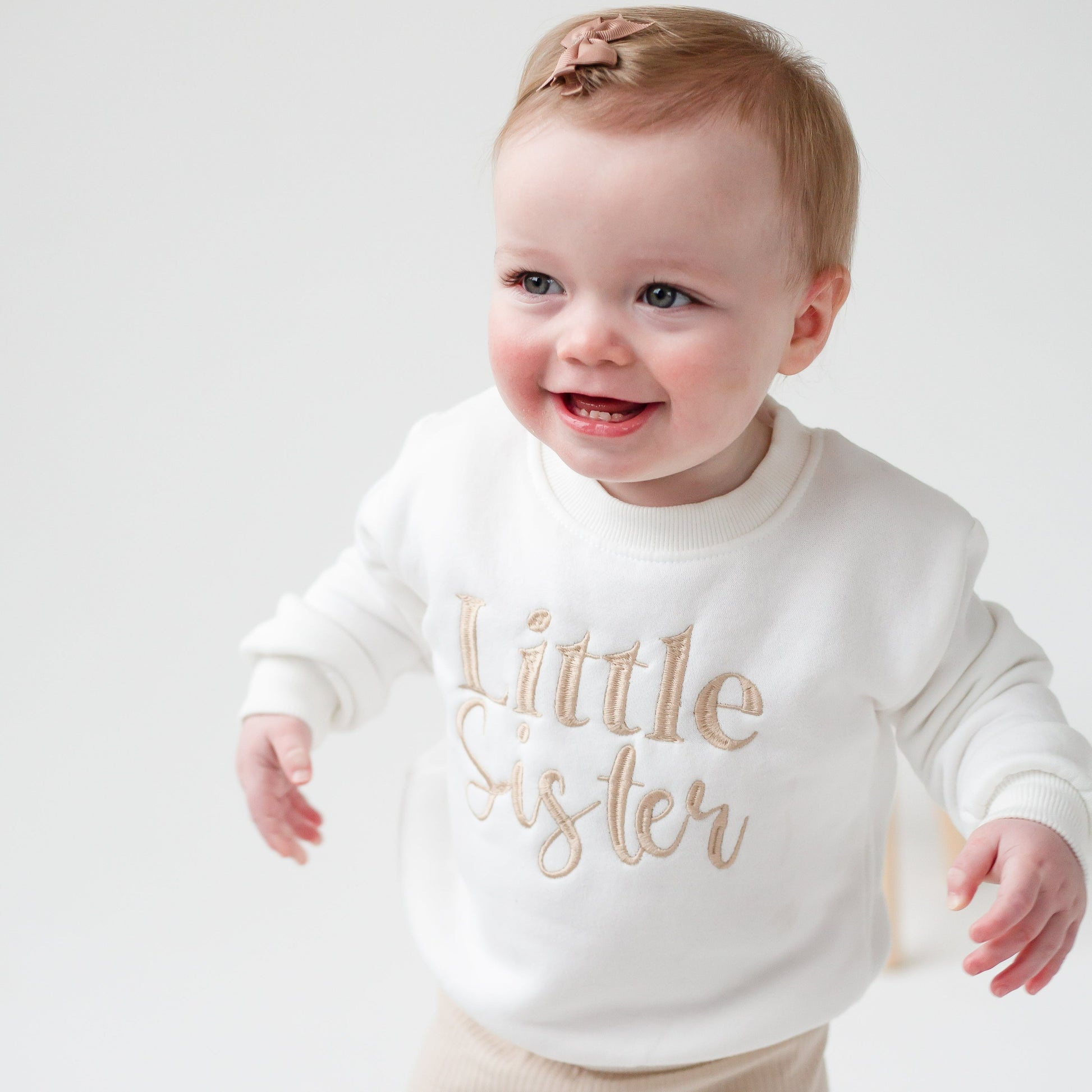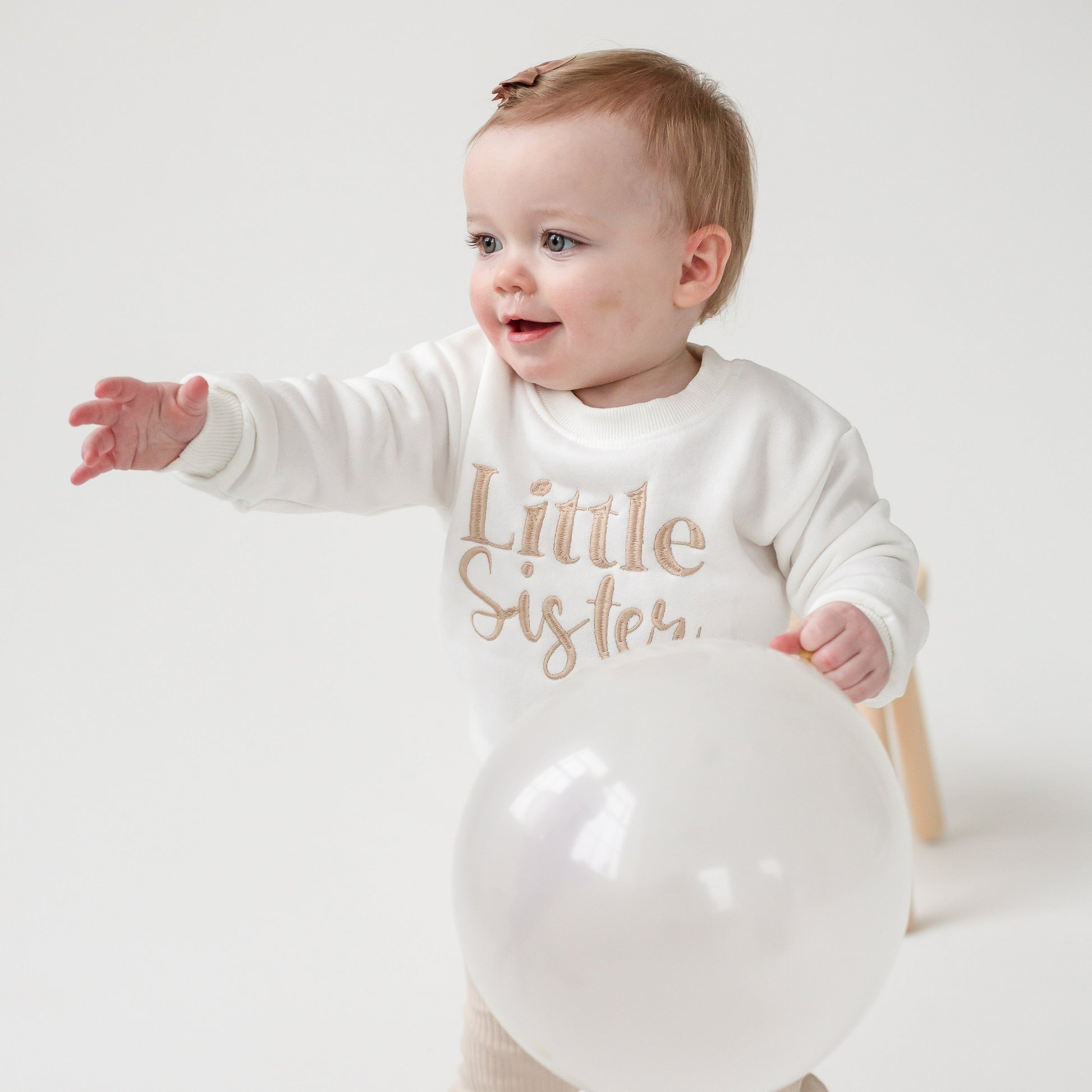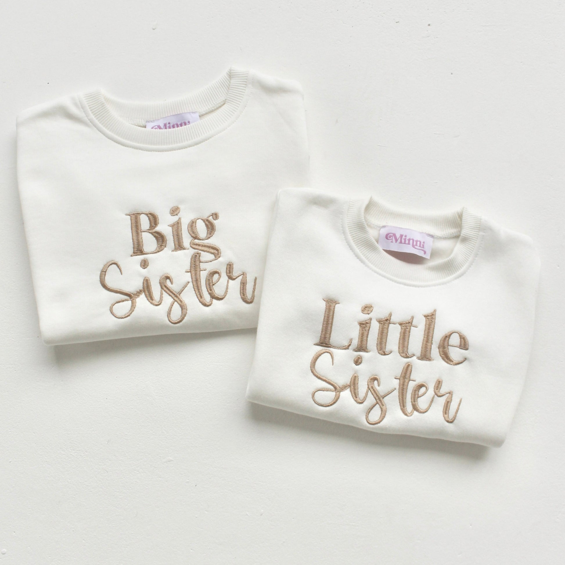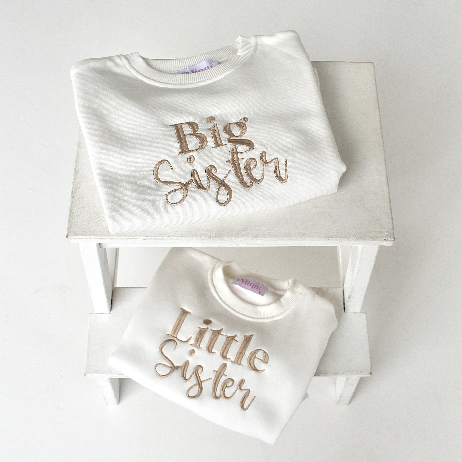 Style siblings up in these matching embroidered sweatshirts. Select from 'Big/Little' before adding product to cart. This is the sister sweatshirt, brother sweatshirt is also available. Models wear ivory with soft gold thread but there are a range of colours available. We have designed a babygro to match also so we have all ages covered!