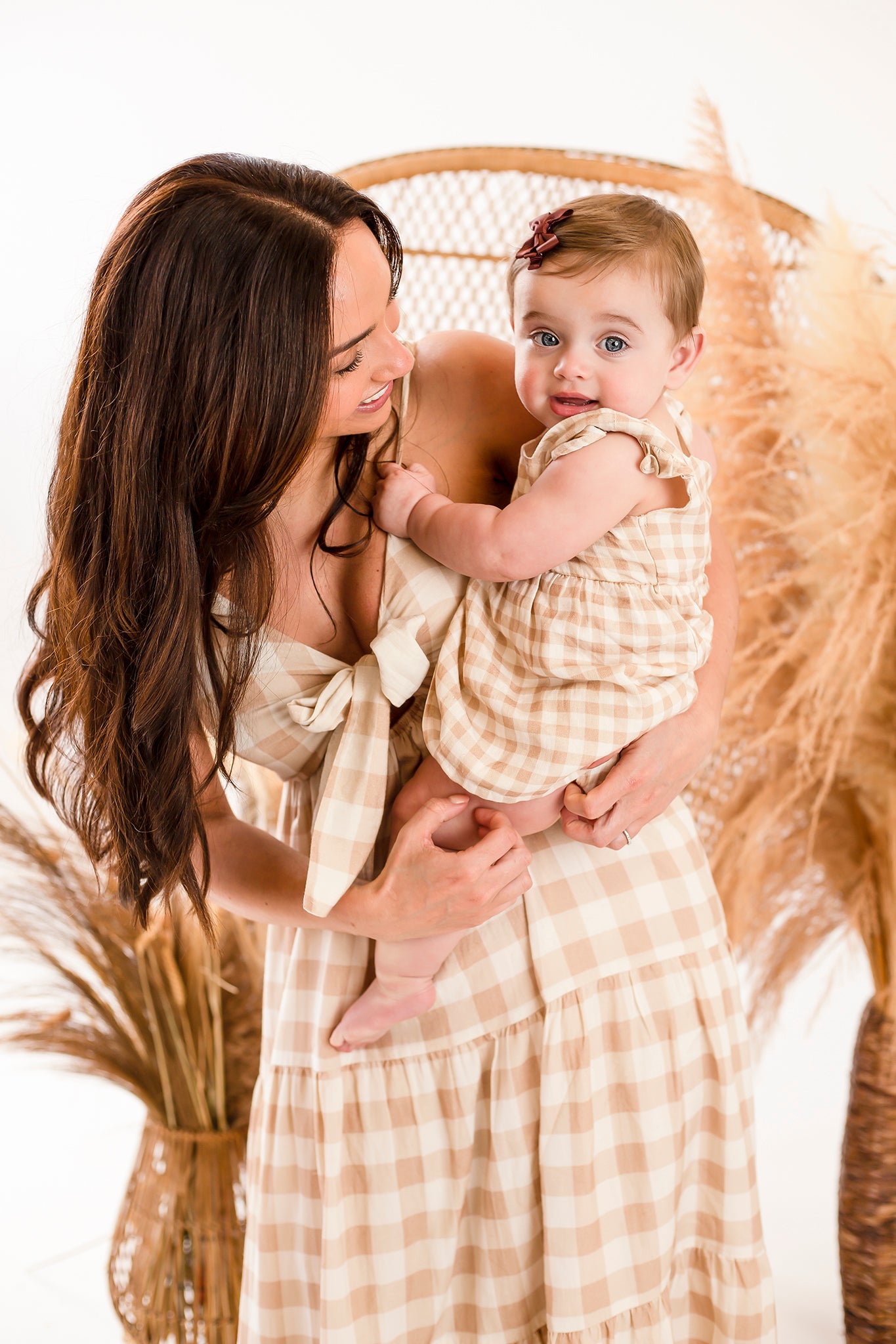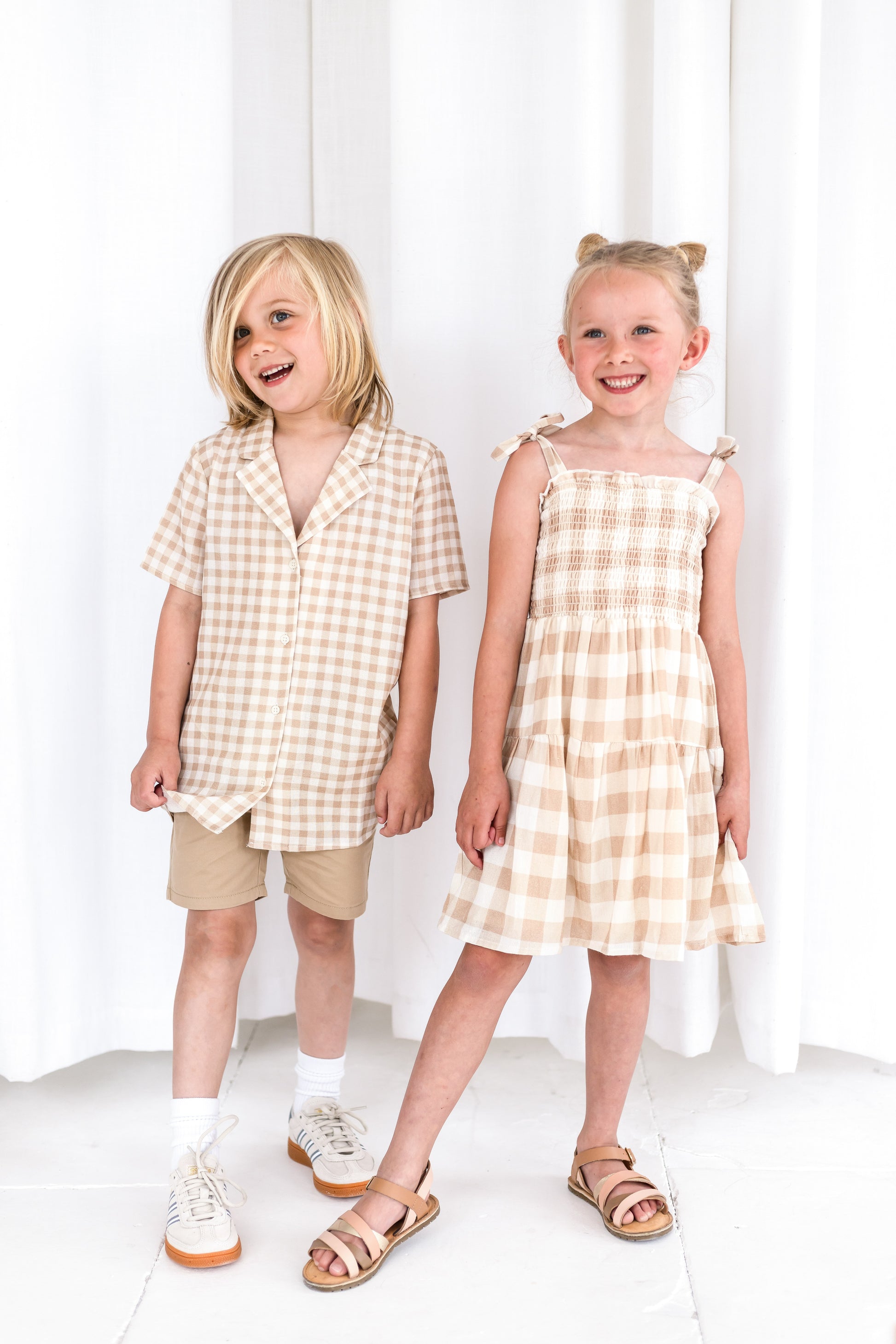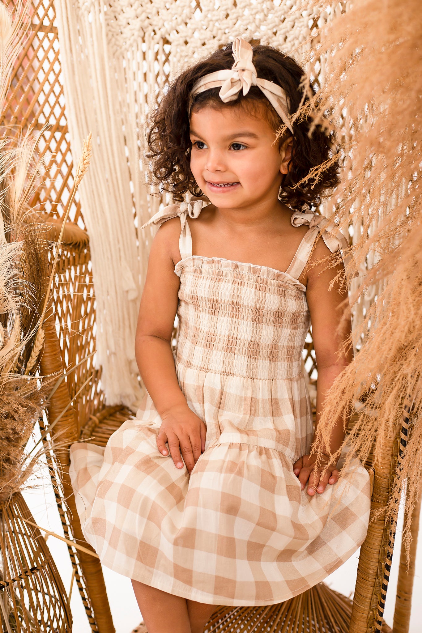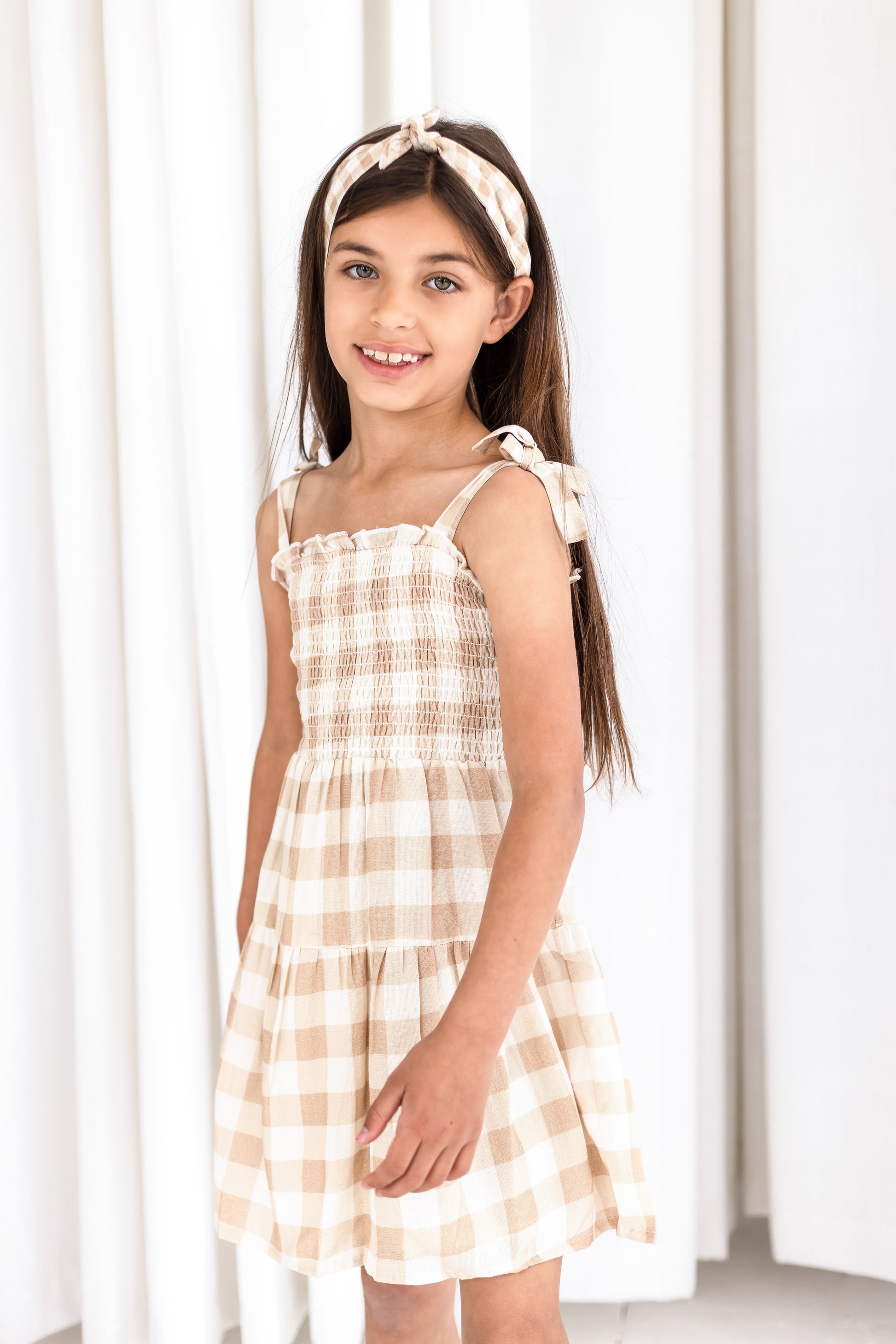 Your mini can match with you in this gorgeous gingham strappy dress. The dress has fixed ties on the shoulders and tiers on the skirt section to give fullness.
