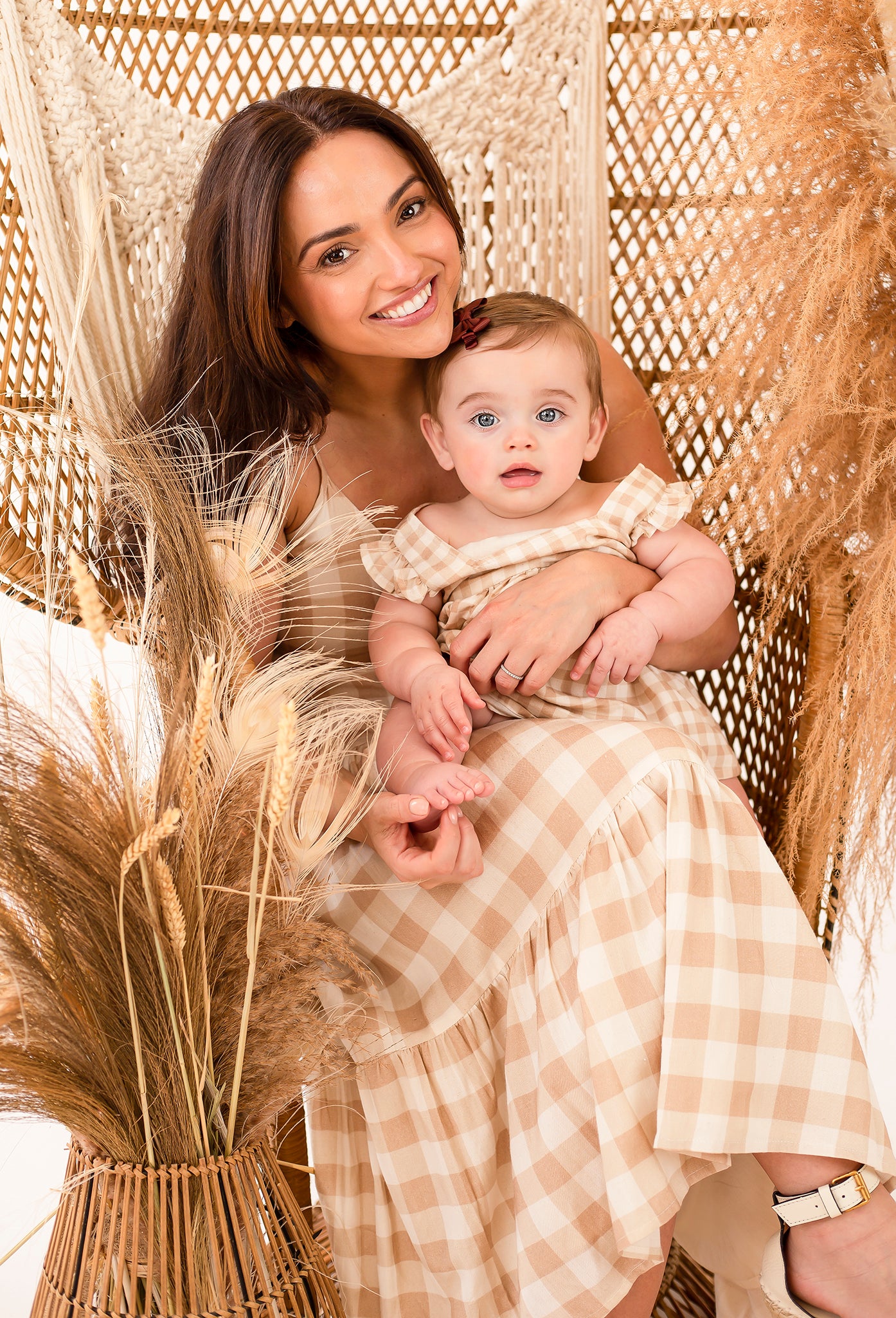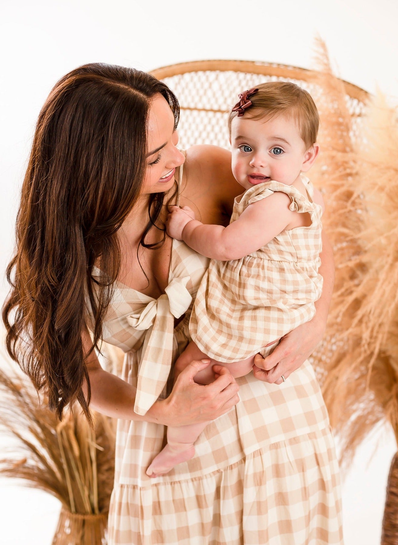 Match with your mini in this gorgeous gingham strappy midi dress. Style has tie front and small cut out detail on the bust along with tiers on the skirt section to give fullness.