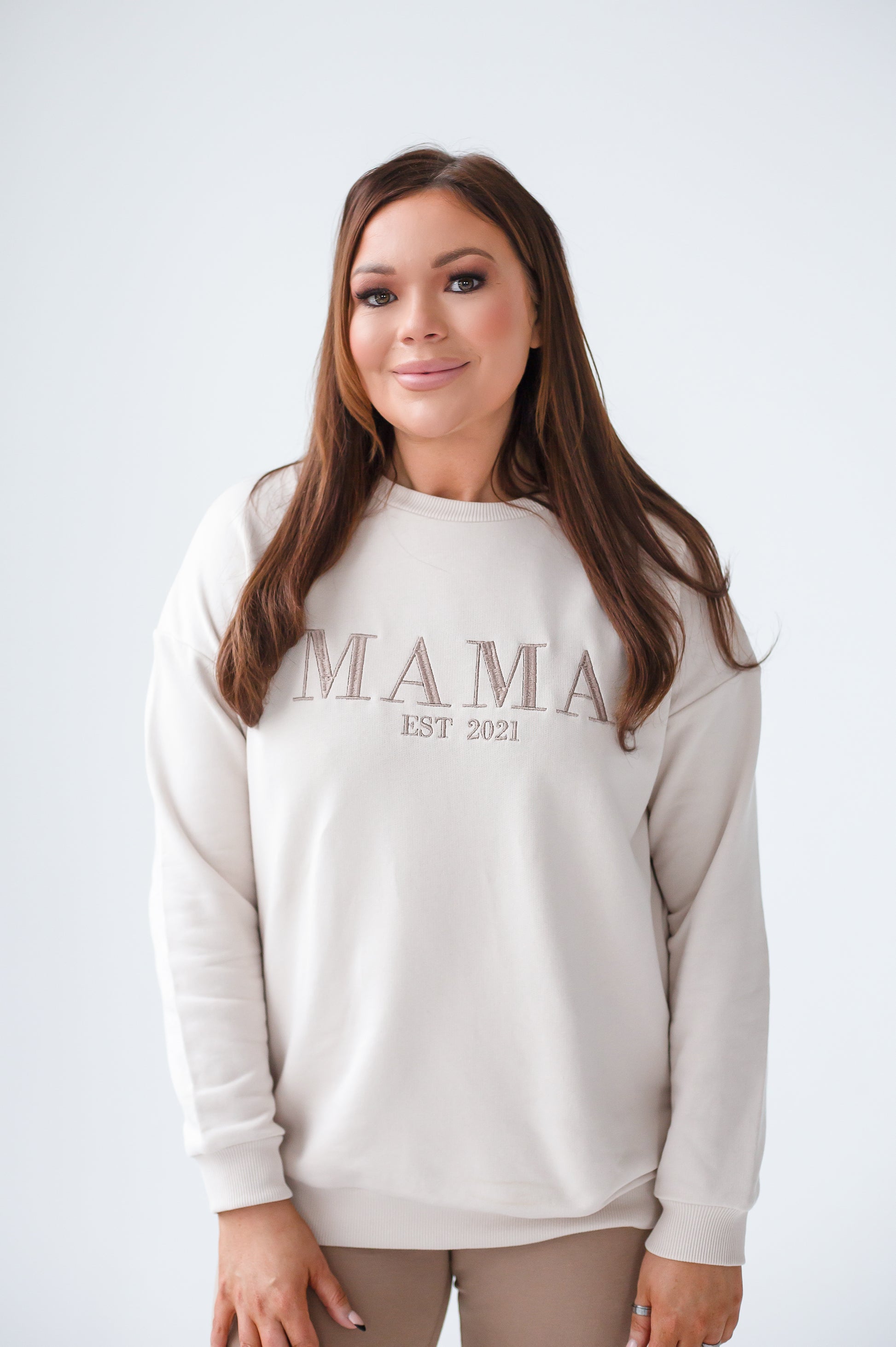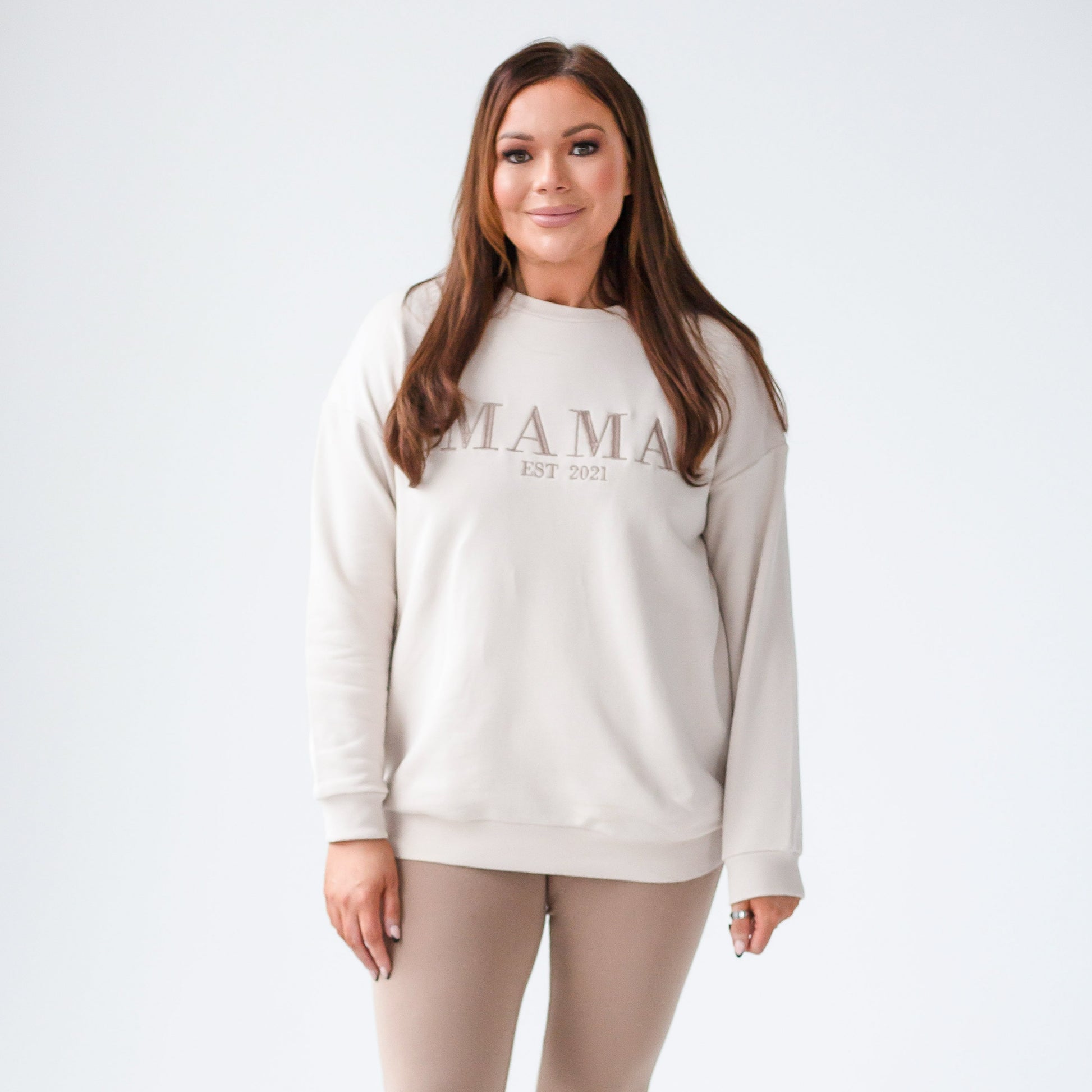 Match with your mini in this 'Mama Est.' embroidered sweatshirt. Leading image shows stone with copper thread. Supporting model images show ash grey with slate. We have also included a shot of our regular 'MAMA' sweatshirt in ivory and soft gold too.
