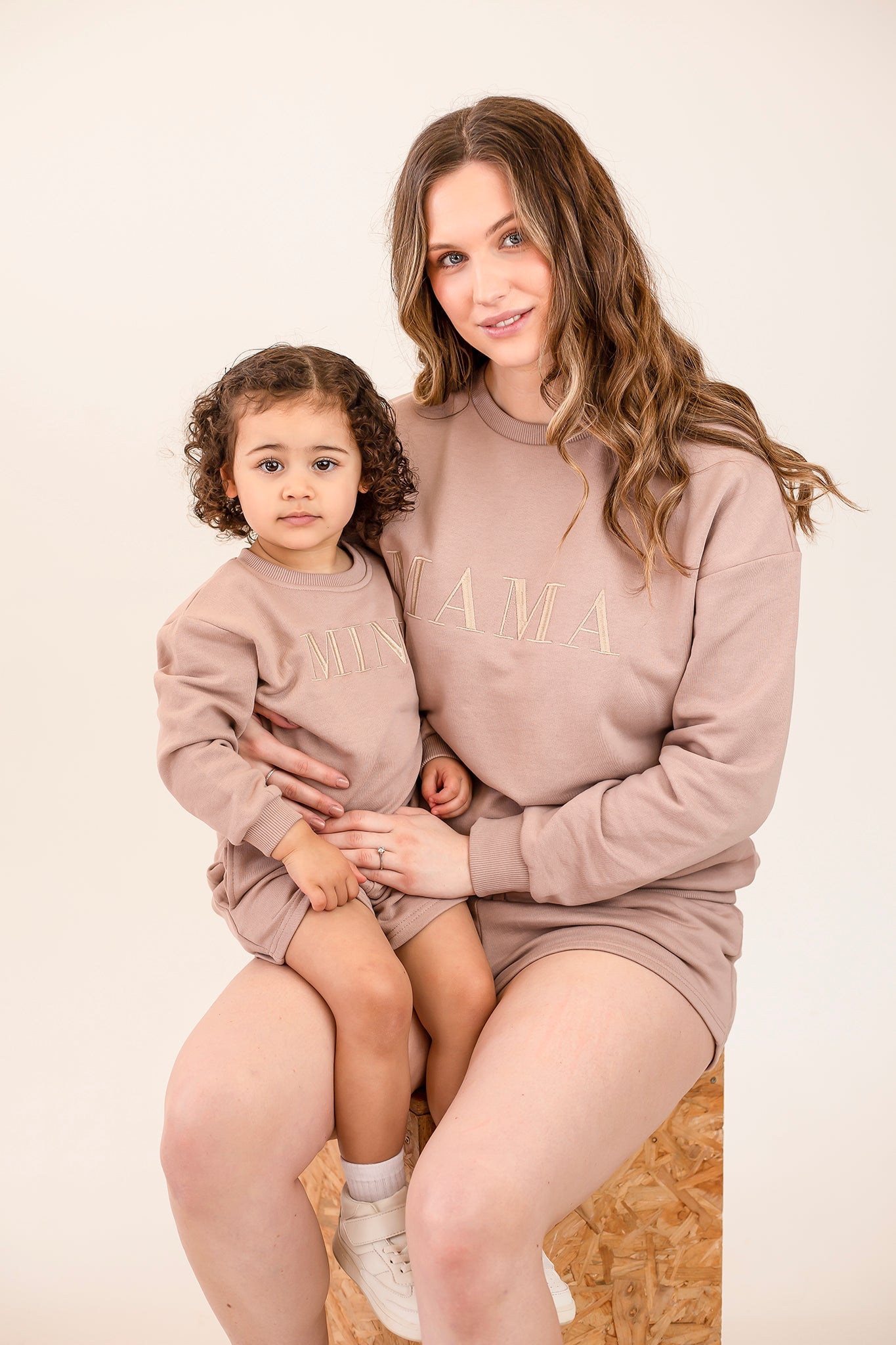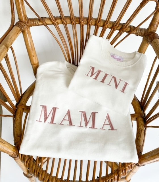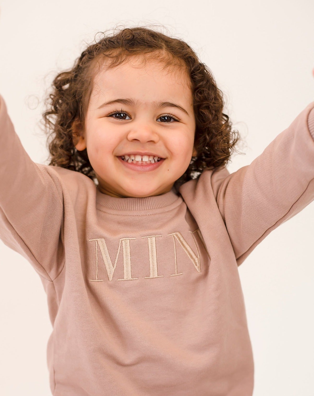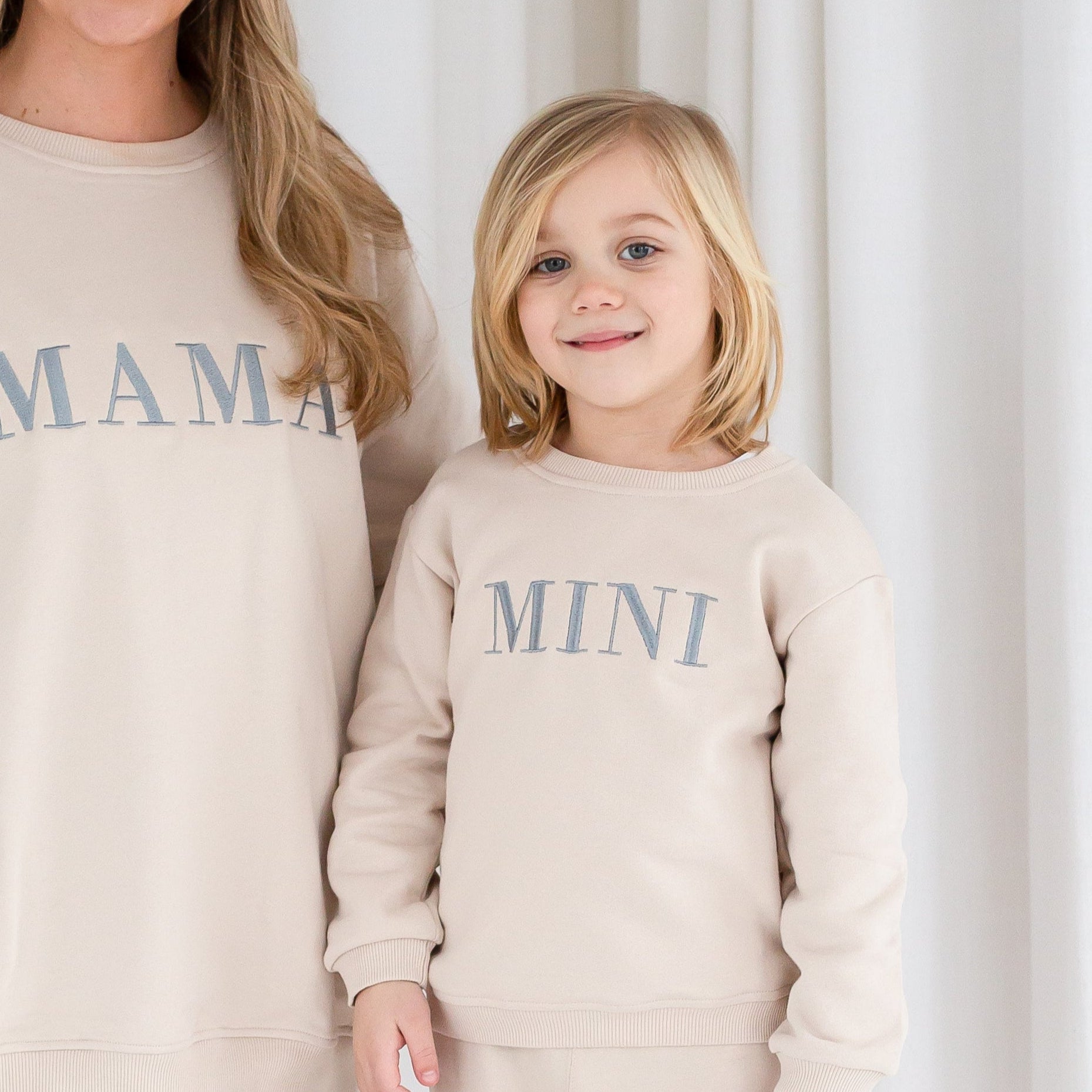 Your mini can match with you in this 'MINI' embroidered sweatshirt. Imagery shows stone with slate colourway. Supporting imagery features ivory with pink font and mocha with soft gold but there are a range of colours available.