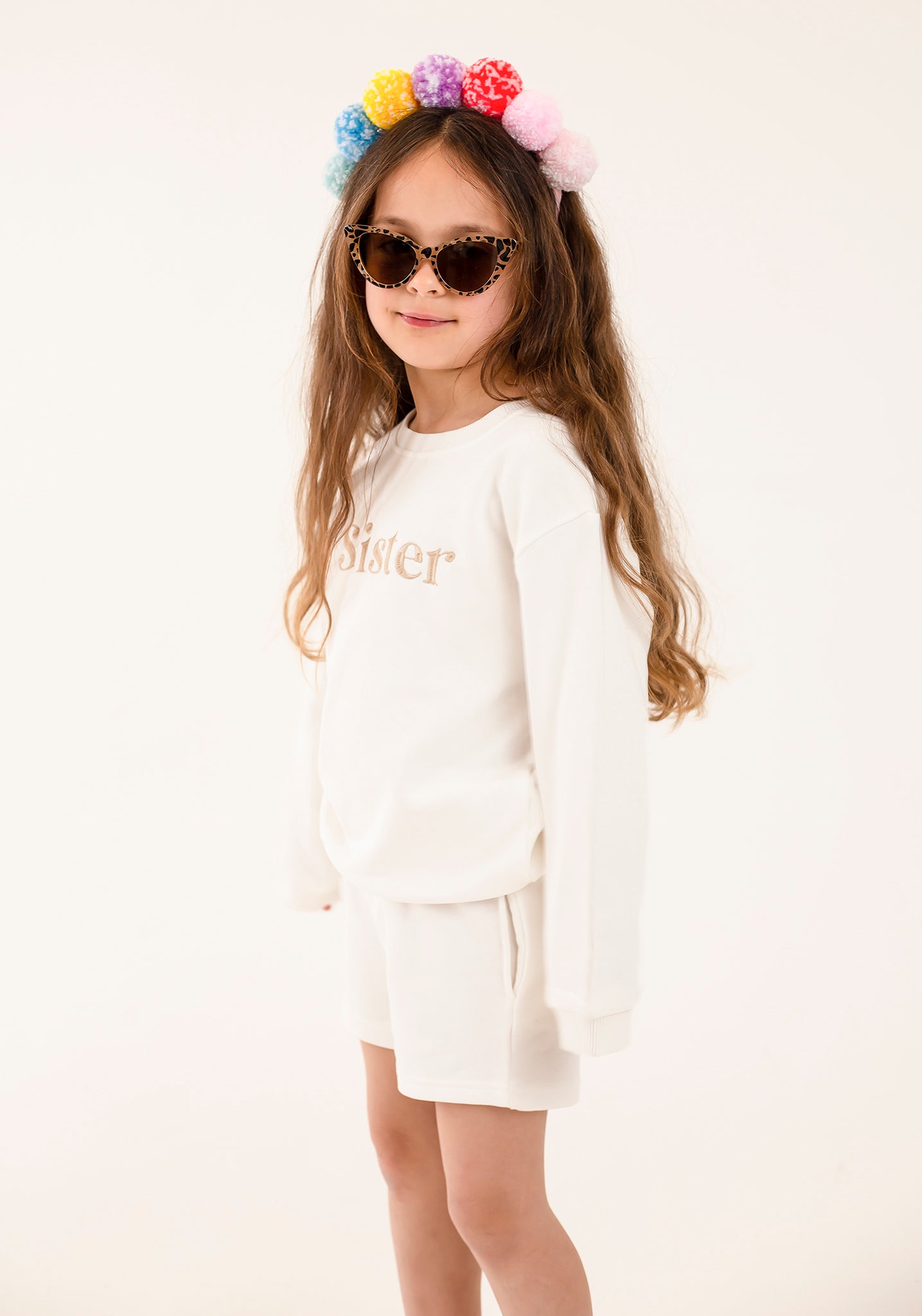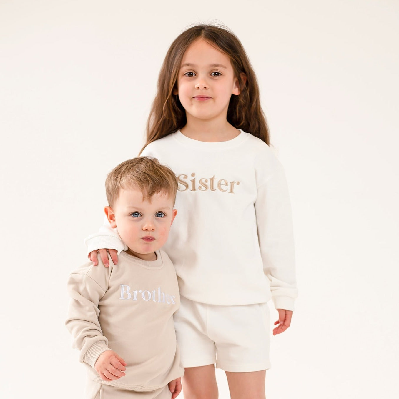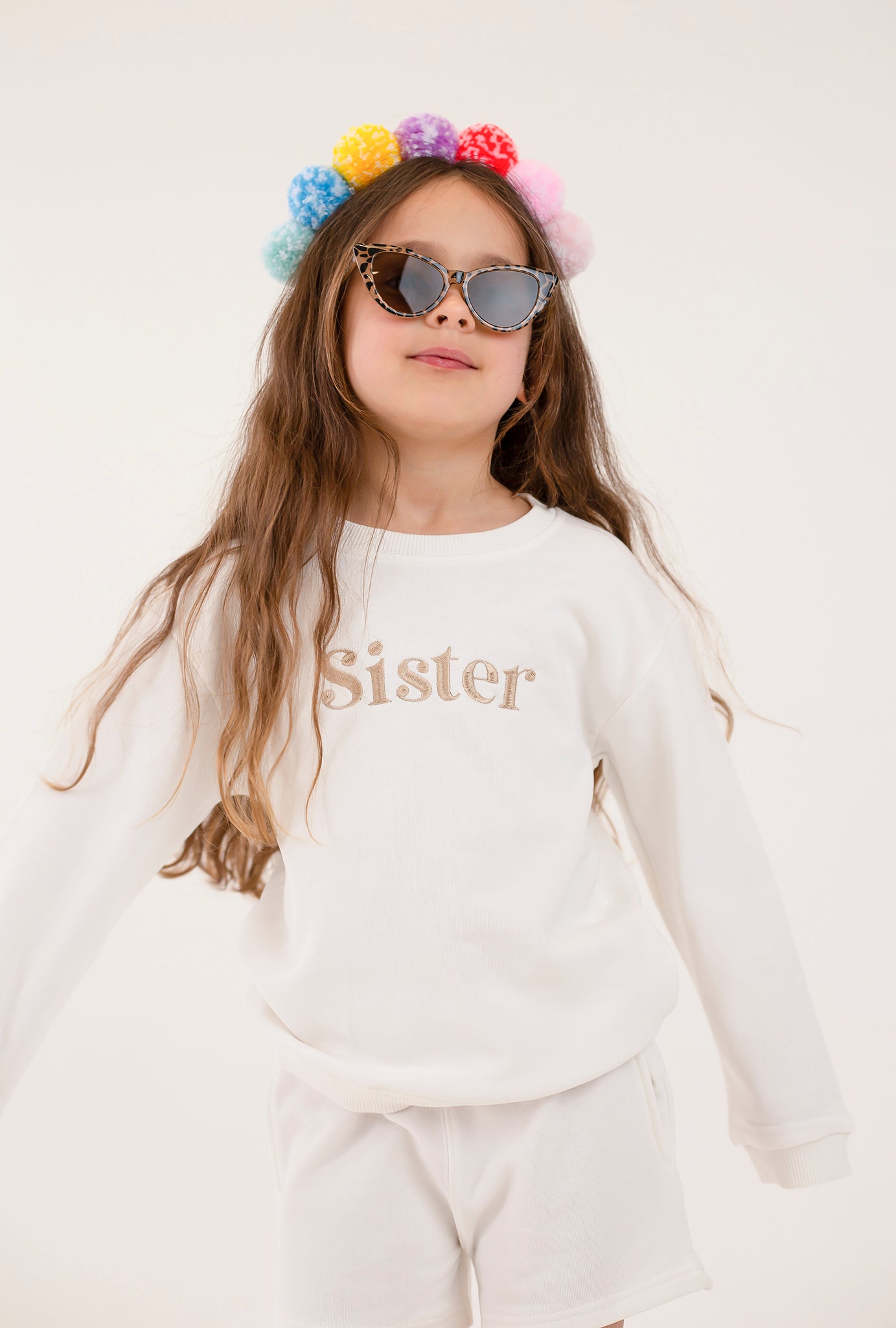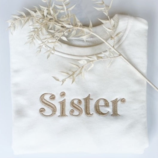 Match siblings in this embroidered 'sister' sweatshirt. Model wears ivory sweatshirt with pale gold font colour but full range of colours available.
