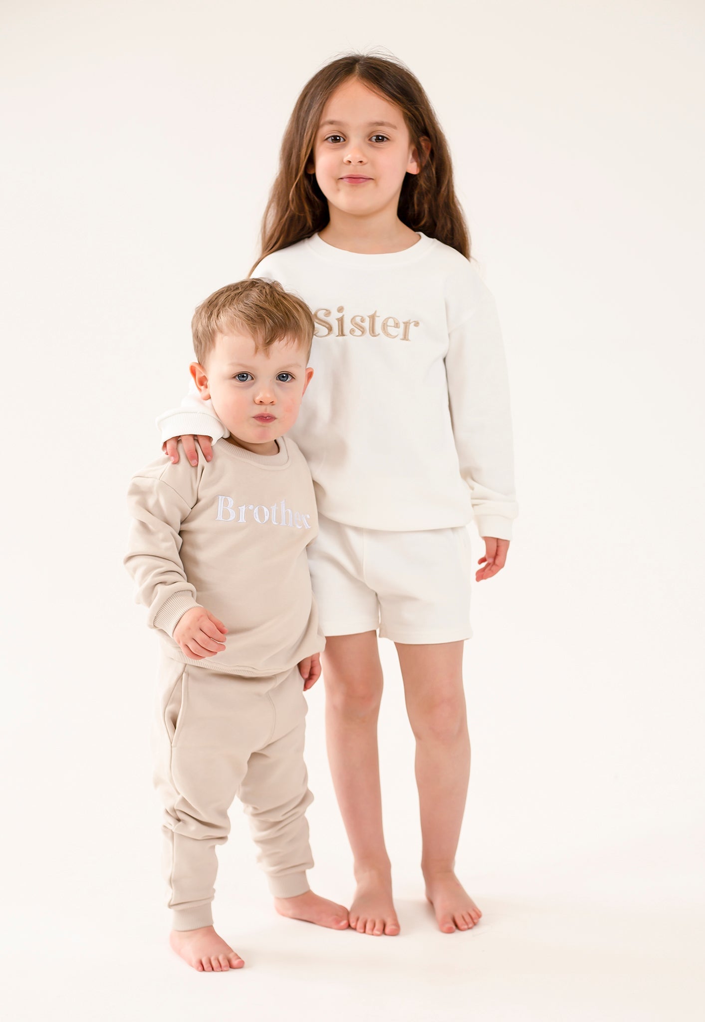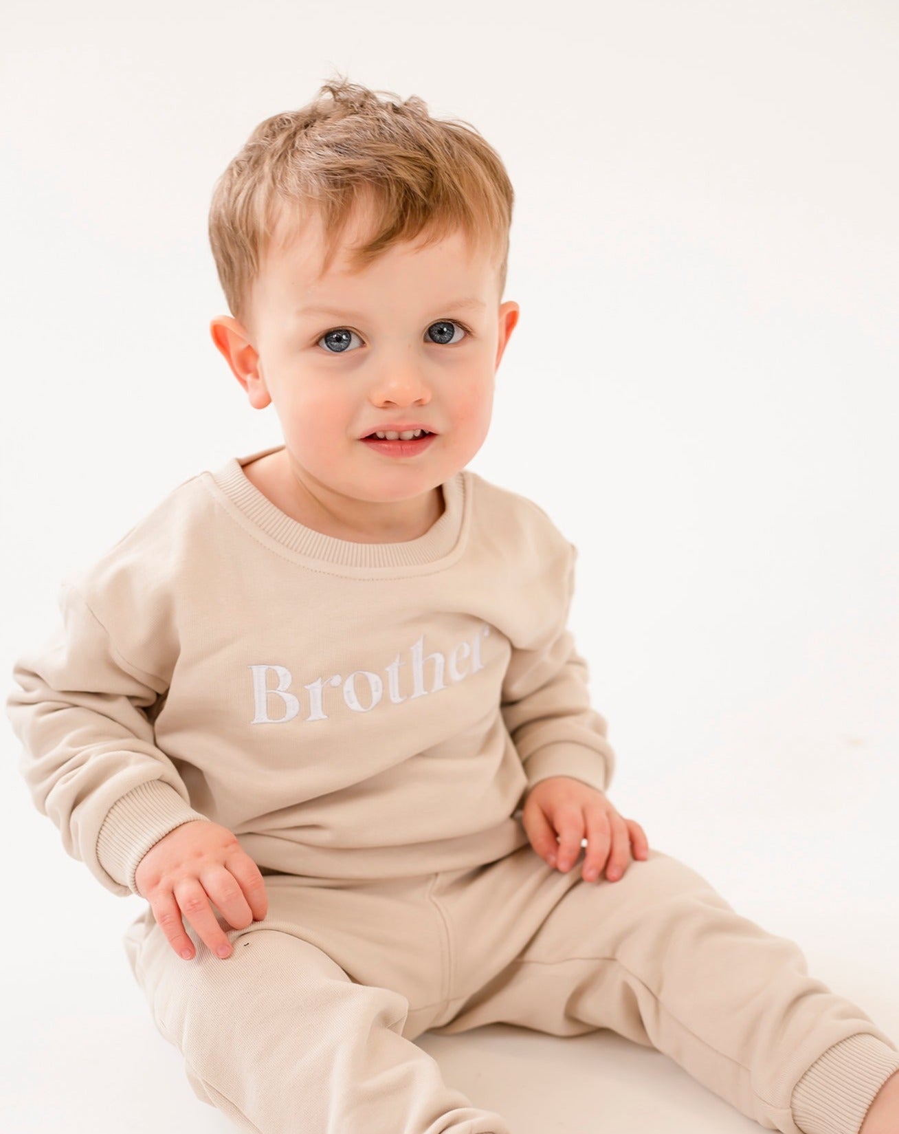 Match siblings in this embroidered 'brother' sweatshirt. Model wears stone sweatshirt with ivory font colour but a range of colours are available.