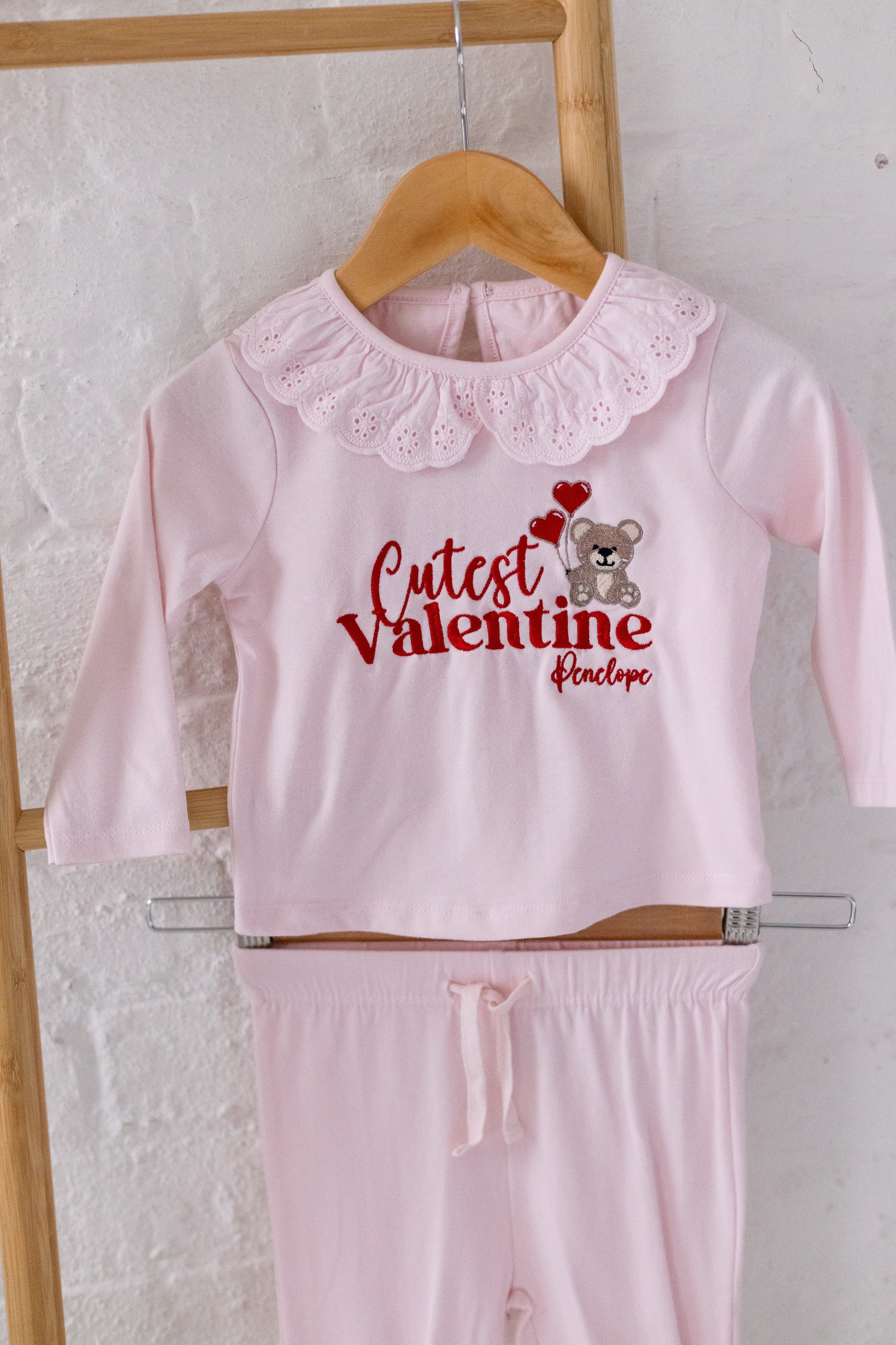 'Cutest Valentine' embroidered personalised frill collar pyjamas