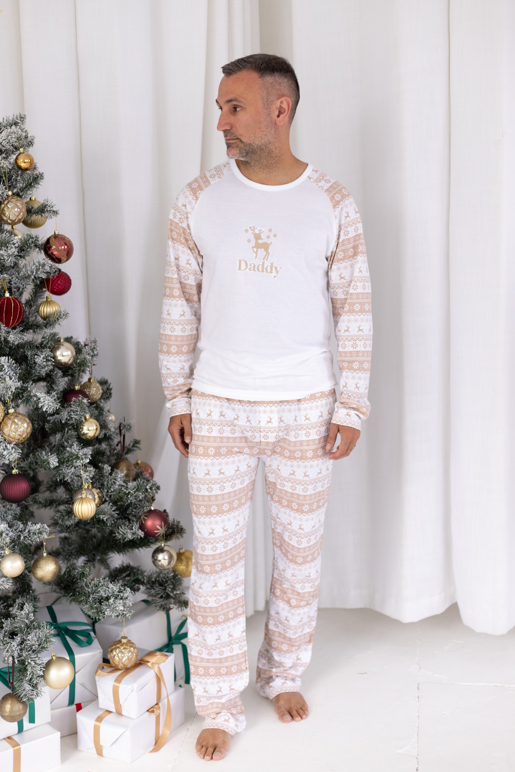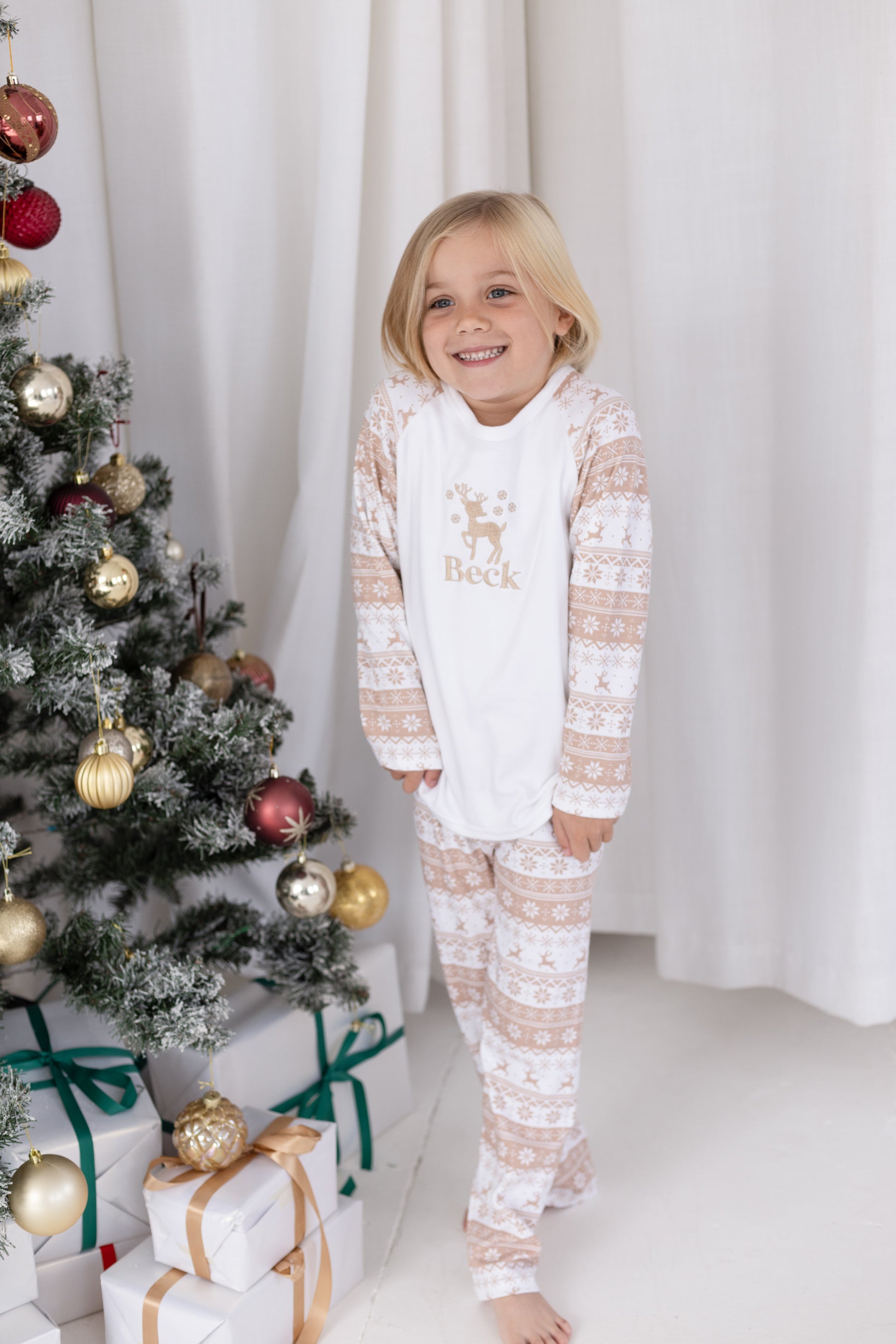 Our family Christmas personalised reindeer fair isle pyjamas are perfect for all the family, shoppable in ladies, men's and kids up to age 9-10. The gorgeous neutral colour palette is a must for anyone who wants to try something a little bit softer than the traditional Christmas pyjama sets.