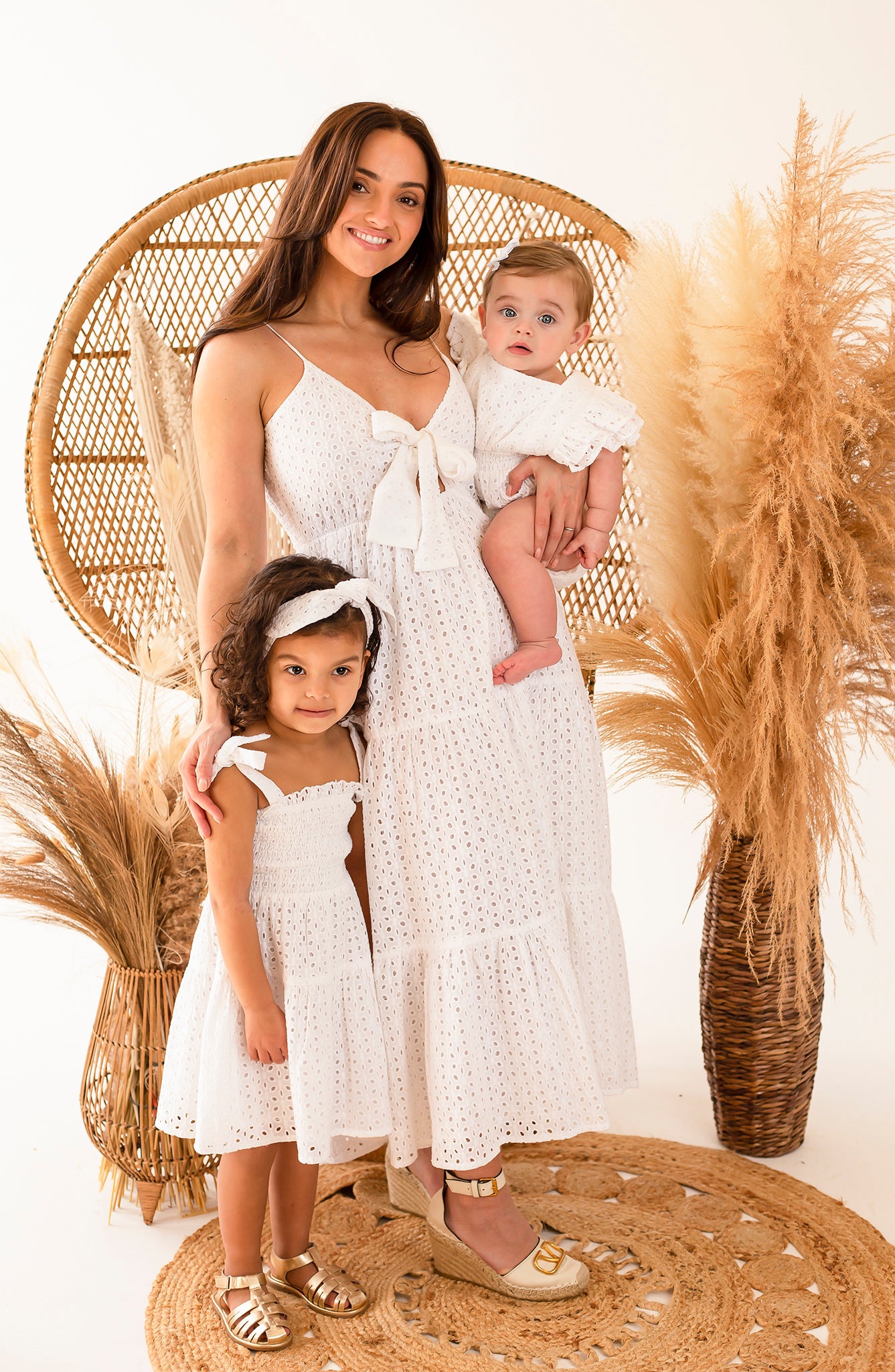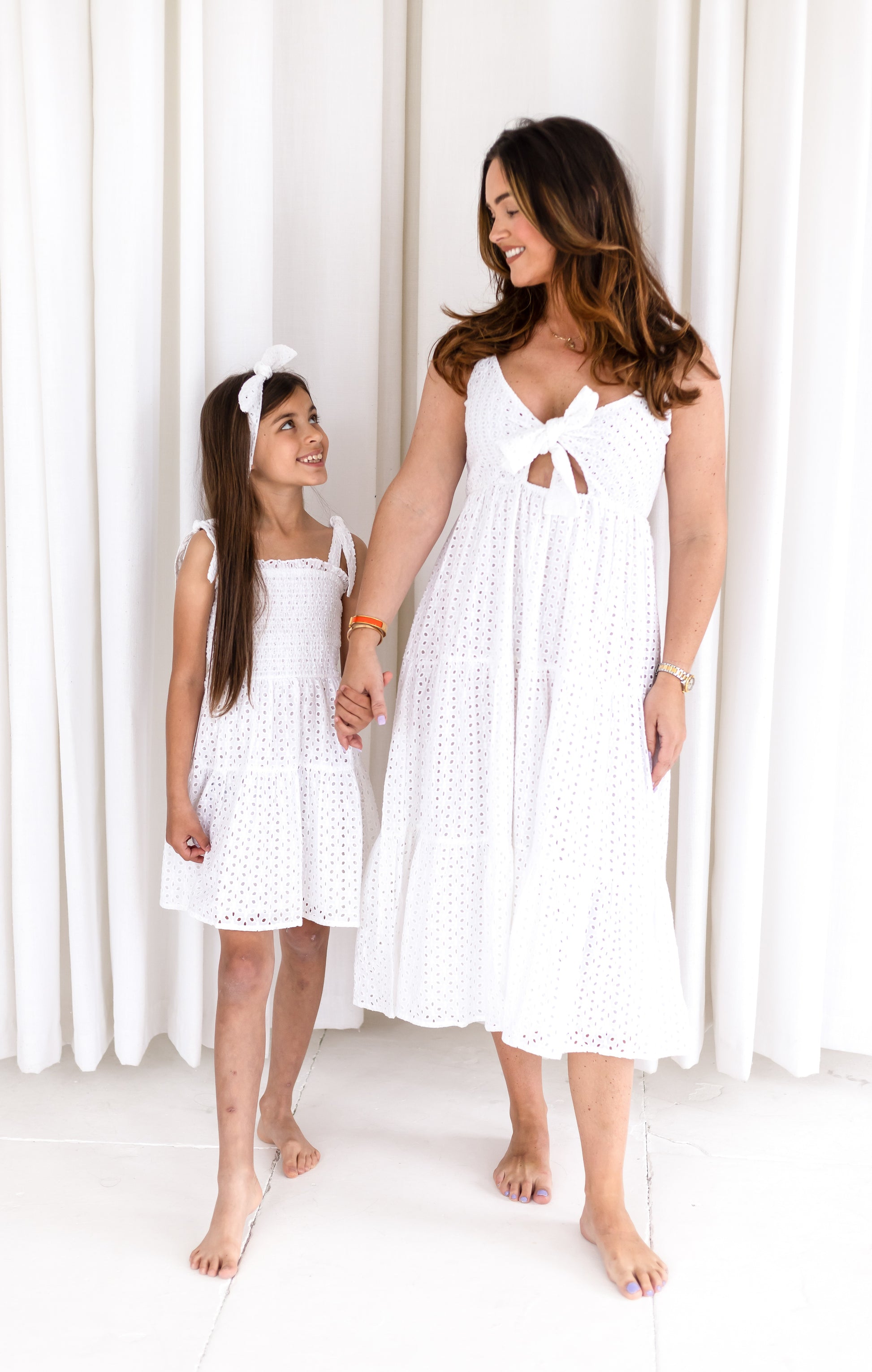 Your mini can match with you in this gorgeous broderie anglaise strappy dress. Style has fixed ties on the shoulders and tiers on the skirt section to give fullness.
