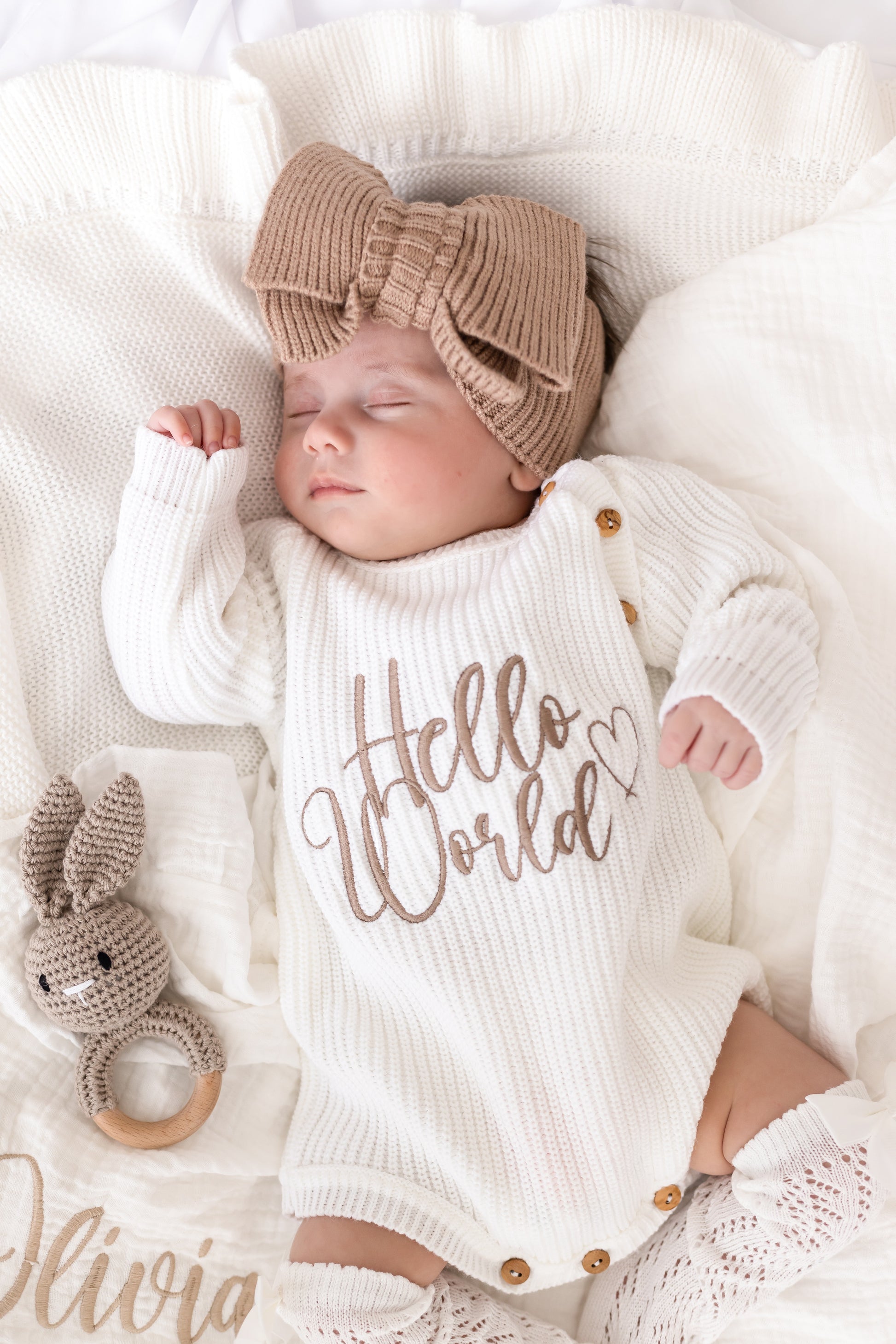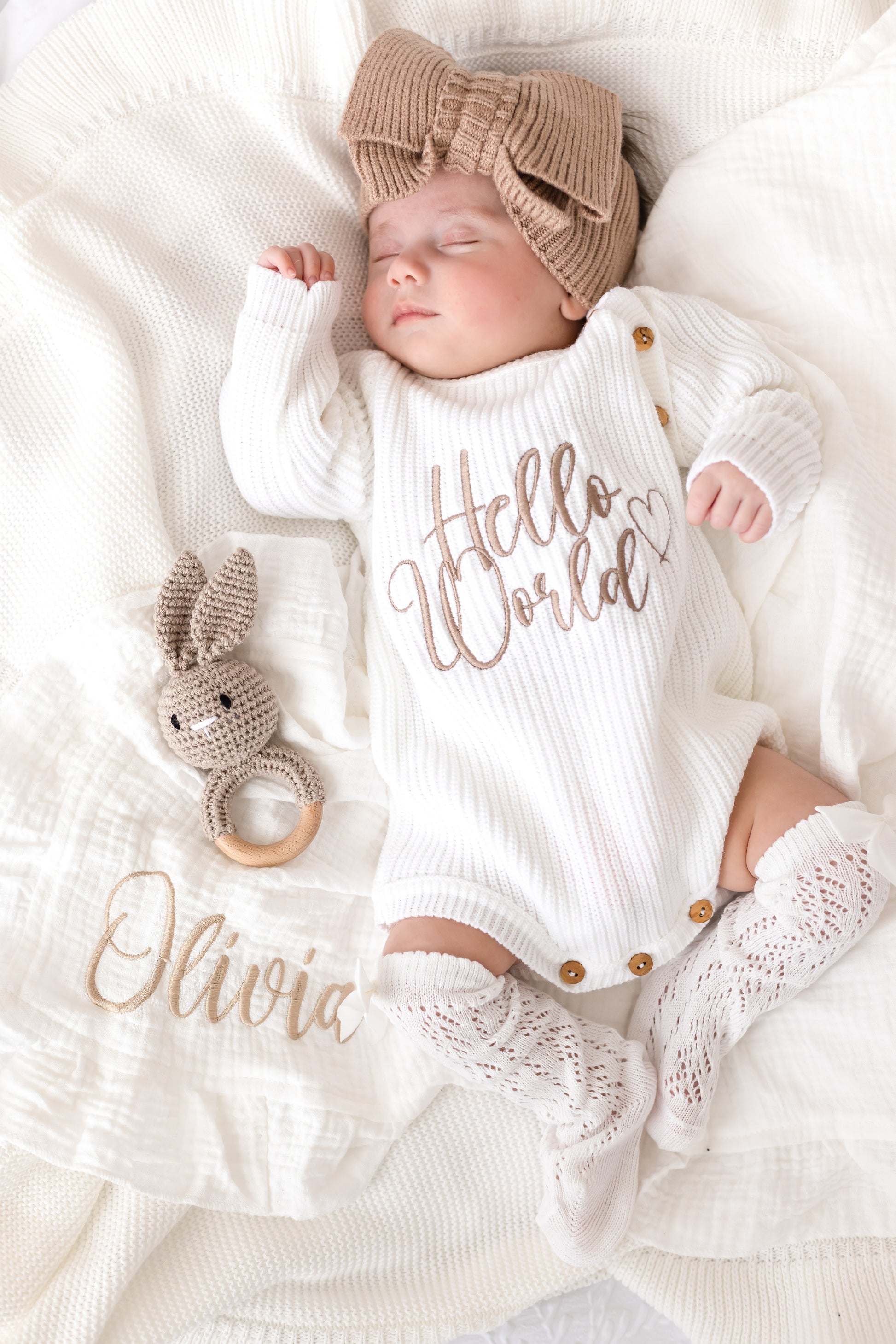 Imagery shows the white romper with copper thread which makes a great unisex announcement.
