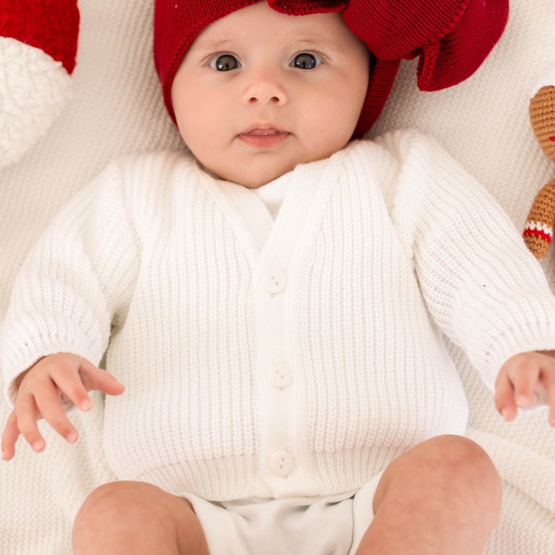 Addison imagery shows the white cardigan with dark pink thread. Olivia is white with soft gold thread and Selena is white with copper.