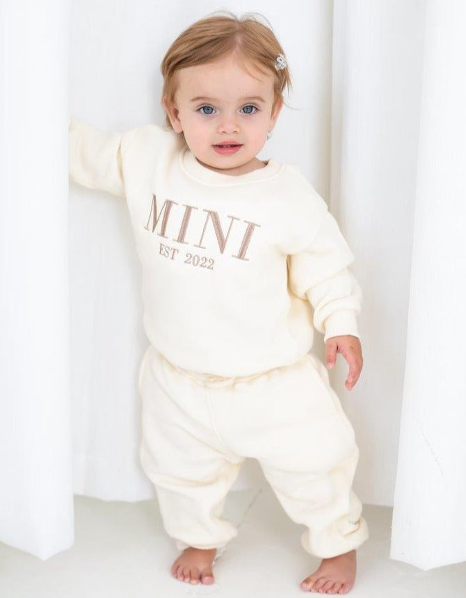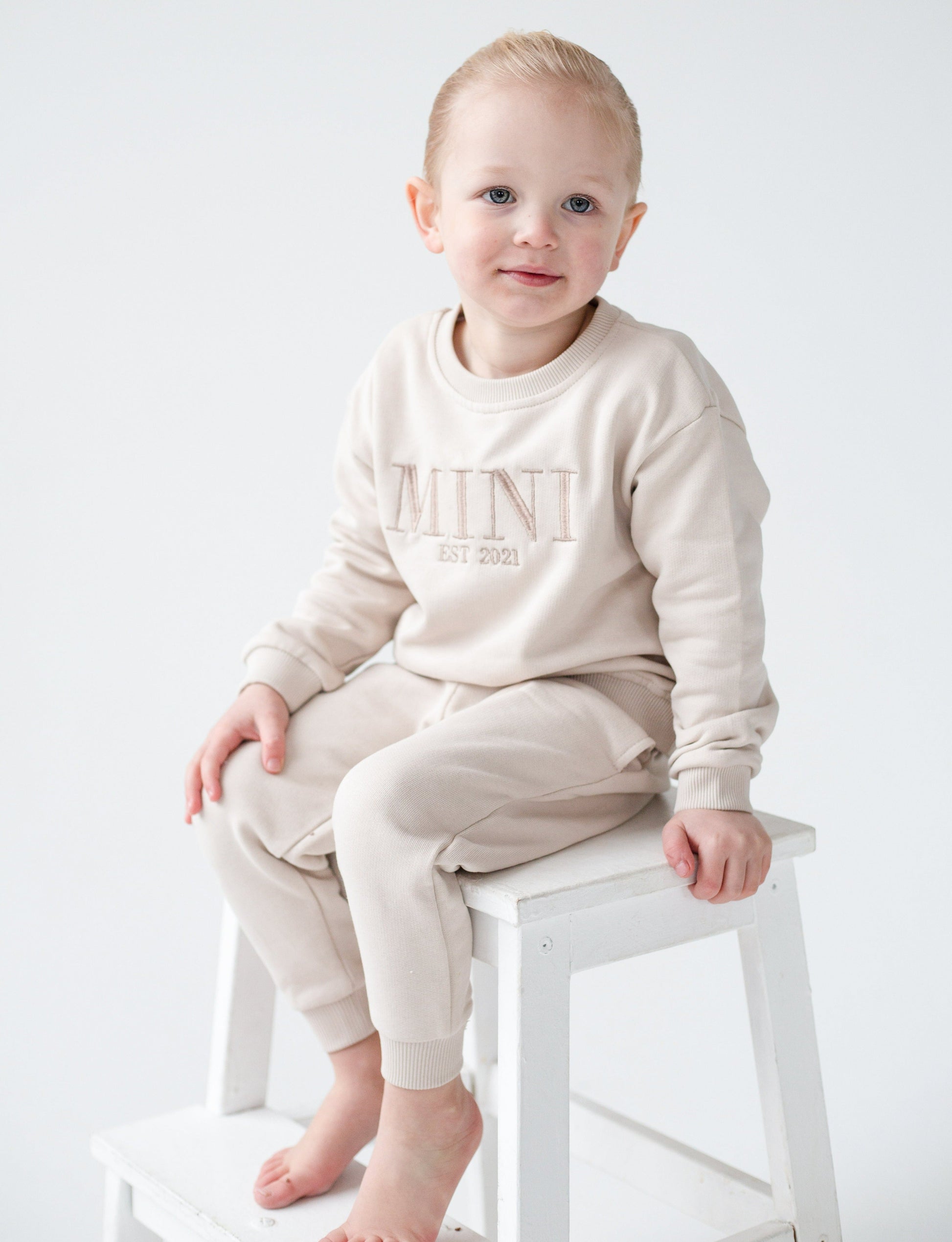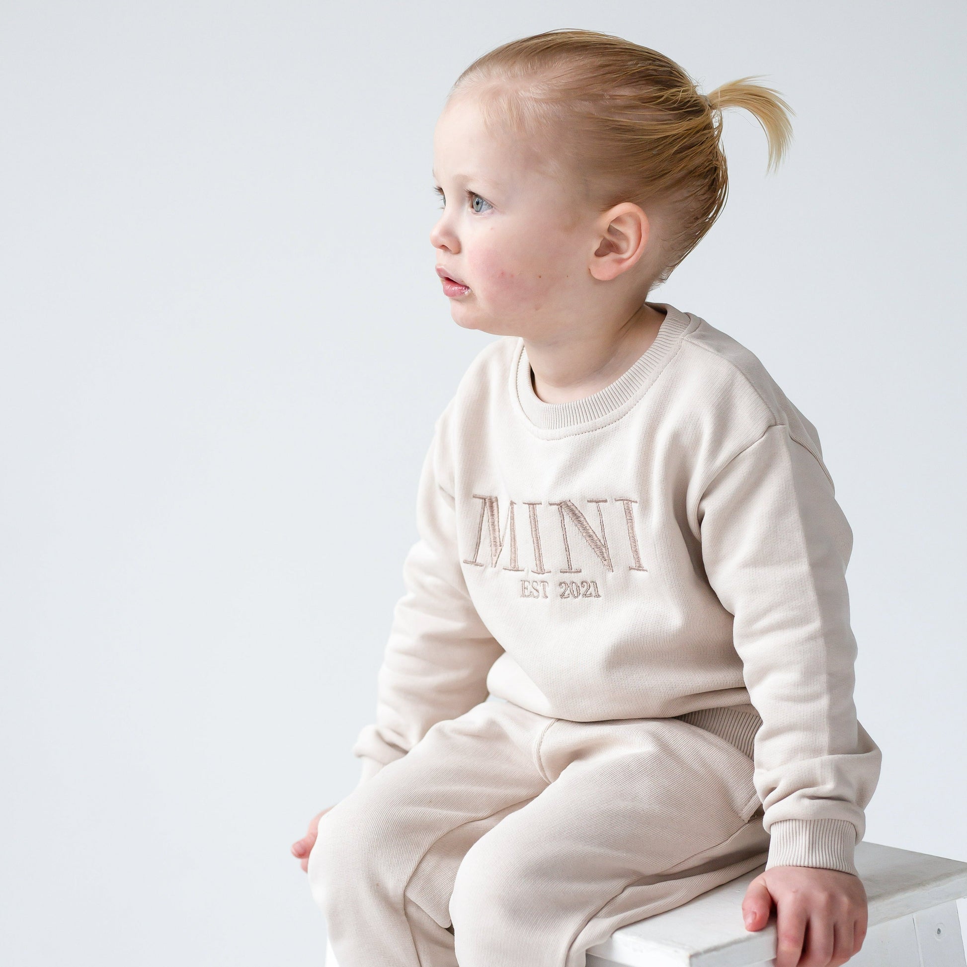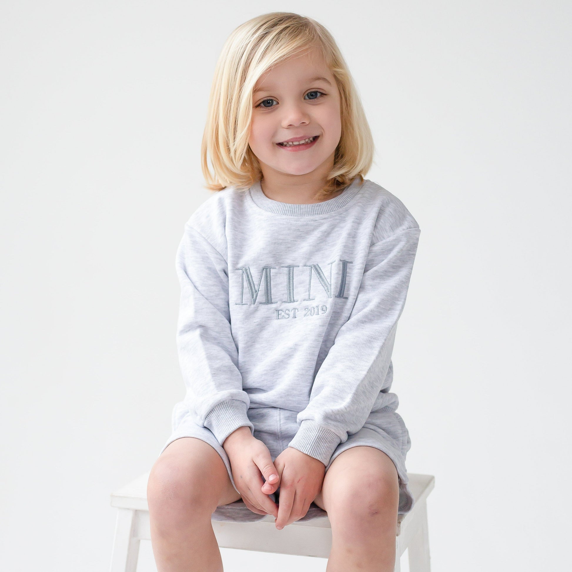Your mini can match with you in this 'MINI EST.' personalised embroidered sweatshirt. Model wears stone sweatshirt with copper thread. Supporting imagery shows ash grey with slate and vanilla with copper. Full range of colour combinations available.