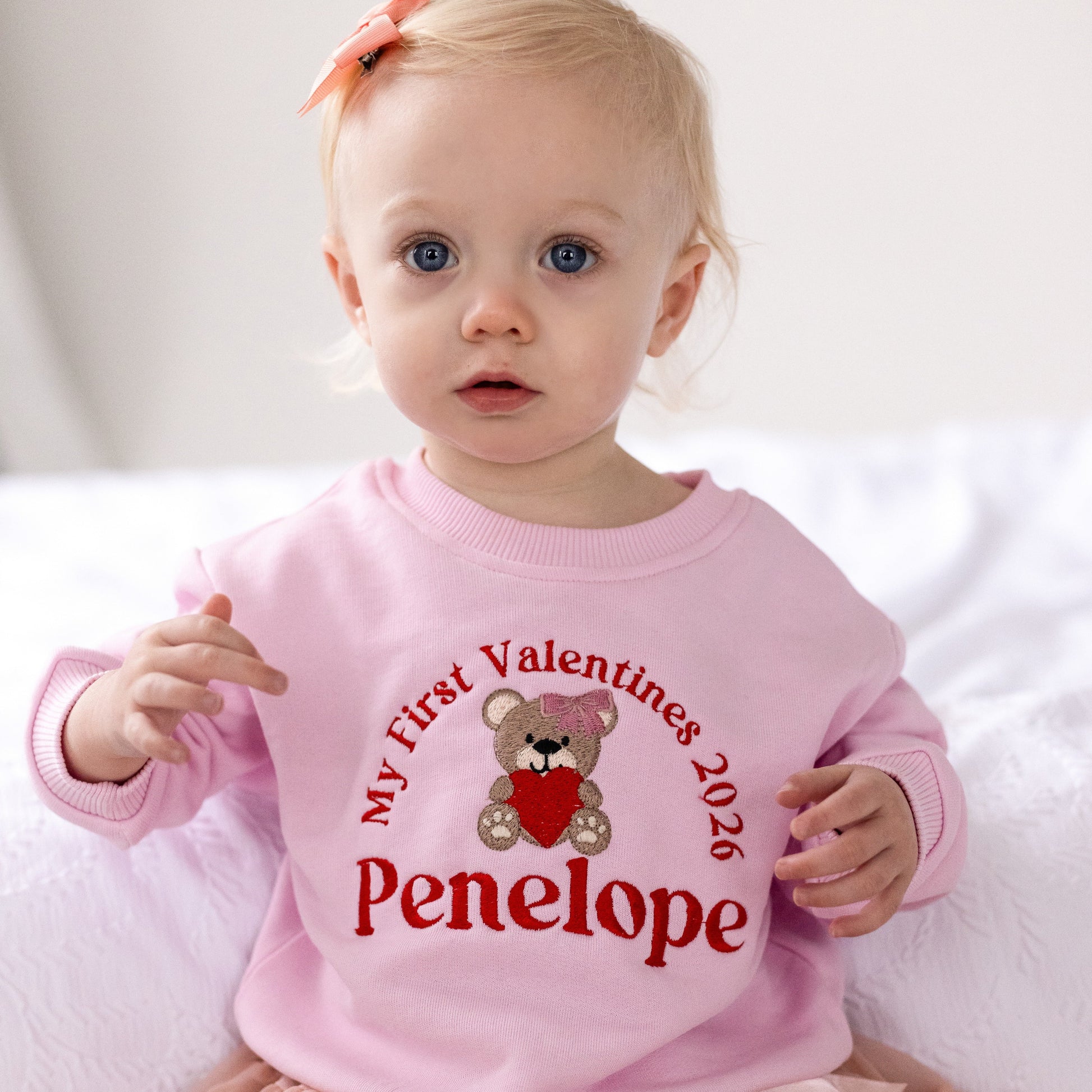 Celebrate your little one's first Valentines this year with this gorgeous embroidered personalised sweatshirt. Text reads 'My First Valentines 2026' with the child's name underneath and a bear design.
