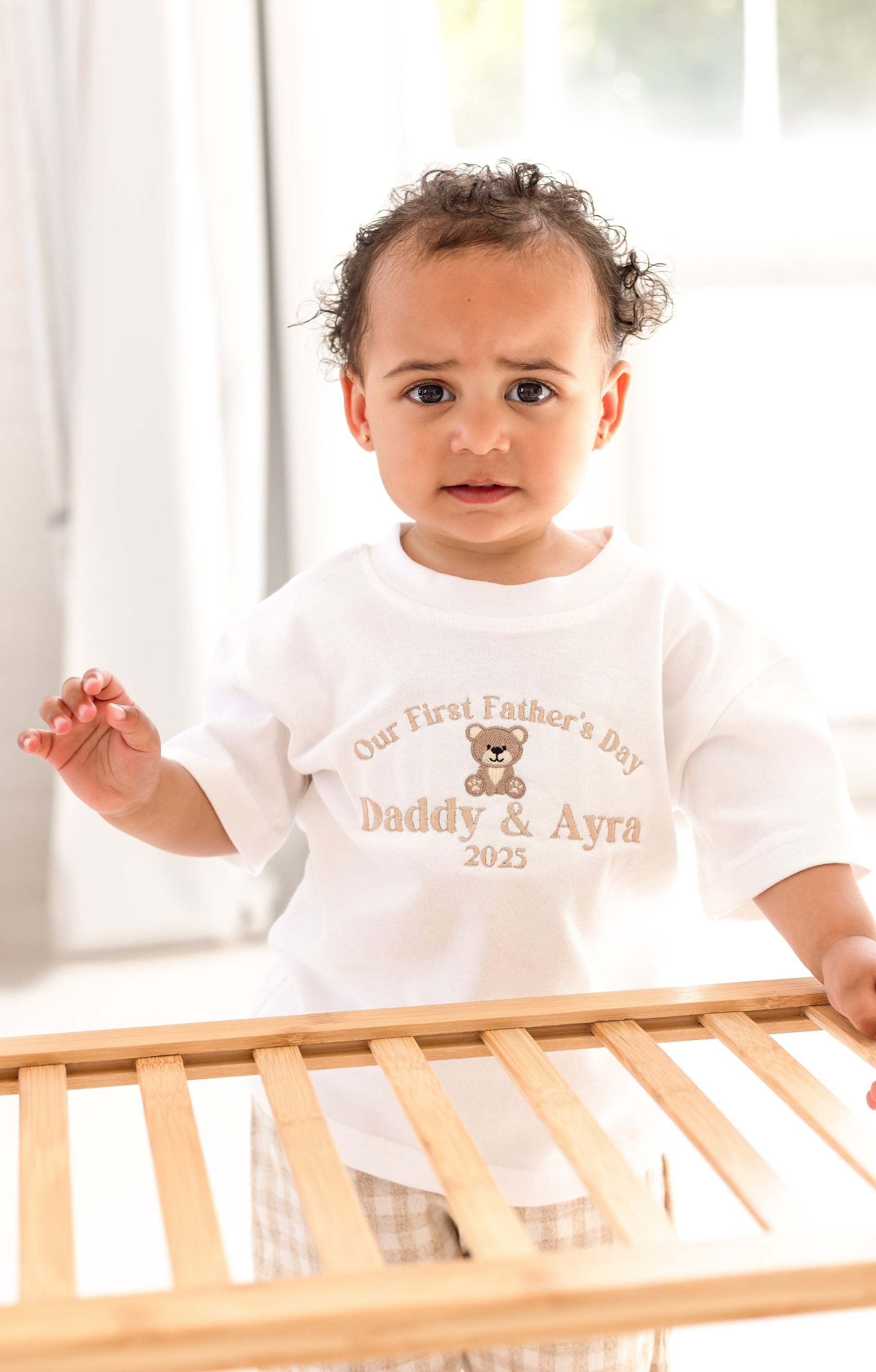 The perfect way to announce a new addition to the family. This embroidered t shirt is blue with copper thread but is also available on an ivory or pink base. In terms of thread colour, if you order blue or pink the thread colours will be exactly as per blue imagery. If you order ivory we will lift the font colour to be soft gold (as per father's day supporting image). For anything bespoke to this please reach out via instagram or the message function on the website. Image included to show the pink t shirt and short set in a different design just so you can see the base colour.
