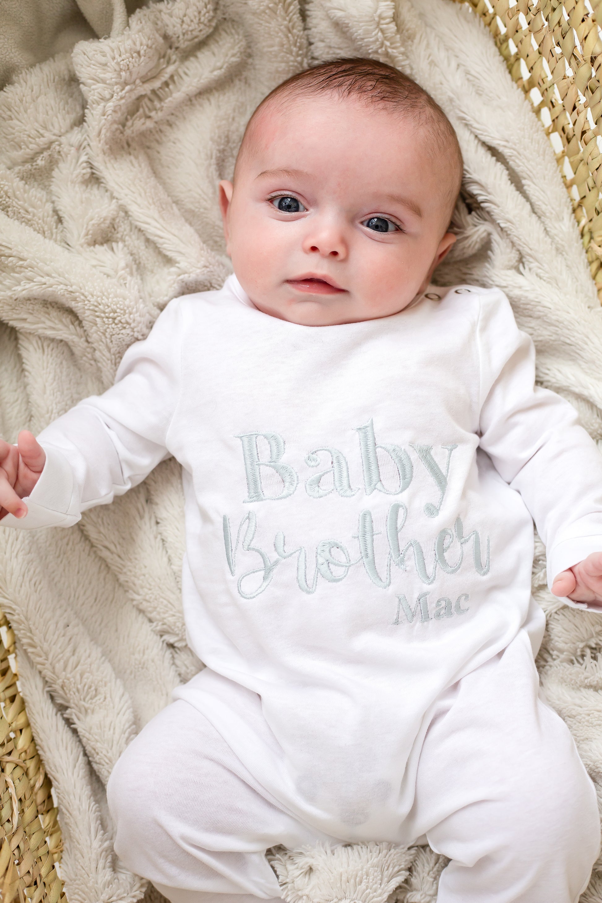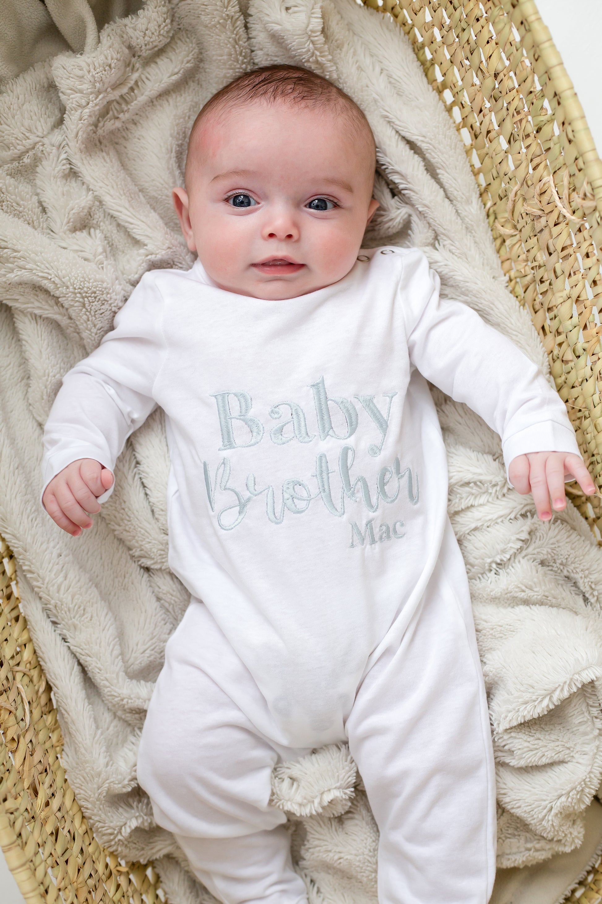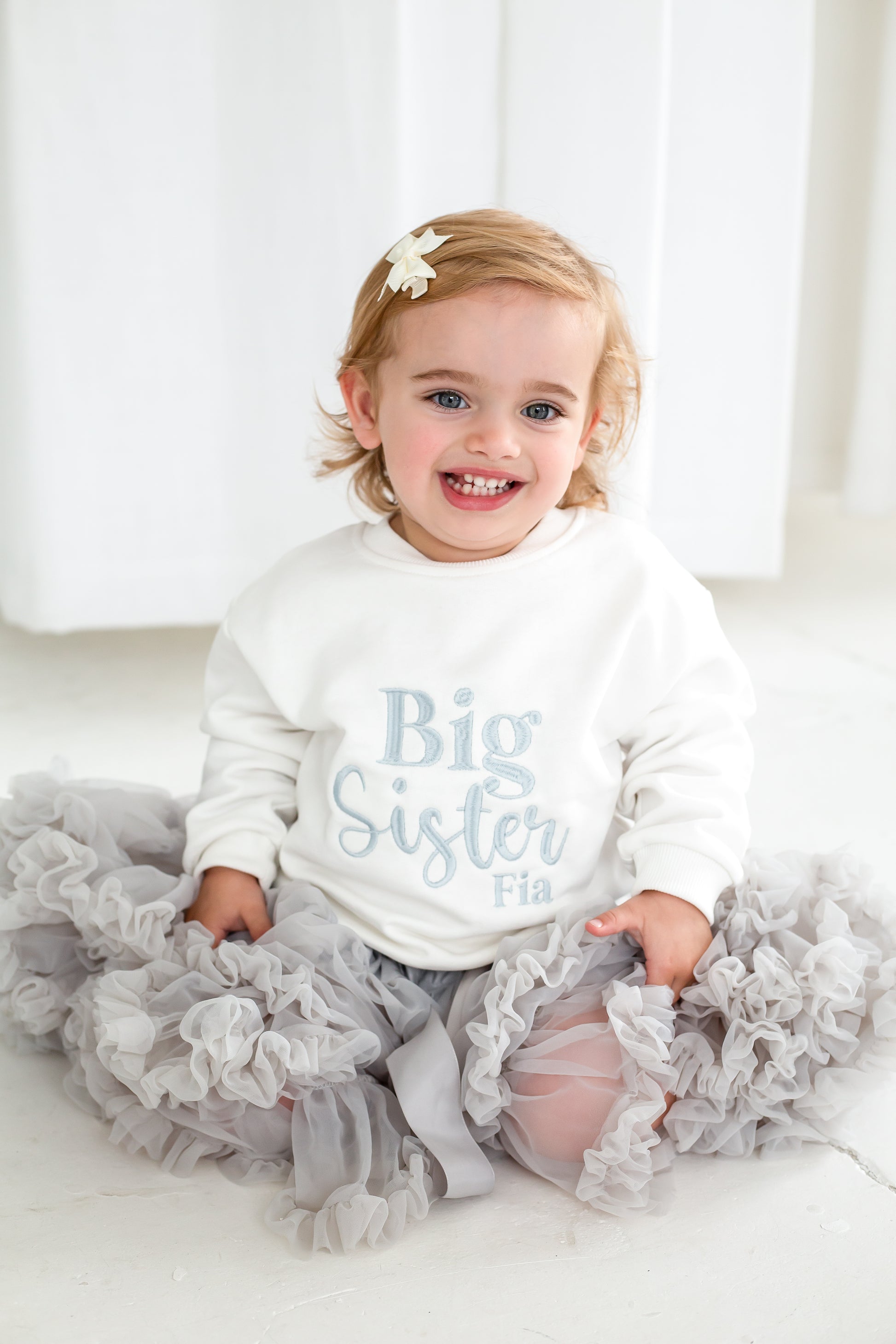 Gorgeous way to celebrate a new arrival and their role within the family and relationship to their siblings. Embroidery matches to 'Big brother and Big sister' personalised sweatshirts to really make a lovely statement. Base colour is fixed as ivory as image but please select from a choice of thread colours- please choose ivory sweatshirts too if youd like to make the same colour combination for an older sibling. Model wears ivory with silver grey thread.