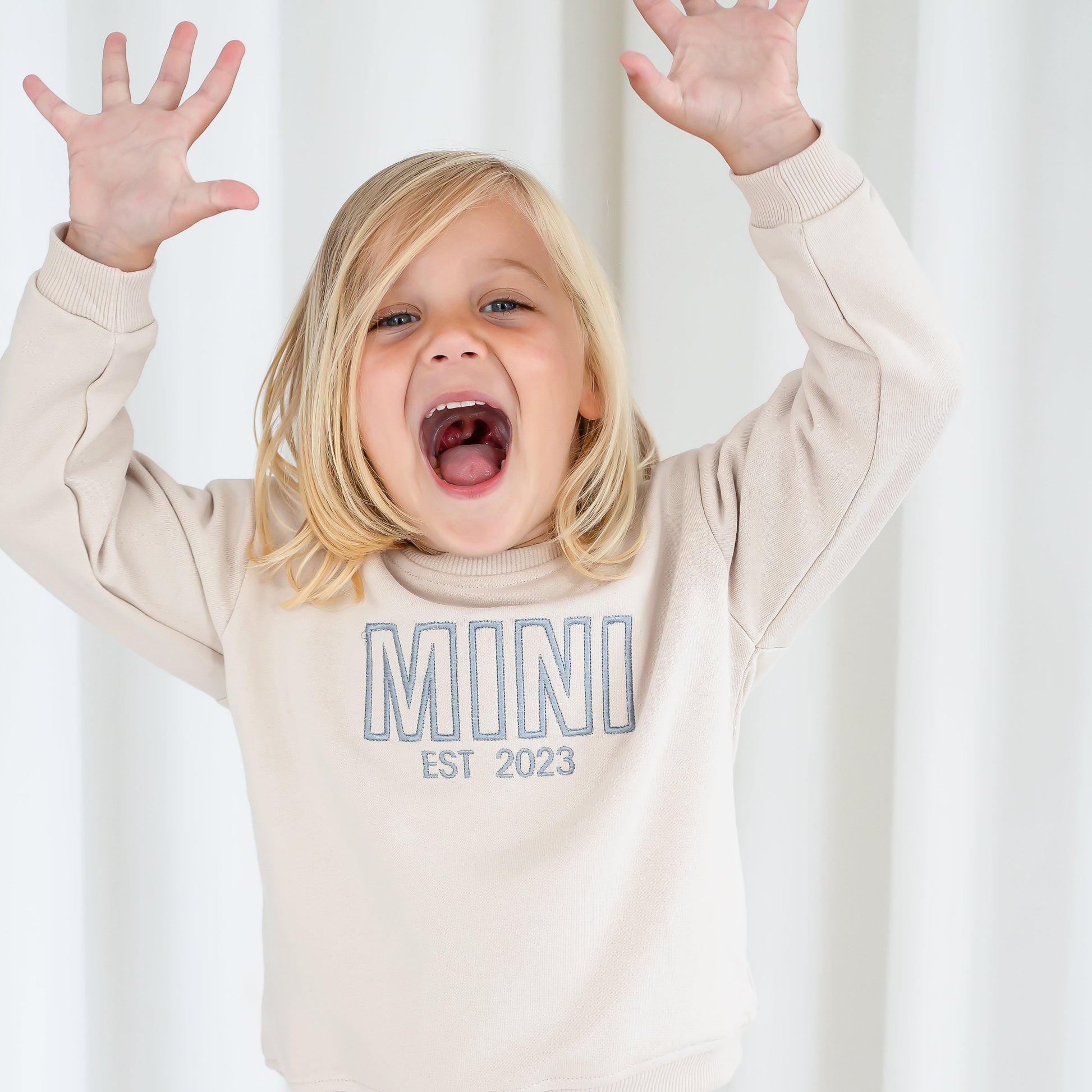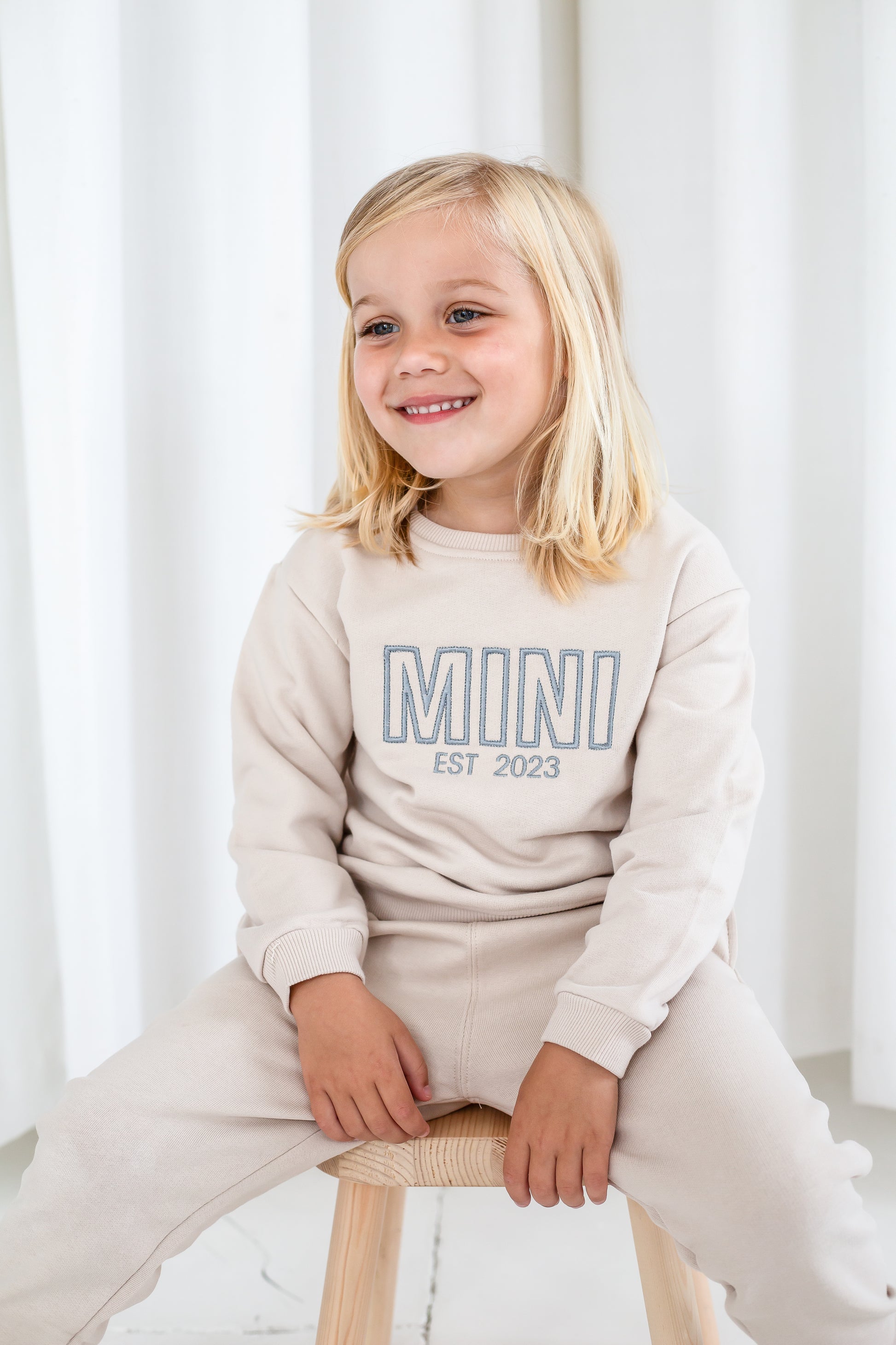 Your mini can match with you in this outline style 'MINI embroidered sweatshirt. Leading image shows stone with slate thread. Supporting imagery shows the hoodie version in ivory with silver grey thread. This style is available in a range of colours and thread choices. Model wears our stone matching joggers. Underneath the word MINI it is personalised with 'Est' to represent the year of your child's birth. Please enter this in the personalisation box provided.
