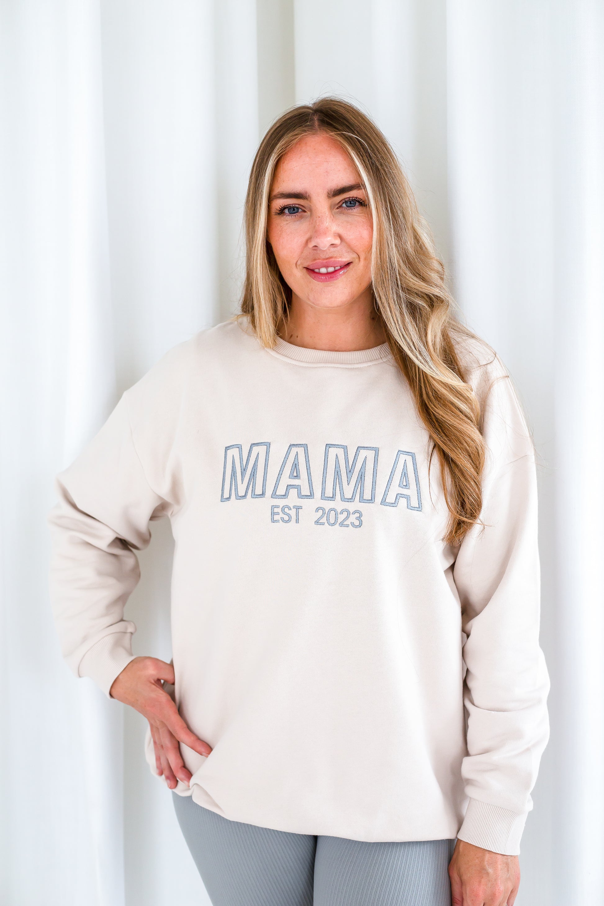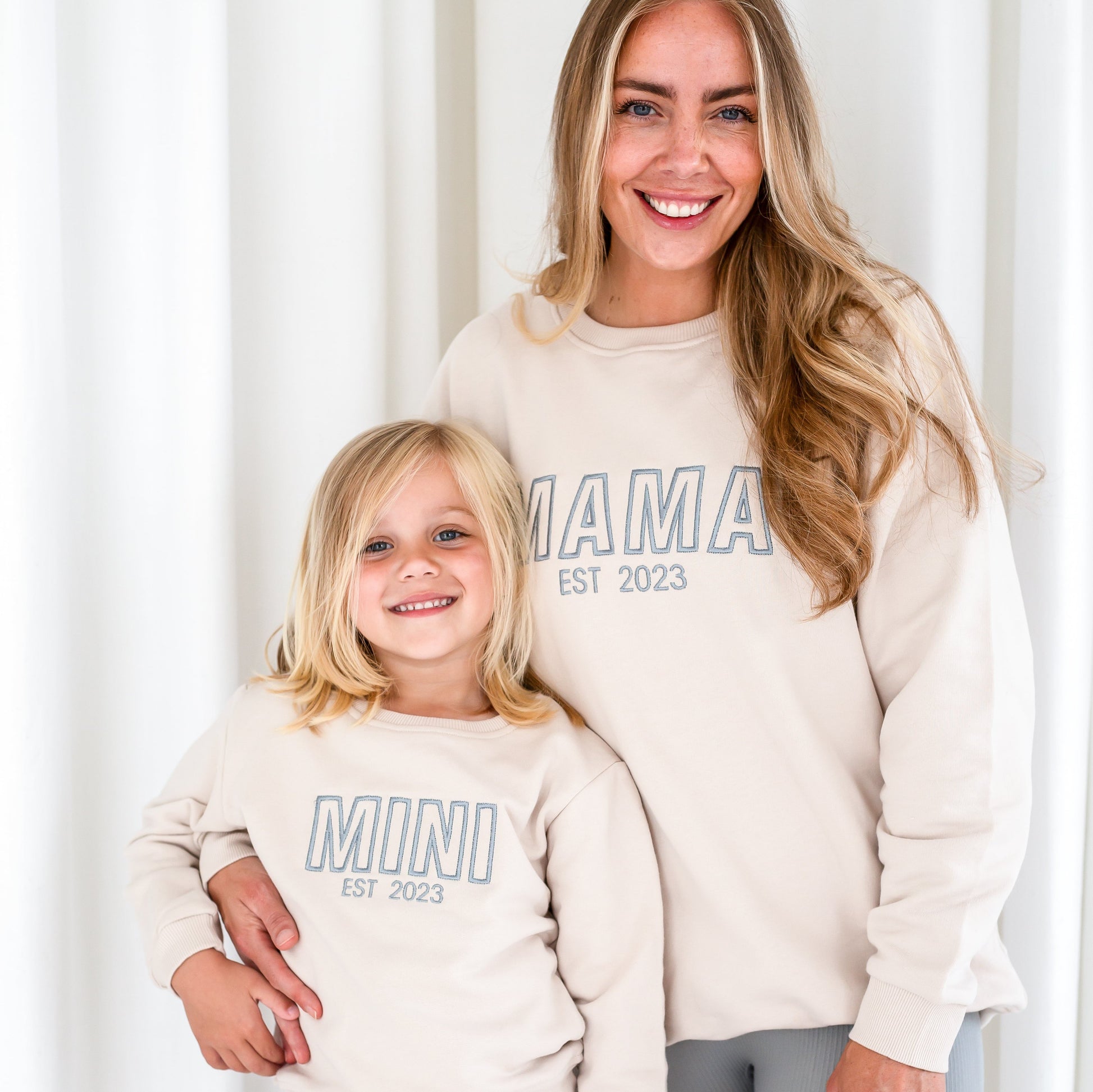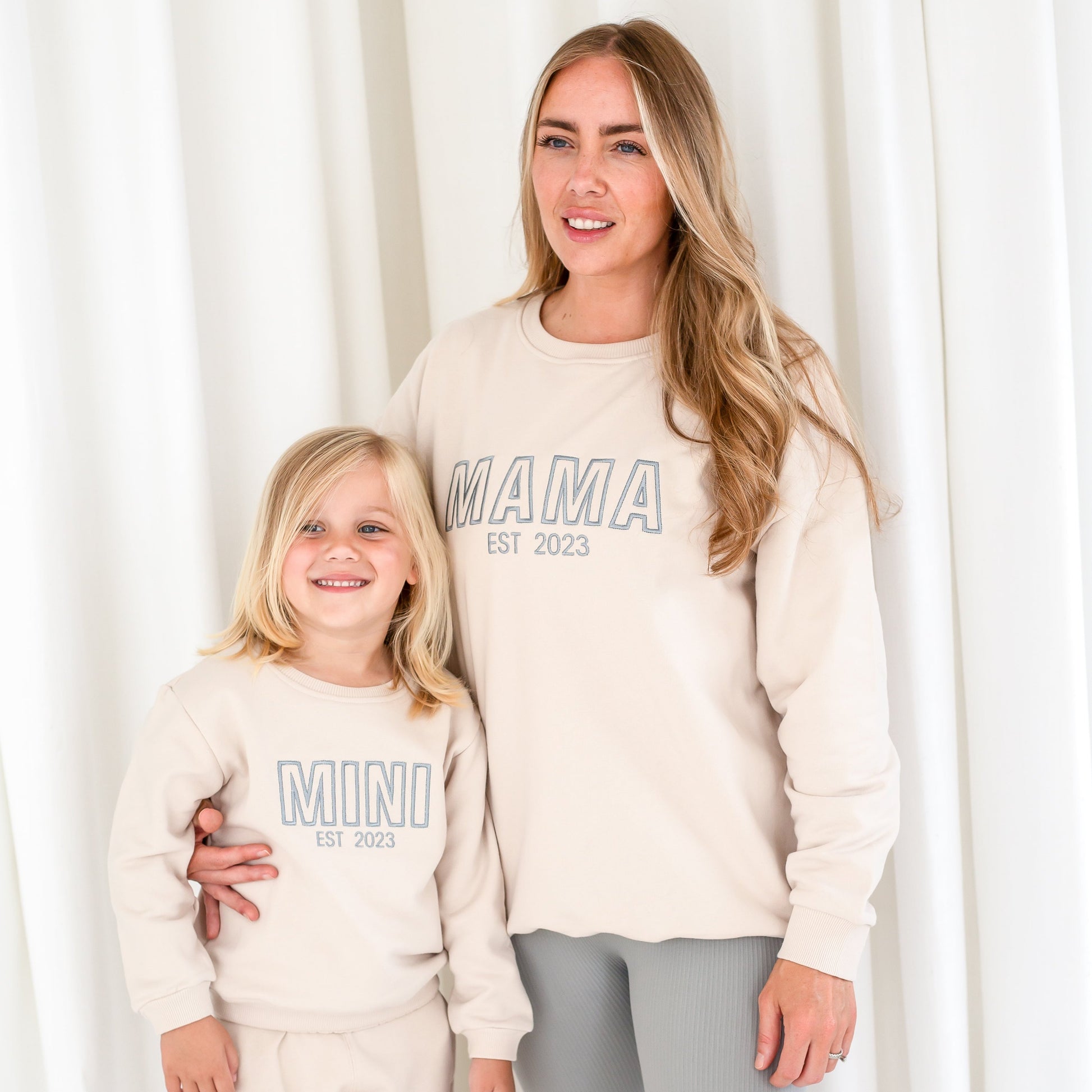 You can match with your mini in this outline style MAMA embroidered sweatshirt. Leading image shows stone with slate thread. Supporting imagery shows the hoodie version in ivory with silver grey thread. This style is available in a range of colours and thread choices. Underneath the word MAMA it is personalised with 'Est' to represent the year of your child's birth. Please enter this in the personalisation box provided.