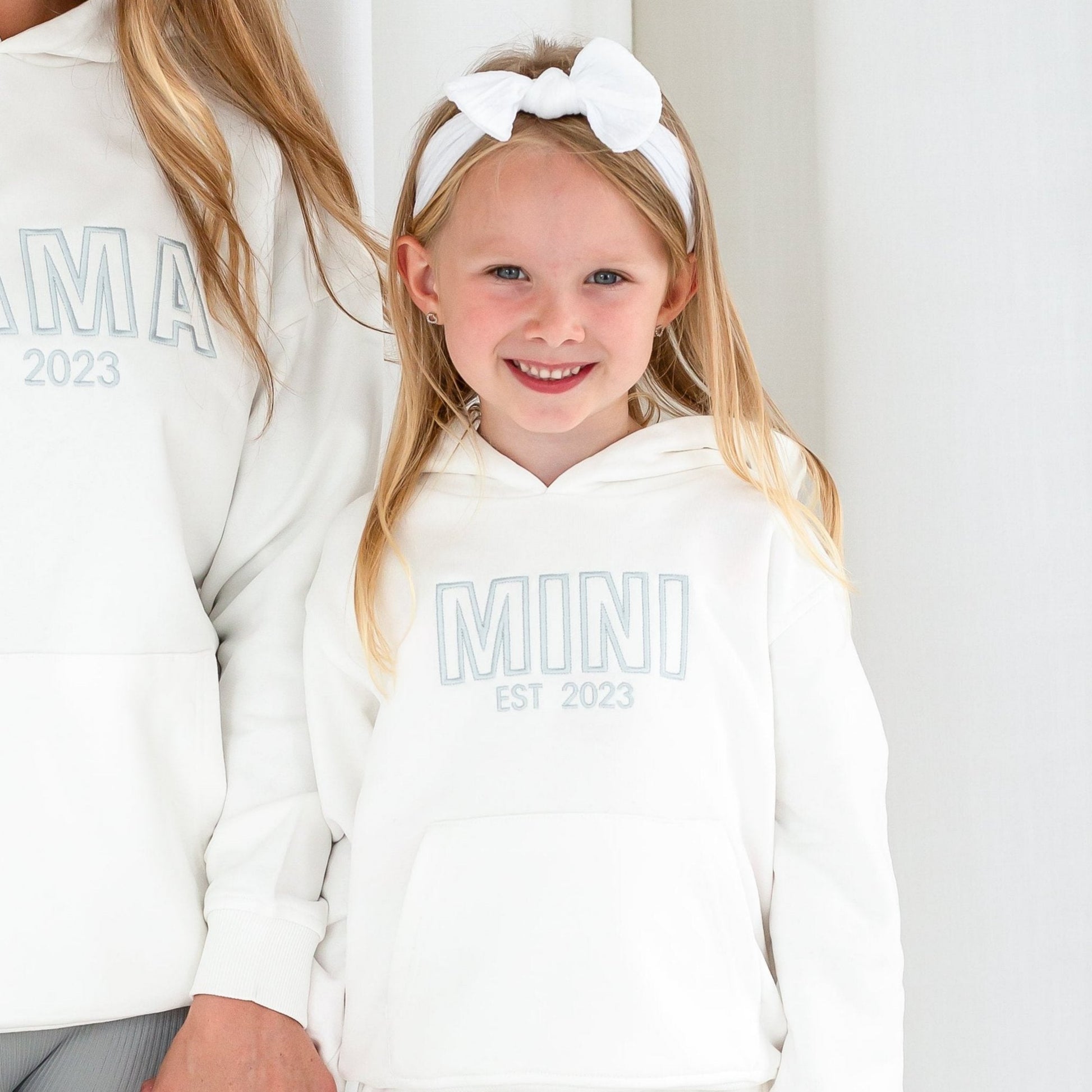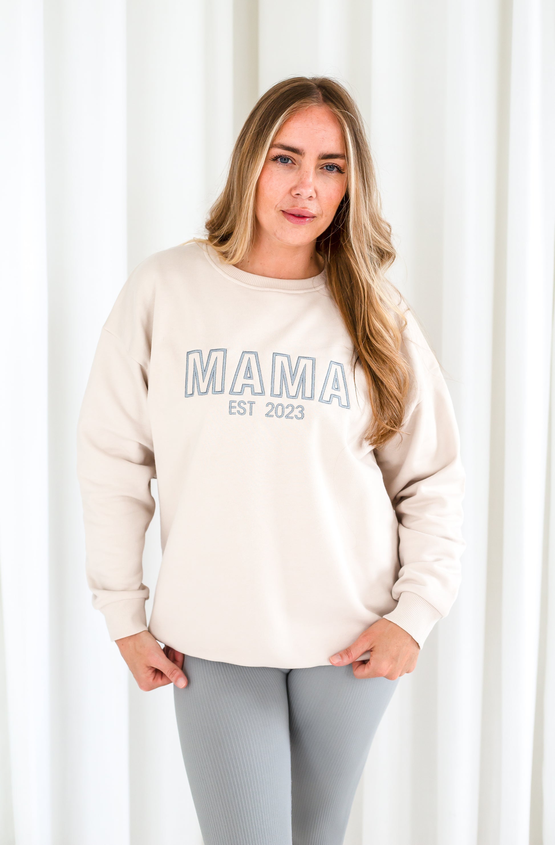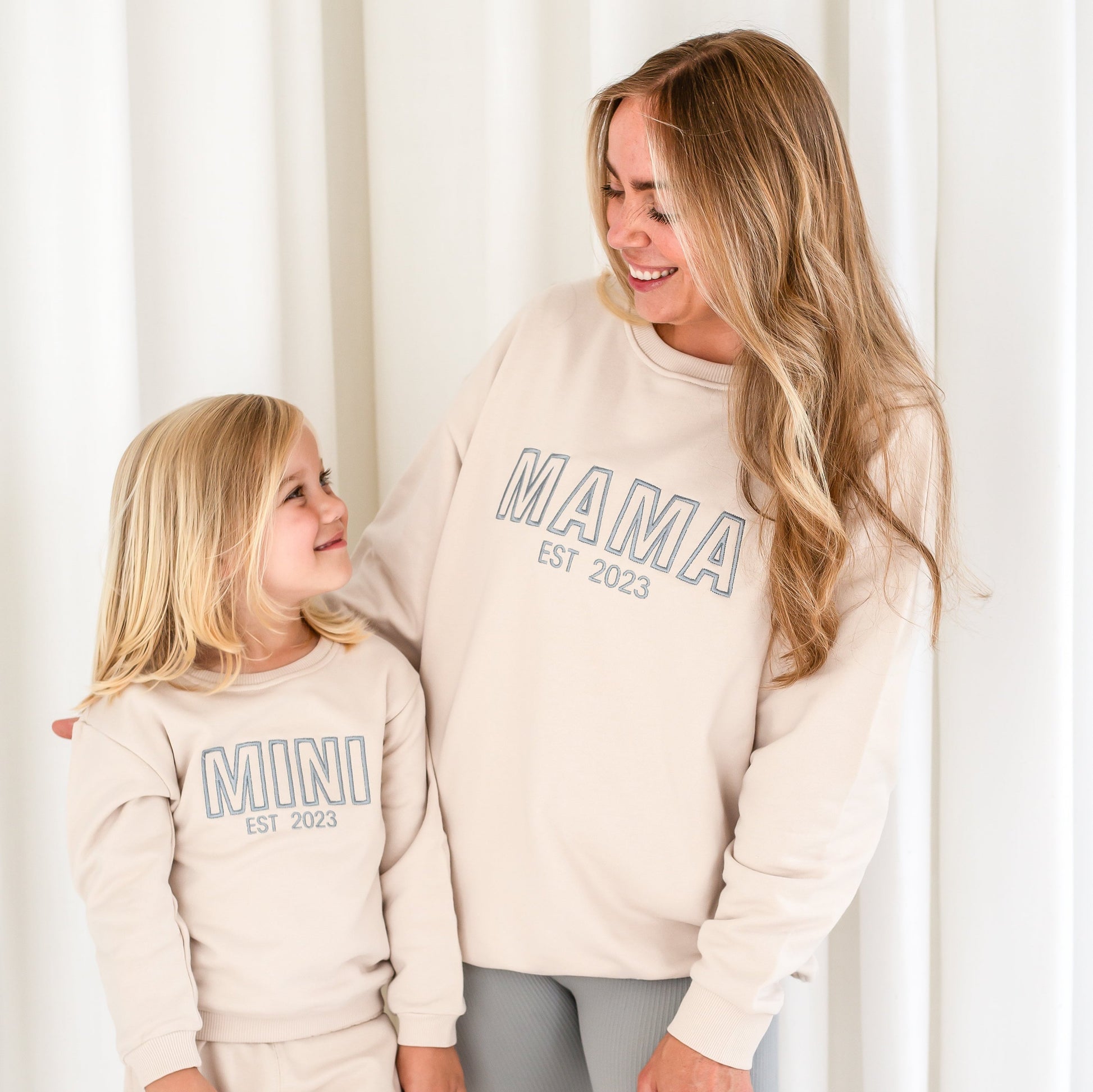 You can match with your mini in this outline style MAMA embroidered sweatshirt. Leading image shows stone with slate thread. Supporting imagery shows the hoodie version in ivory with silver grey thread. This style is available in a range of colours and thread choices. Underneath the word MAMA it is personalised with 'Est' to represent the year of your child's birth. Please enter this in the personalisation box provided.