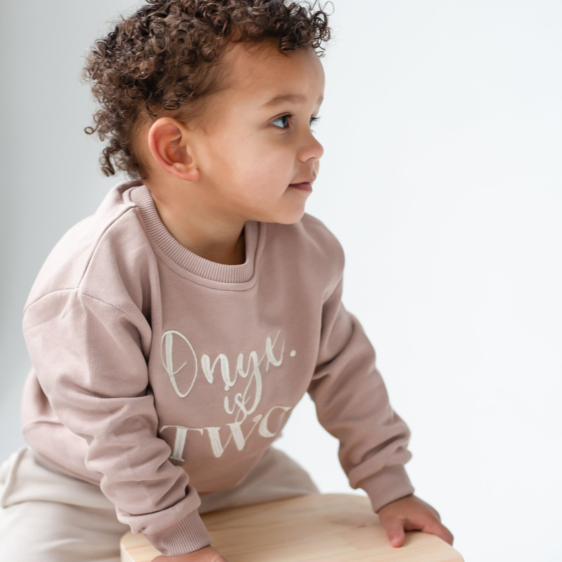 Celebrate this milestone moment with our personalised first birthday sweatshirt. Lead image shows dark rose pink with rose gold thread but full choice of colour combinations available. Supporting imagery shows ivory with rose gold thread and mocha with stone.