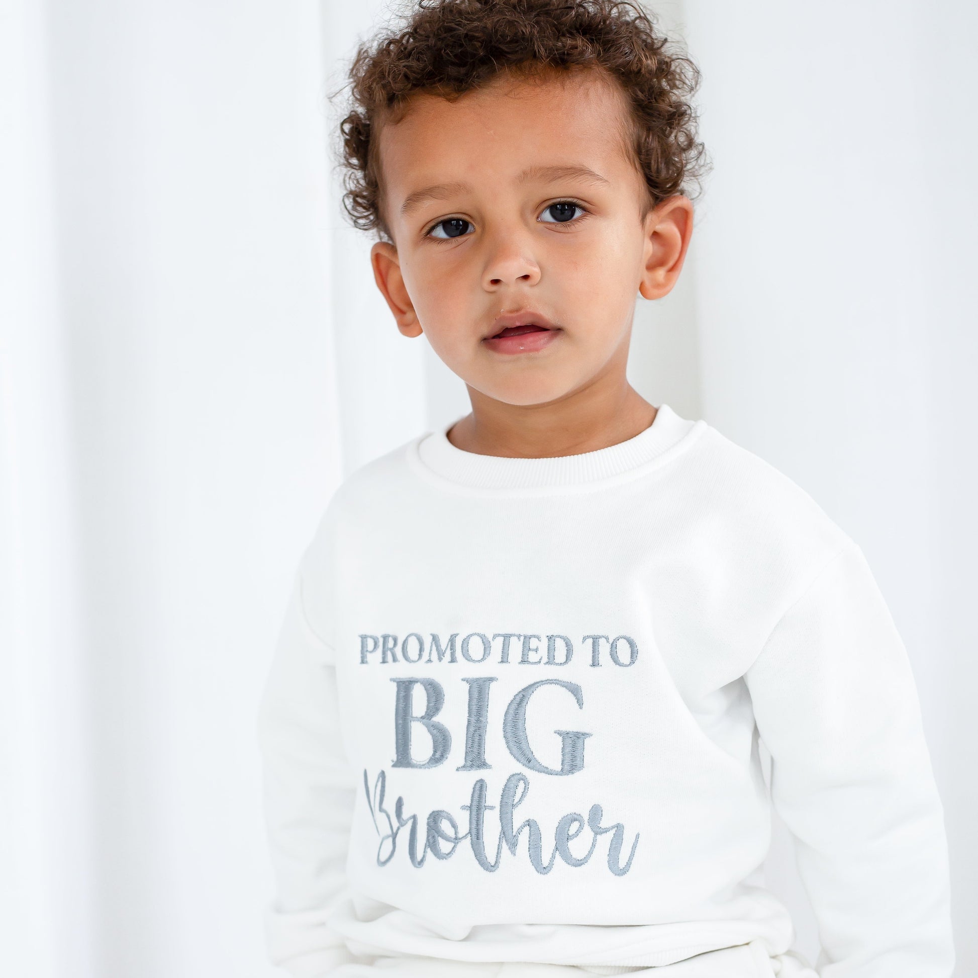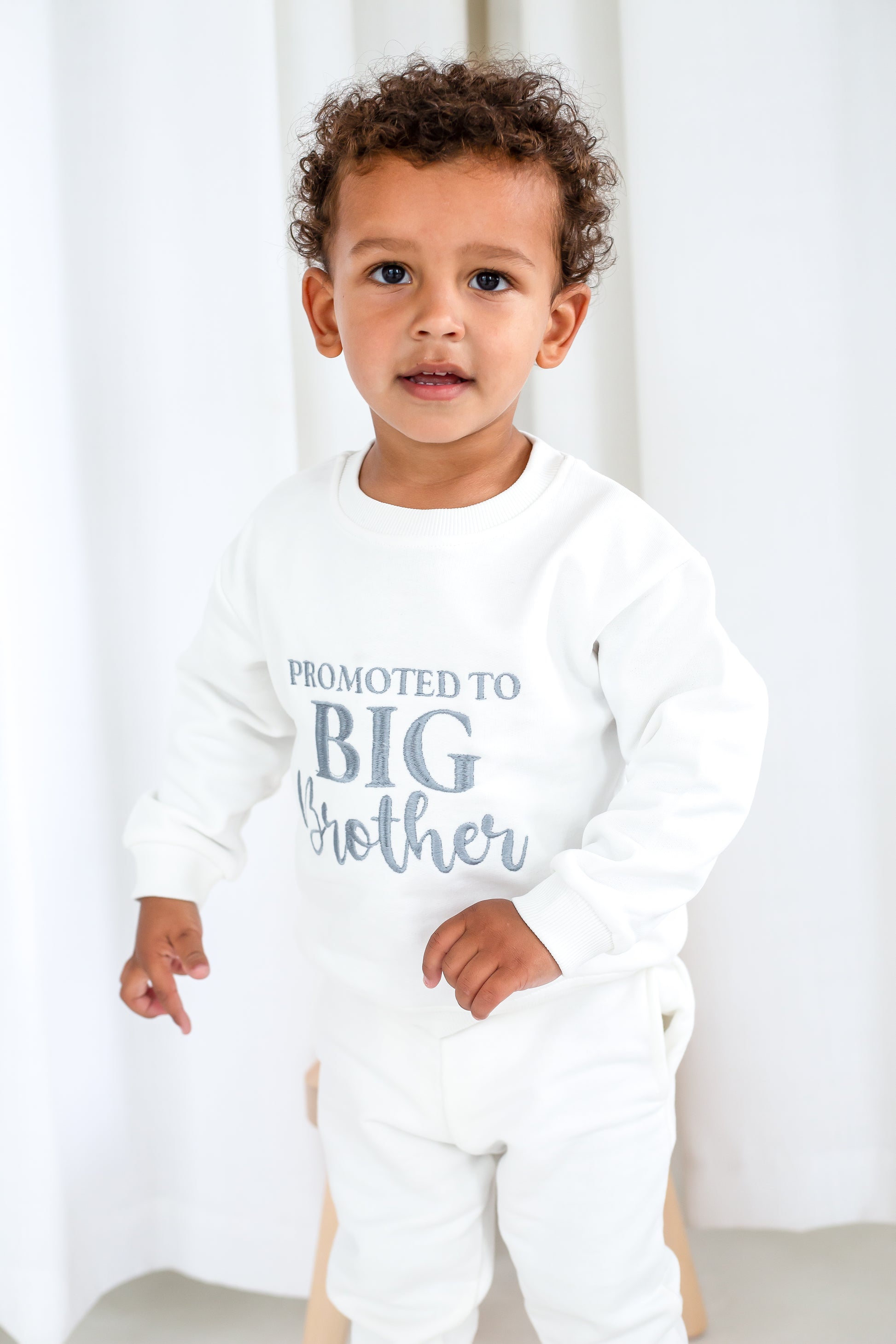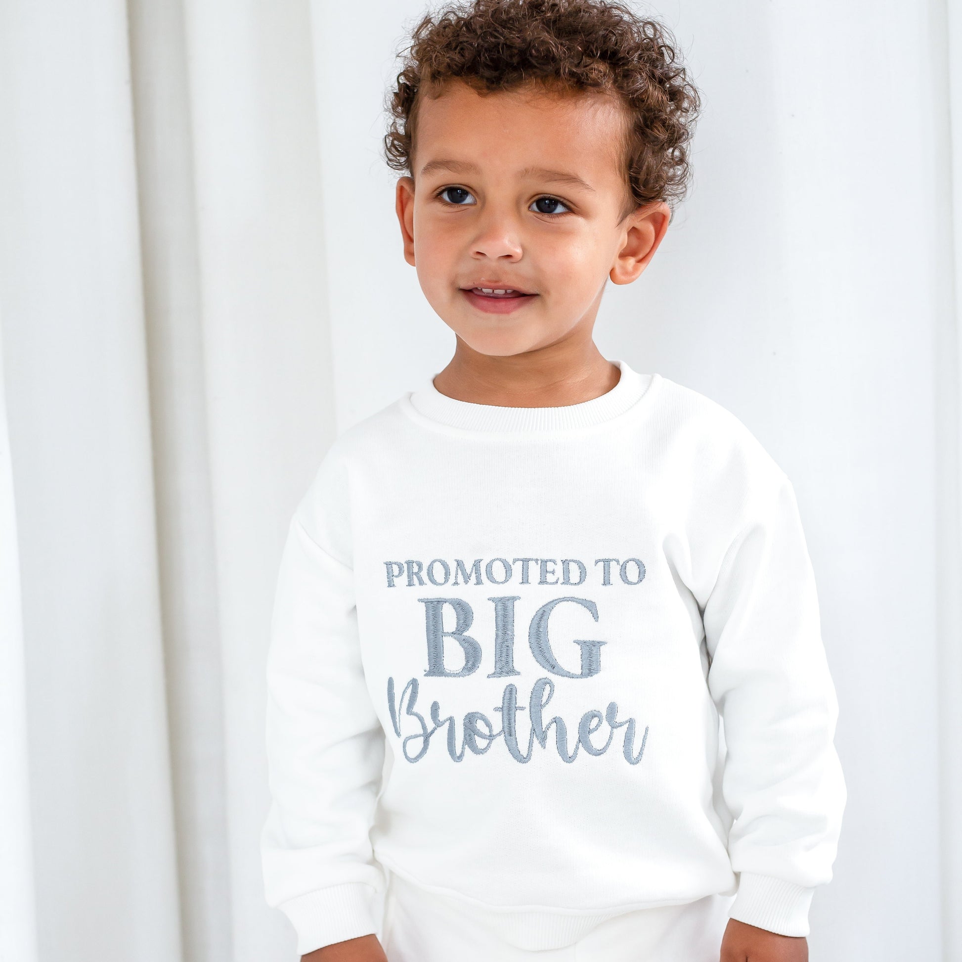 The cutest way to announce a new arrival to the family and to mark your little boys promotion to big brother status. Promoted to big sister also available from the sibling section of the website. Model wears ivory with slate thread but full choice of colours available.