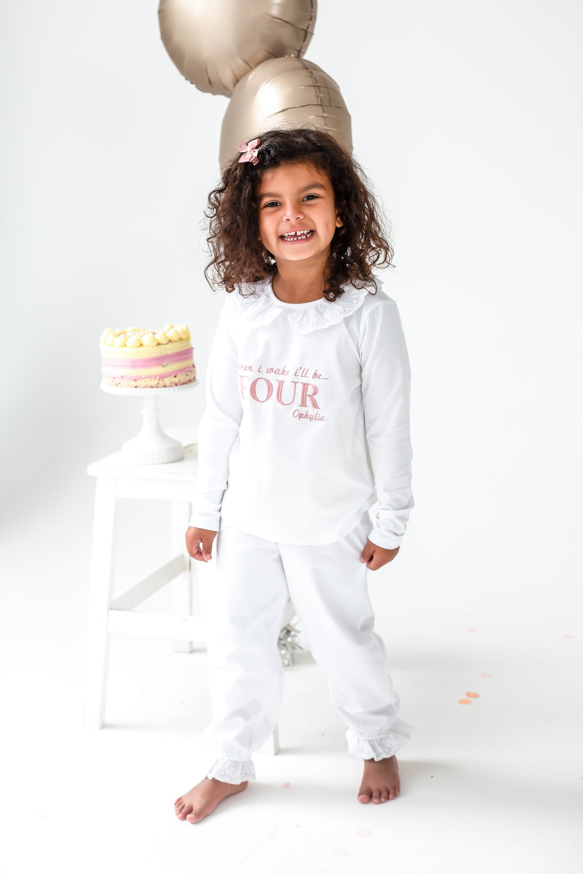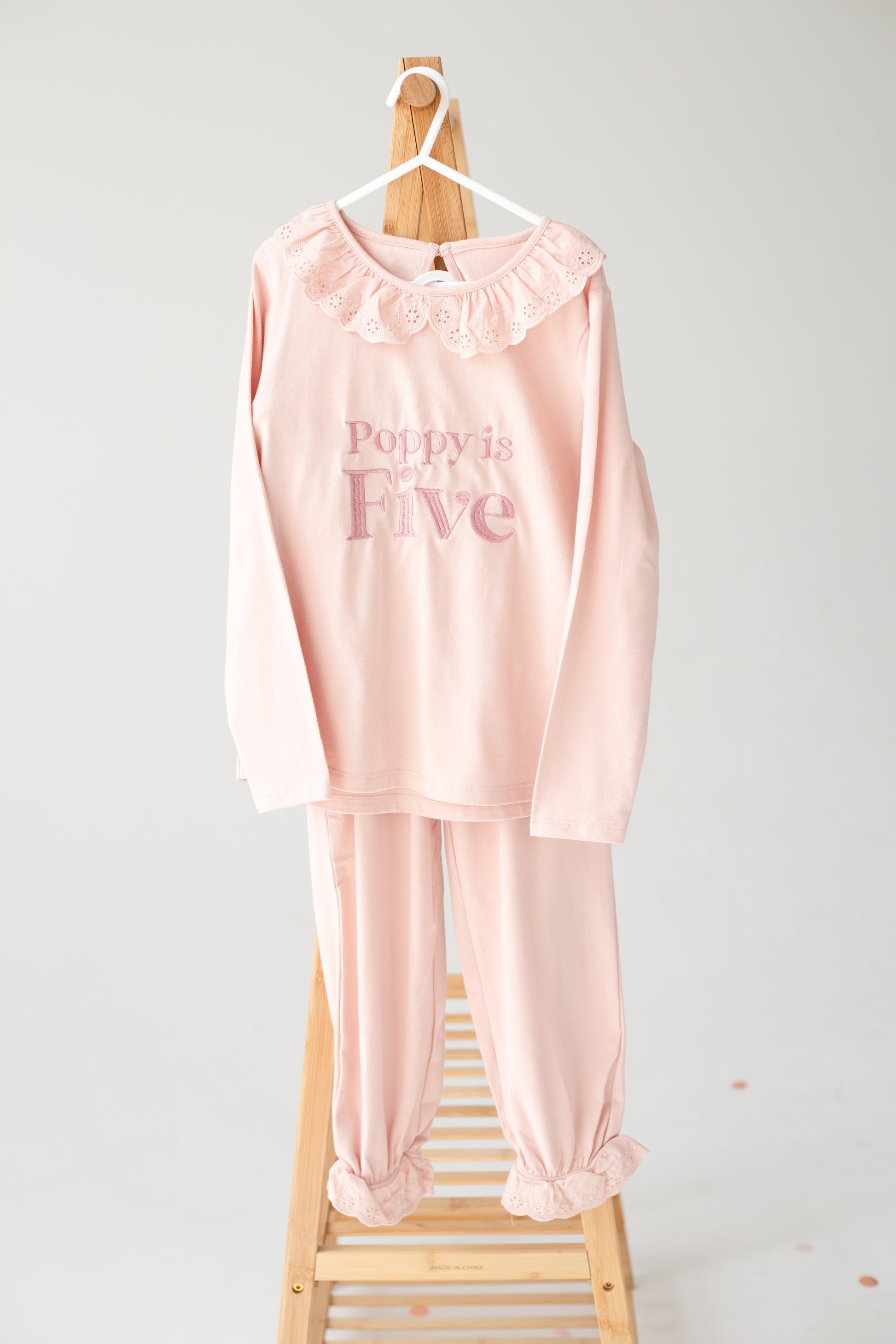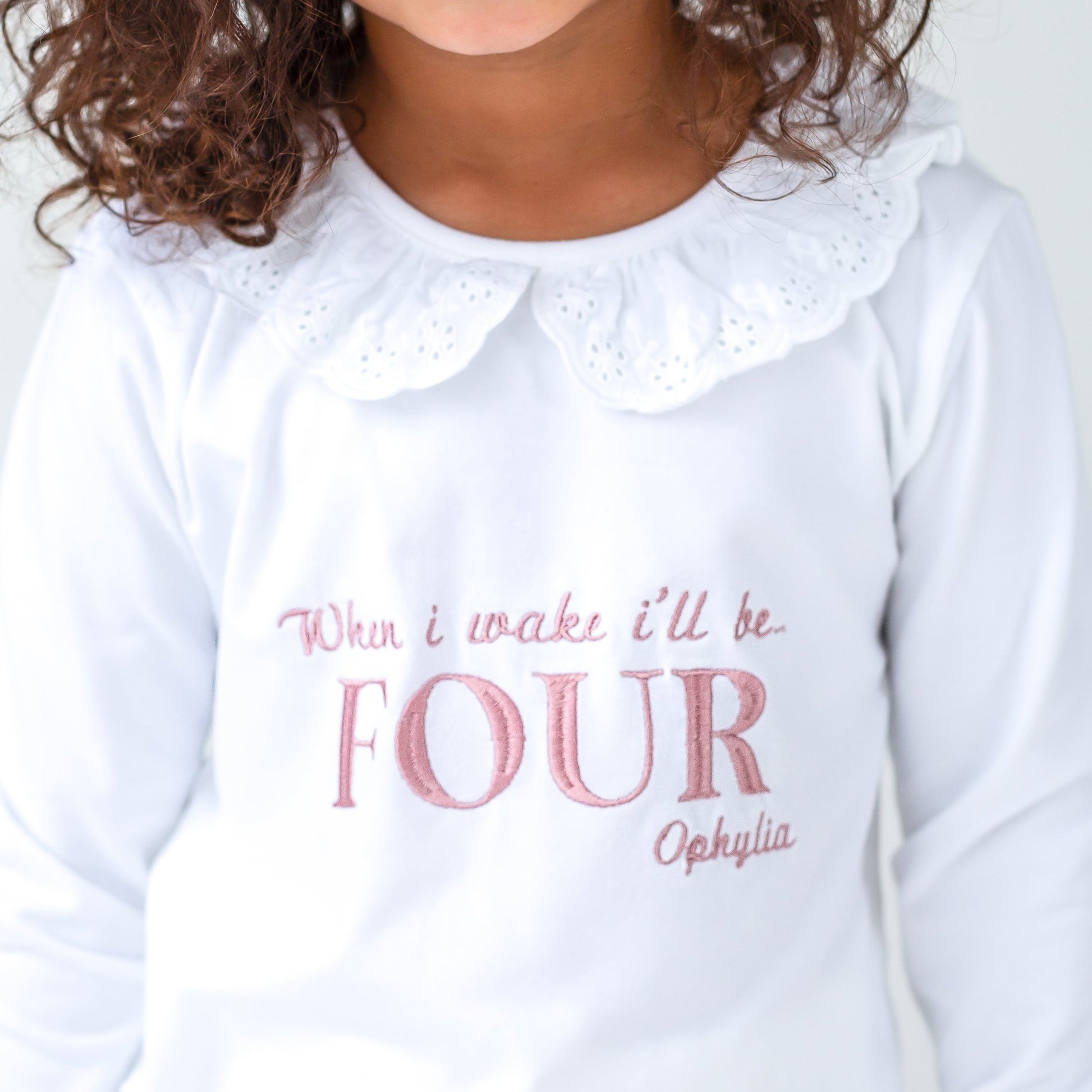 Celebrate milestone moments with our personalised embroidered pyjamas. These have a gorgeous lace frill on the collar along with a frilled cuff on the hem of the trousers. They are a soft jersey fabric quality. Embroidery reads 'When i wake i'll be' along with the child's name in capitals and their name underneath.
