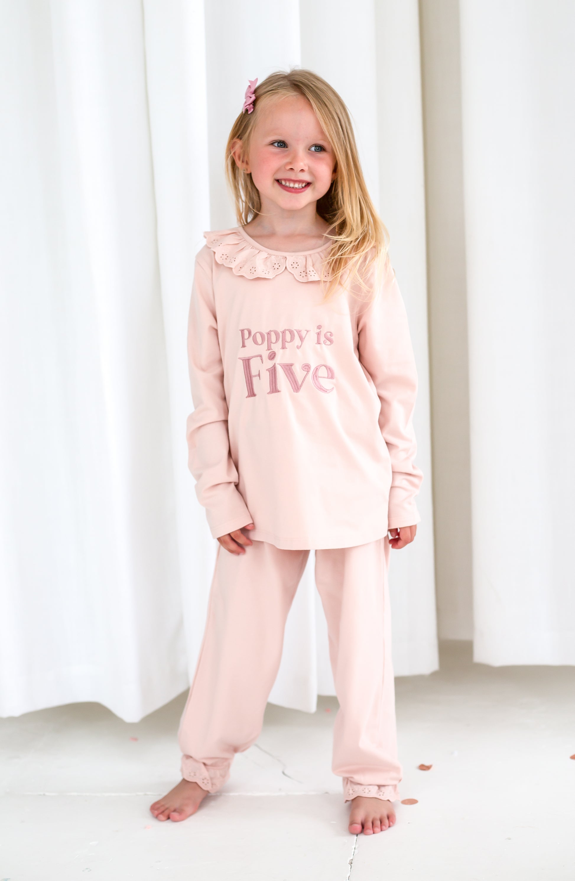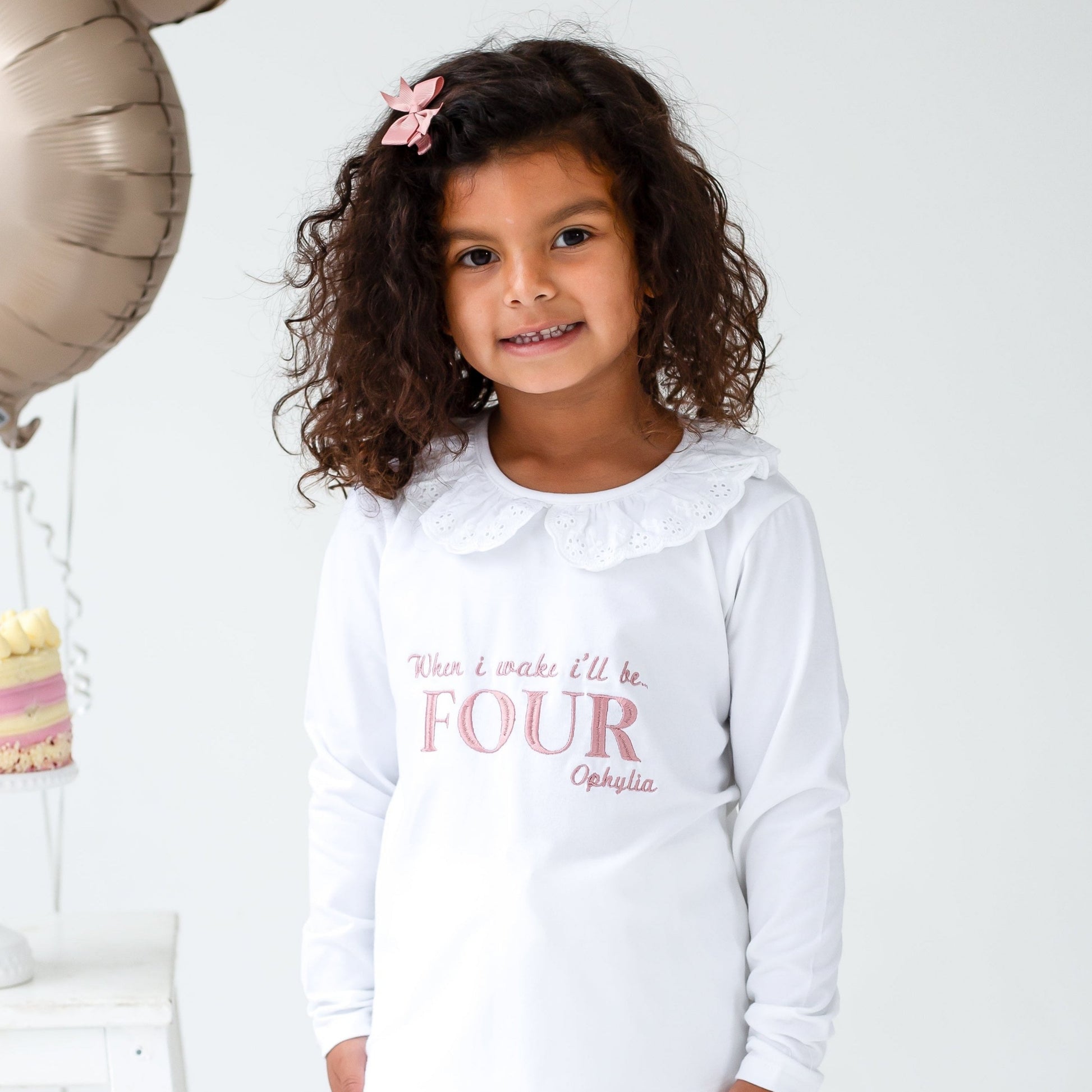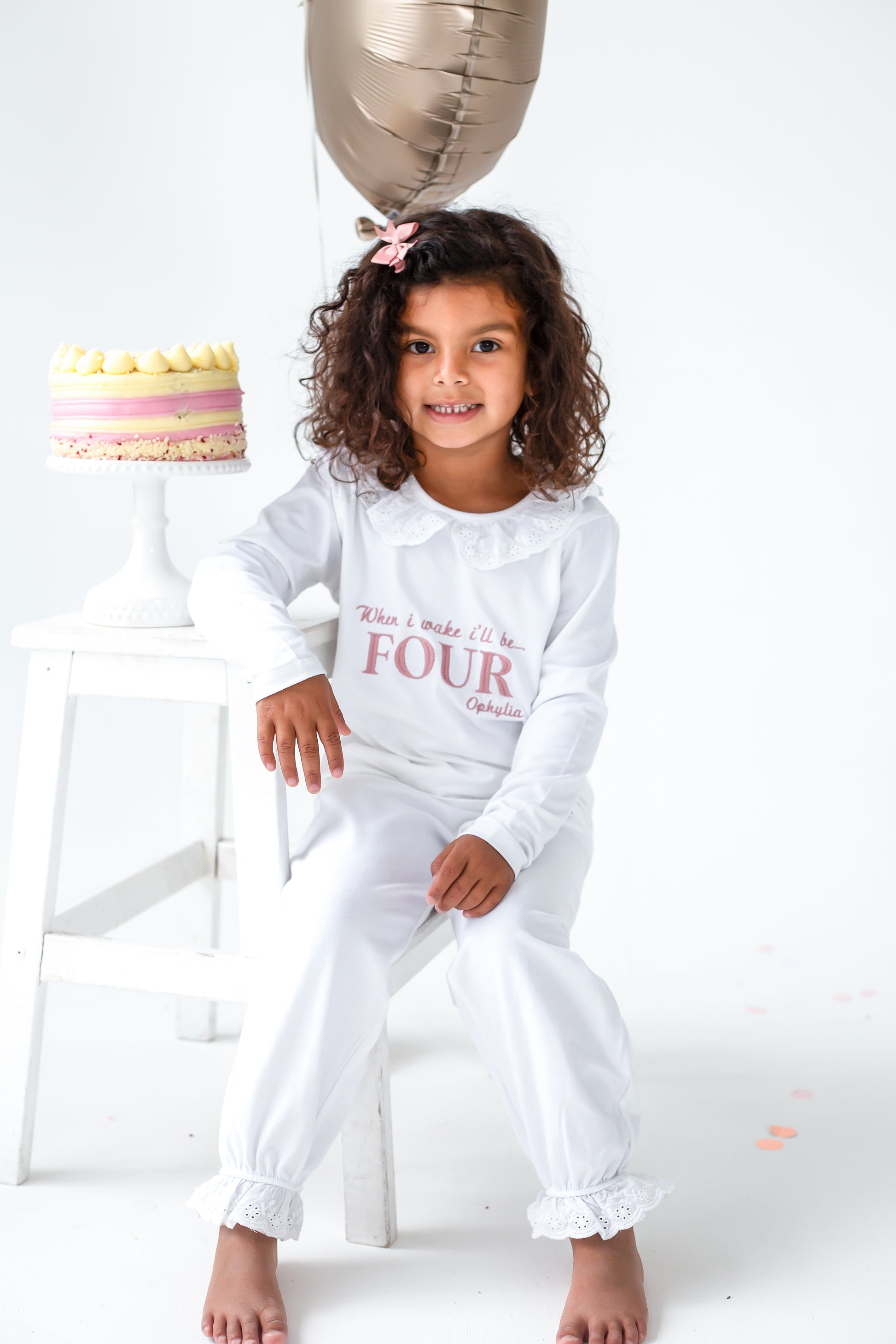 Celebrate milestone moments with our personalised embroidered pyjamas. These have a gorgeous lace frill on the collar along with a frilled cuff on the hem of the trousers. They are a soft jersey fabric quality. Embroidery reads 'When i wake i'll be' along with the child's name in capitals and their name underneath.