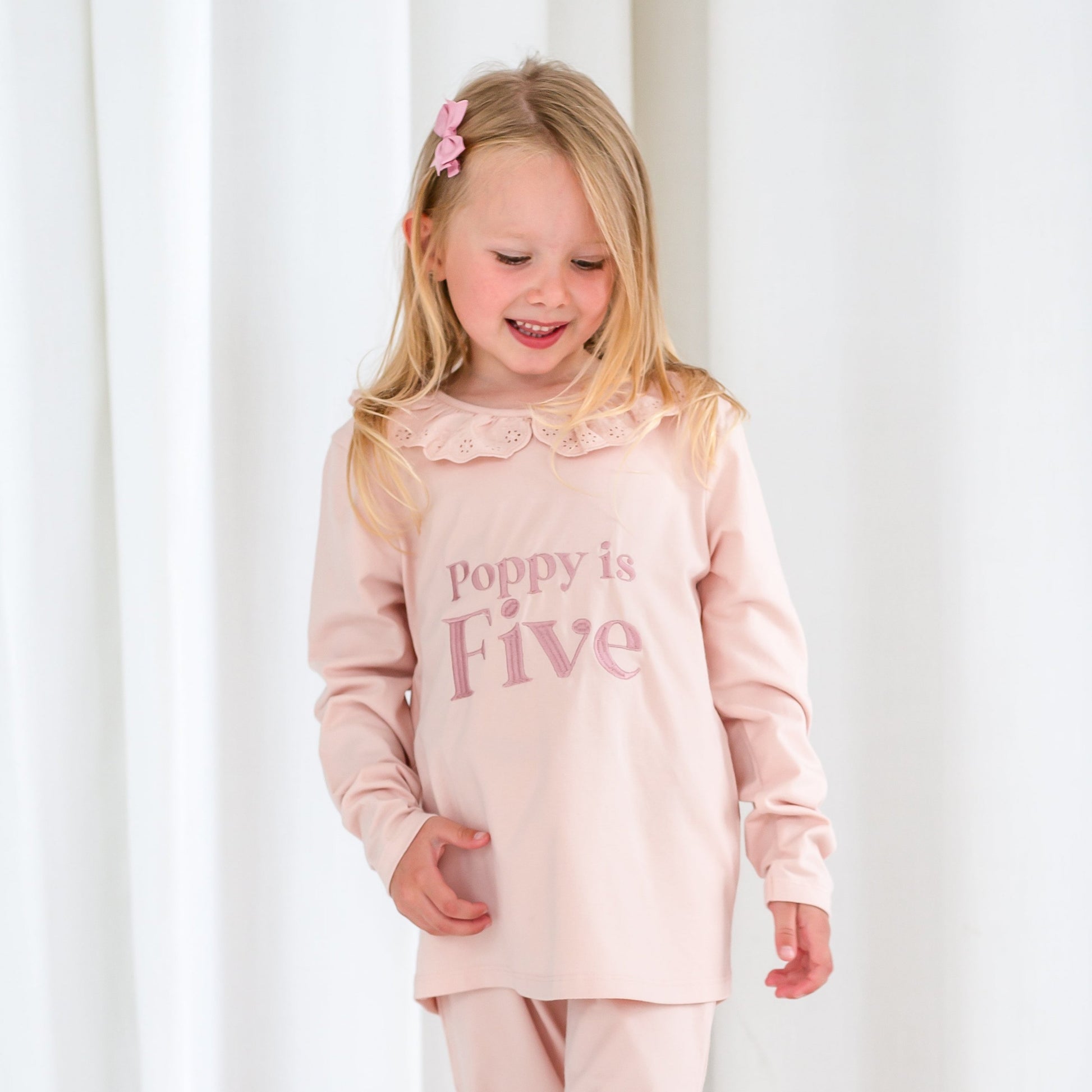 This style is available in pale pink and ivory - personalise your own choice of thread colour. Lead image shows pale pink pyjamas with pink thread. Supporting image shows the ivory colourway also with pink. Soft gold and rose gold make lovely thread choices on the ivory too.