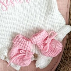 Please select from our spring baby edit colour palette -imagery shows the ivory ruffle edge romper with coral and light pink thread. Aria models the coral and Addison the light pink. Aria wears the soft coral bow to finish the look whilst Addison wears our light pink bow and light pink booties.