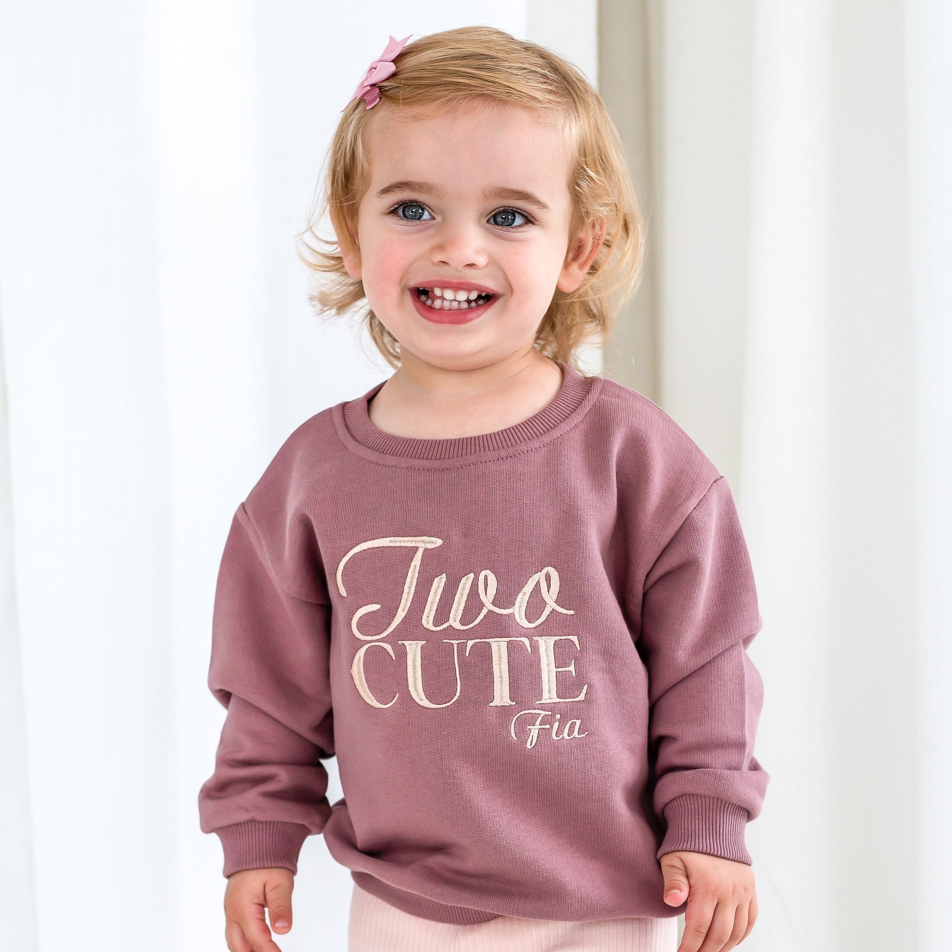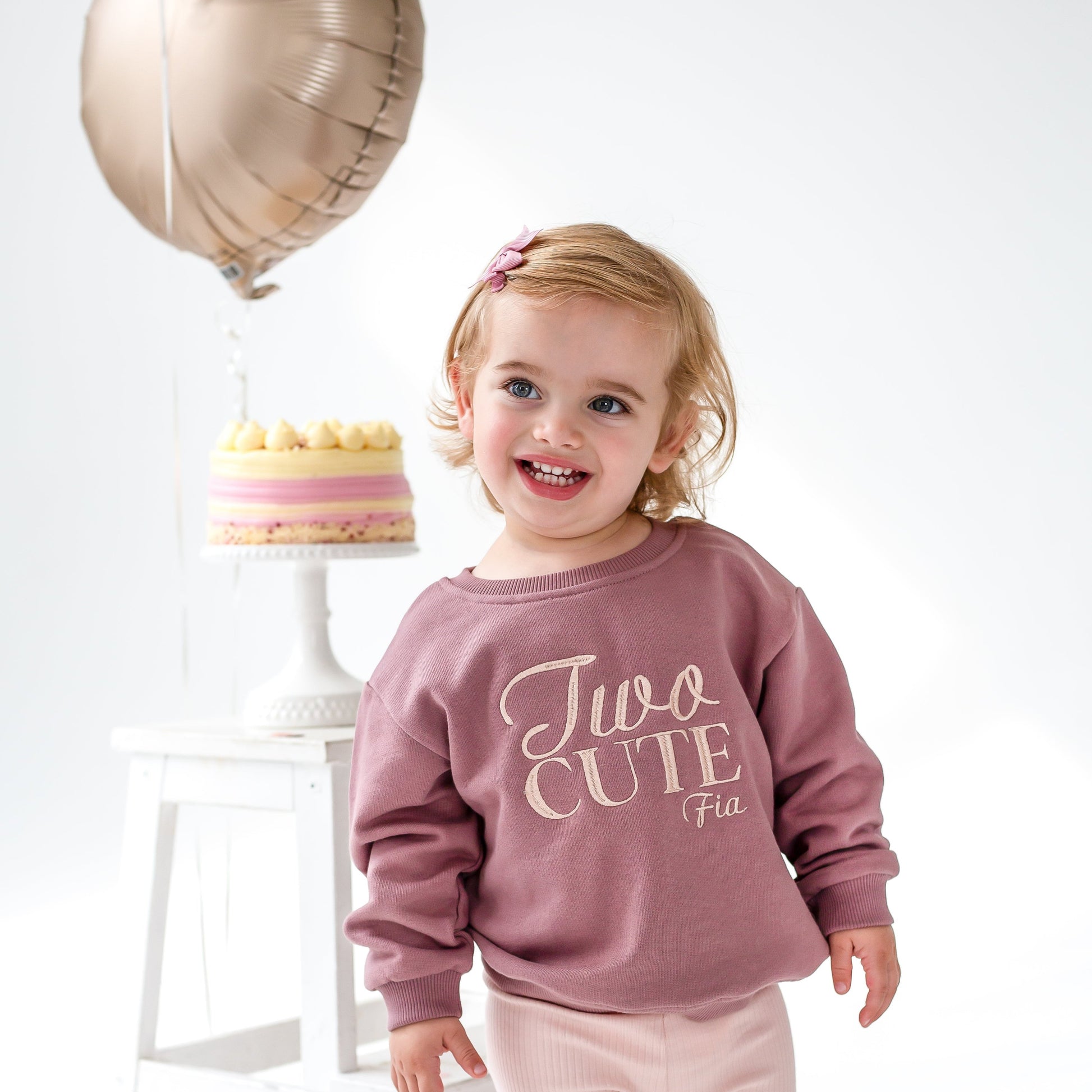Celebrate your child's second birthday in style with this embroidered 'Two Cute' sweatshirt. Image shows dark rose pink with rose gold thread but is also available in a full range of colours and embroidery shades. Please add child's name to personalisation box.